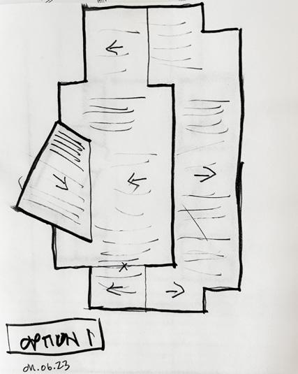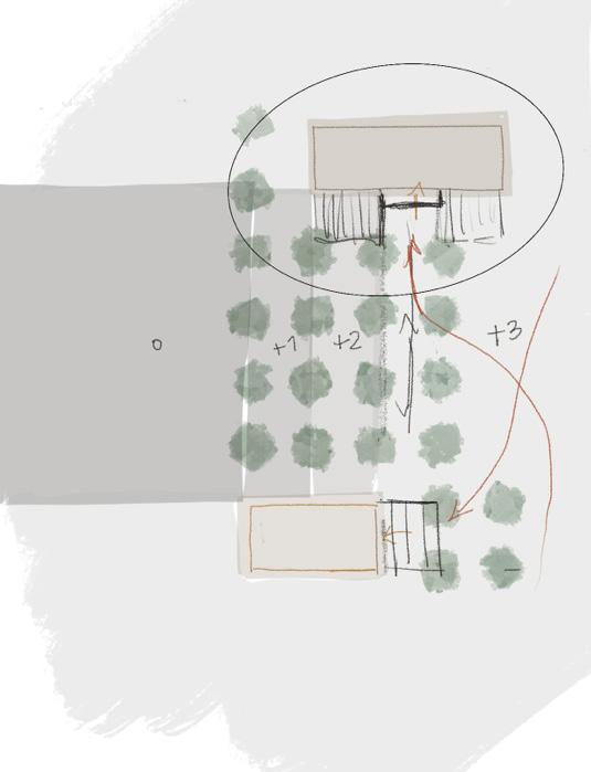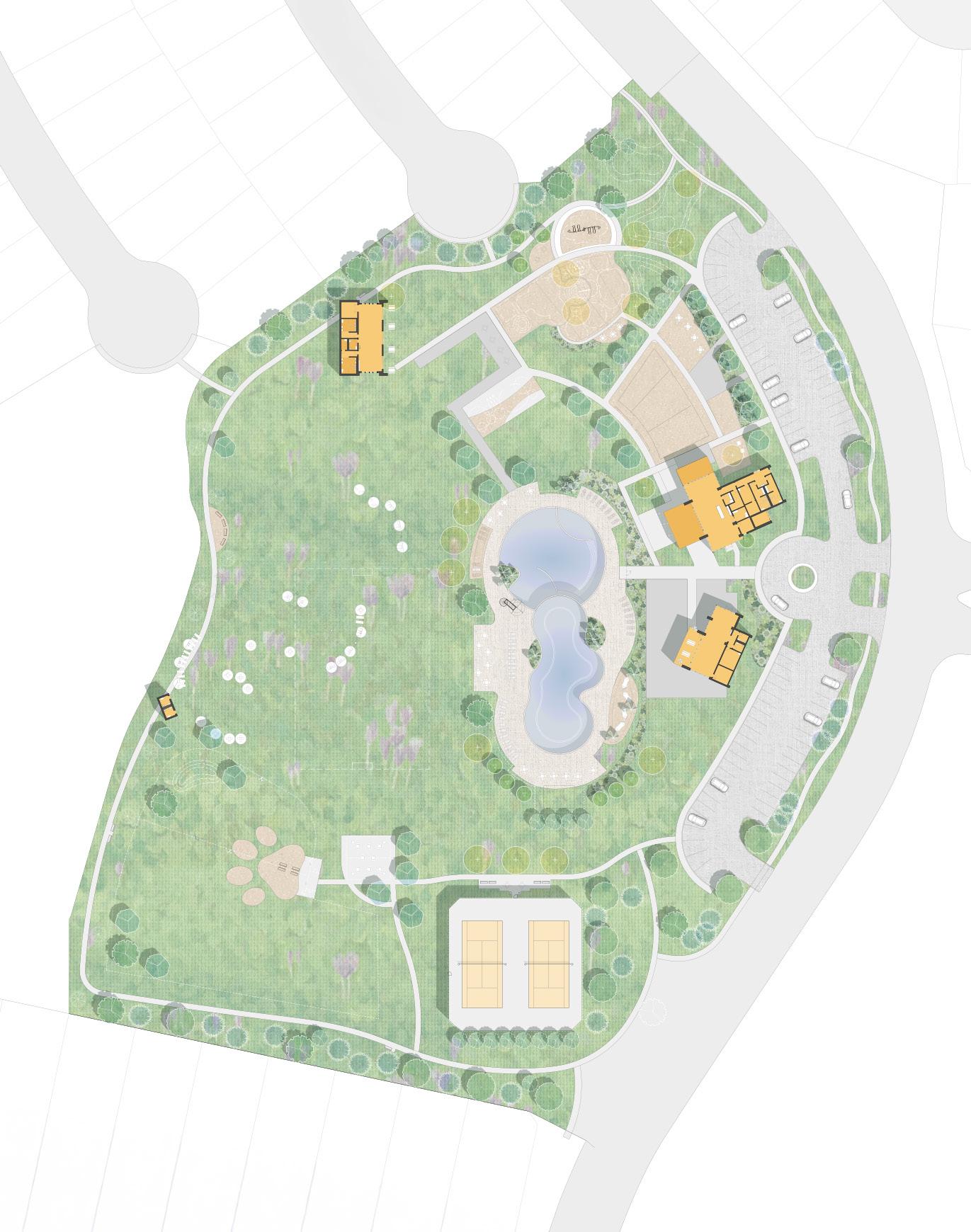 placed between the entry roundabout and the existing lake there would need to be a solution that allows the building to exist in this narrow area but provide the necessary placemaking for the community. The solution takes the form of a bar, bent along a shared radius, split into two parts, and then offset from one another. This allows the building to become immensely more impactful on the site engaging the drop off roundabout area, allowing the space between the buildings to draw people into the amenity area, then on the back side of the building the curved façade looks out to the pool and lake beyond. This broken radial pattern is only further expressed through the landscape and hardscaped areas pulling the concept through.