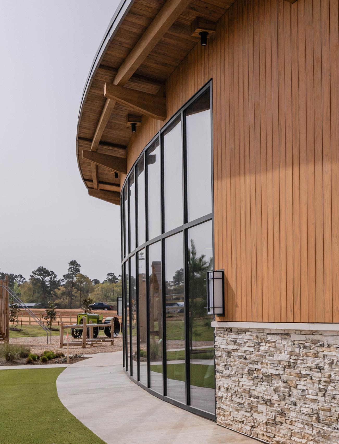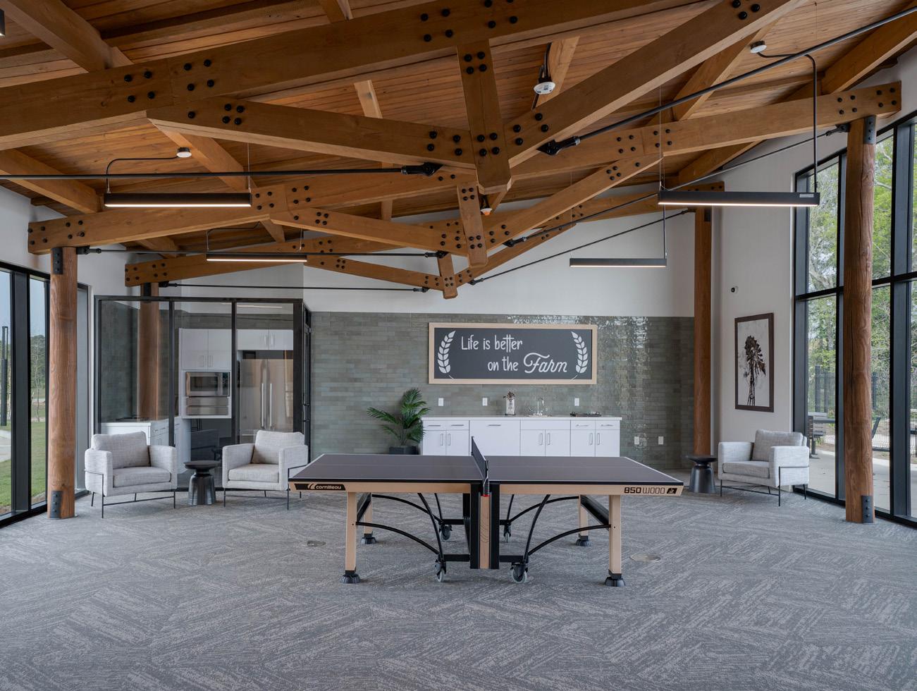 At its core, the Clopton Farms Community Center is all about bringing nature inside. The two wings of the building are tied together by a striking mass timber structure, with exposed tongue-andgroove decking that radiates warmth and authenticity. A breezeway—constructed entirely of mass timber—acts as a welcoming passage, drawing visitors into the heart of the center and its amenities. Massive 12-inch diameter columns stand proudly, reminding everyone of the trees they once were, while the beams and decking overhead recreate the comforting embrace of a forest canopy.