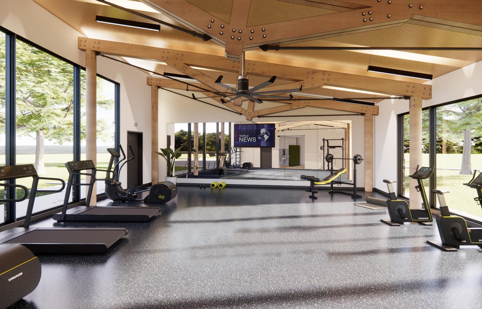 Above: The Fitness Building is designed as a dedicated space for physical wellness, integrating natural light, open-plan interiors, and visual connections to the surrounding landscape to promote an active and balanced lifestyle.
