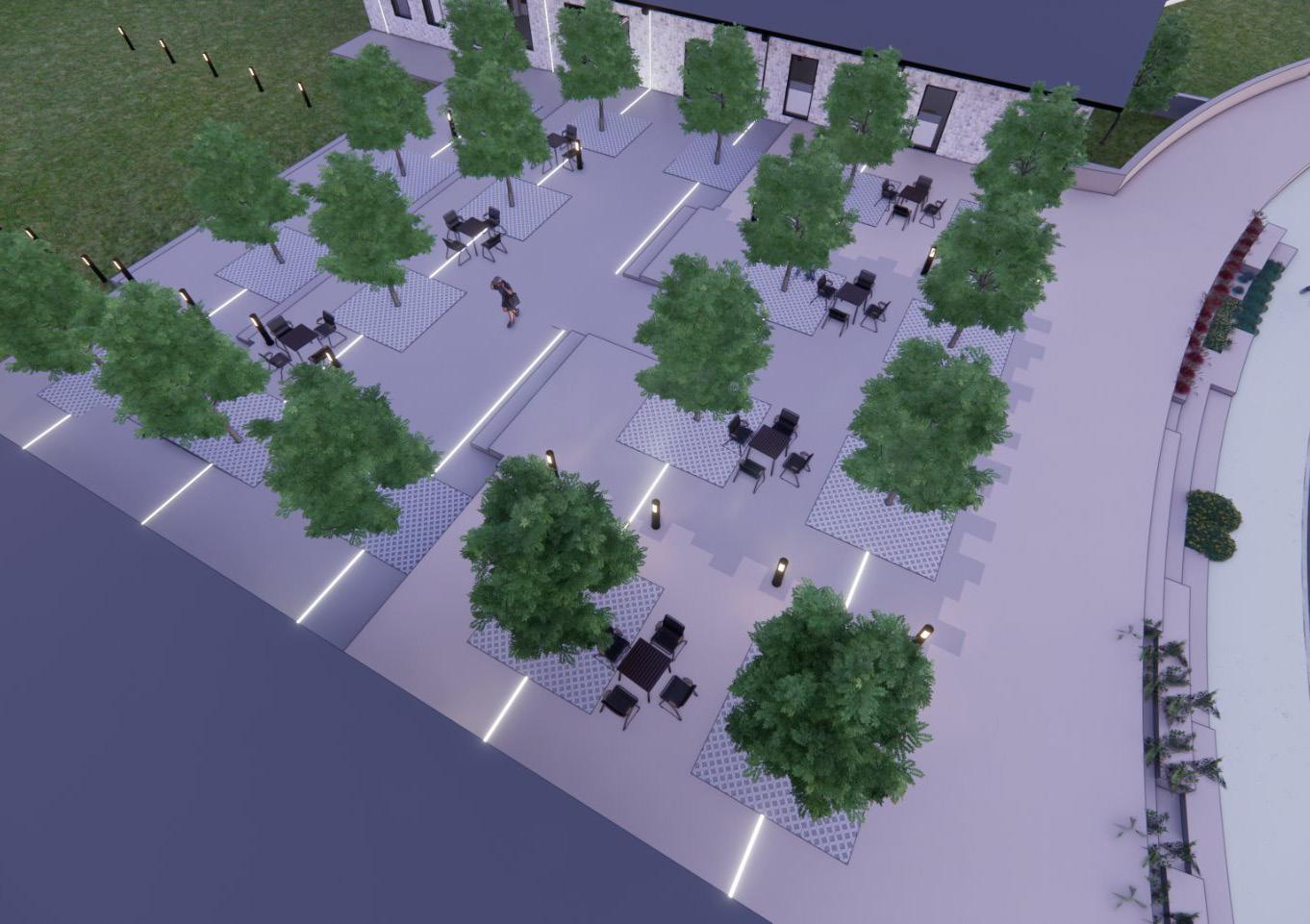 A grid of in-ground lights, strategically placed to align with tree placement and architectural lighting on both buildings, reinforces the rhythm and visual continuity of the site. The lighting tightens the connection between the two buildings, making the plaza feel like an integral part of the experience, whether by day or night.