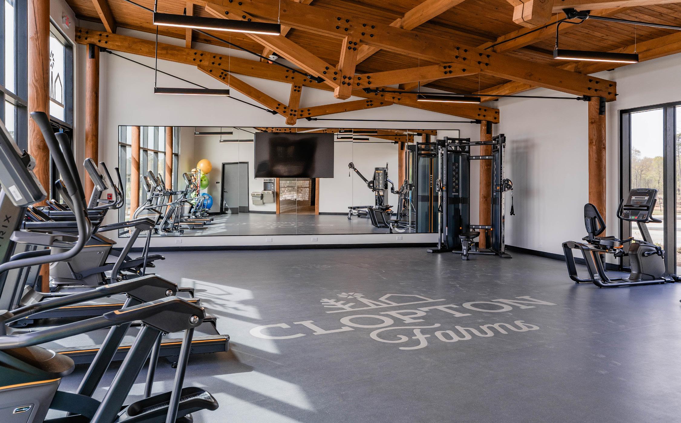 Above: The fitness area gives the community a place to do a variety of workouts while allowing views and natural light out, not only toward the parking area but also through a 14-foot expanse of glass overlooking the landscape and lake beyond.