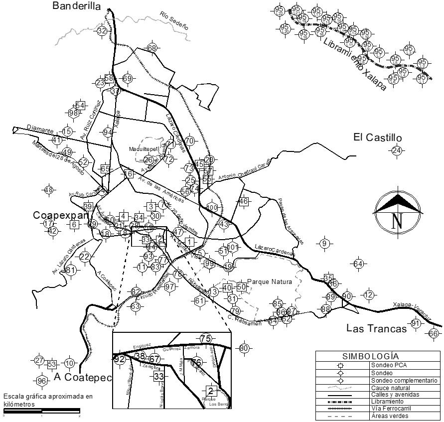 Figura 36. Localización de estudios geotécnicos realizados en la zona urbana y conurbada de Xalapa (Lenz O.)..........................................................................