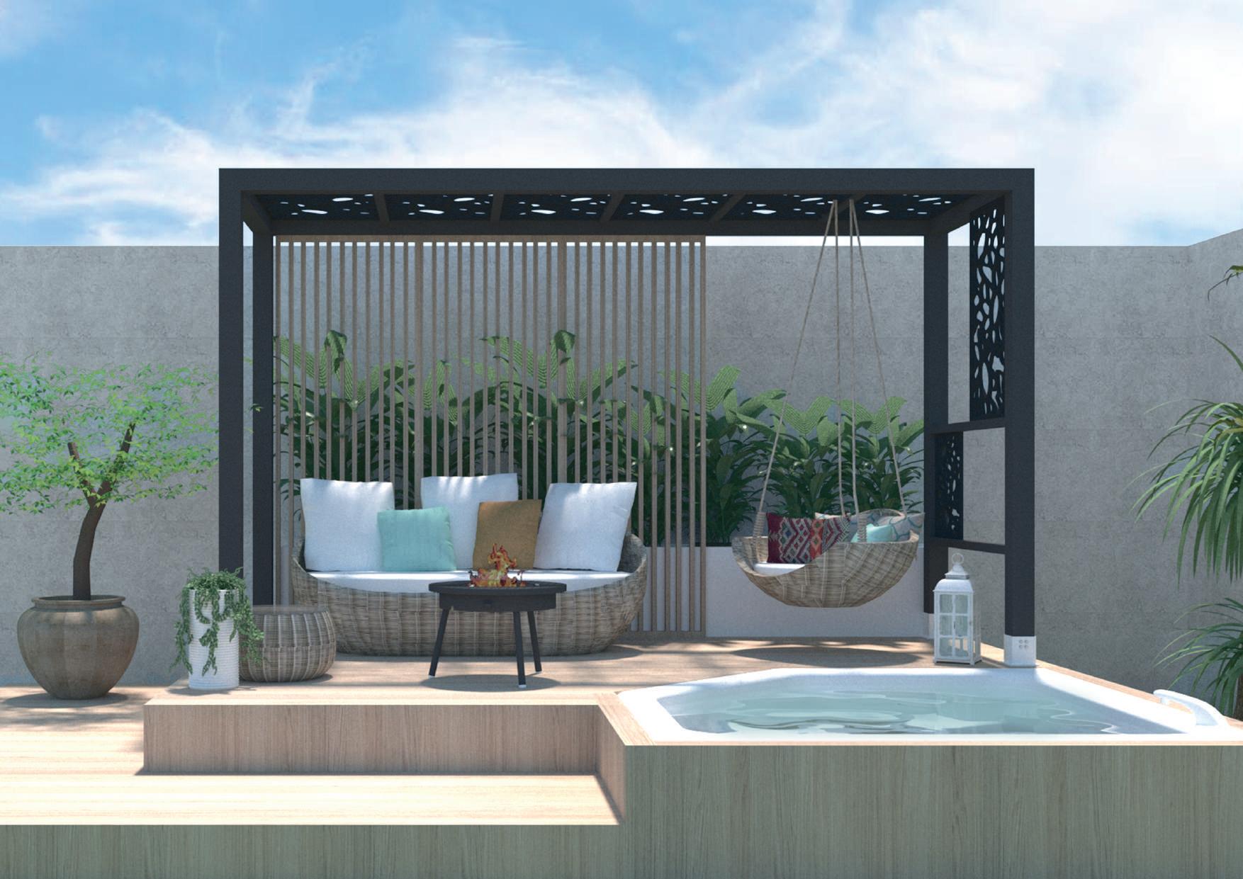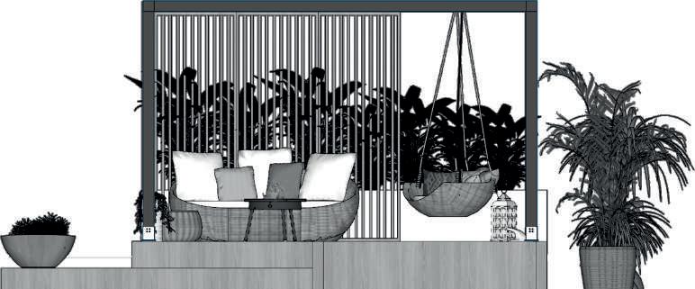 Situada estratégicamente cerca del jacuzzi, esta pérgola cuenta con un techo de celosía que ltra suavemente la luz del sol, simulando ser la sombra de un árbol frondoso, proyectada sobre el agua crea una atmósfera de frescura y la tranquilidad.
