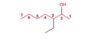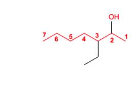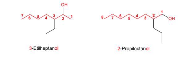 Regla 1. Se elige como cadena principal la de mayor longitud que contenga el grupo -OH y se numera dándole el localizador más bajo. El grupo hidroxilo tiene preferencia sobre cadenas carbonadas, halógenos, dobles y triples enlaces.