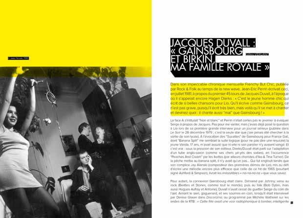 Des dizaines de clichés inédits nous baladent de Bruxelles à New-York, de bars en studios, du punk au glam et, bien sûr, de rencontres fortuites en amitiés. Une jolie galerie de personnages s’affiche ainsi entre ombres et lumières, en couleurs ou en nuances de gris. On y croisera les amis de toujours ou d’un jour. En première ligne, les icône duvaliennes et les incontournables Lio, Marie France et Alain Chamfort, Marc Moulin, Dan Lacksman et Michel Moers du groupe Telex, Jane Birkin et Etienne Daho. Les artistes internationaux (Joan Jett et les Runaways, The Sparks, Chrissie Hynde, April March) y côtoient les presqu’anonymes et les instants surréalistes à la belge (un célèbre footballeur, Alain Bashung, Henri Salvador et même Michael Jackson himself).