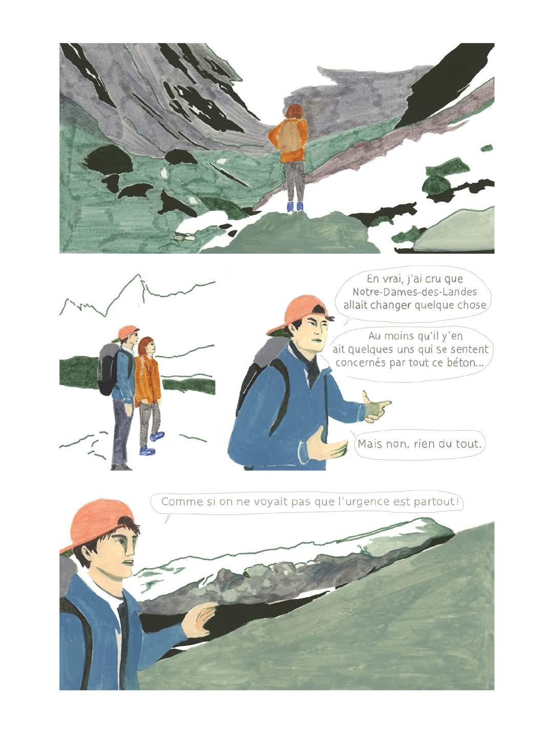 Ensuite par la découverte du campement du Calcaire, une Zone à Défendre imaginée, dont le·a lecteur·e peut passer les portes et accéder aux discussions sur l’organisation d’une vie en communauté. La fiction, loin de tout expliquer, propose des amorces sur des sujets choisis : l’accueil des nouvelleaux, l’importance des symboles, les milles petites choses à apprendre, et ce qu’on laisse derrière soi en rejoignant la lutte. Enfin, les actions coup de poing sont mises de côté pour laisser place à la poésie d’une marche commune. Un temps pour le recueillement.