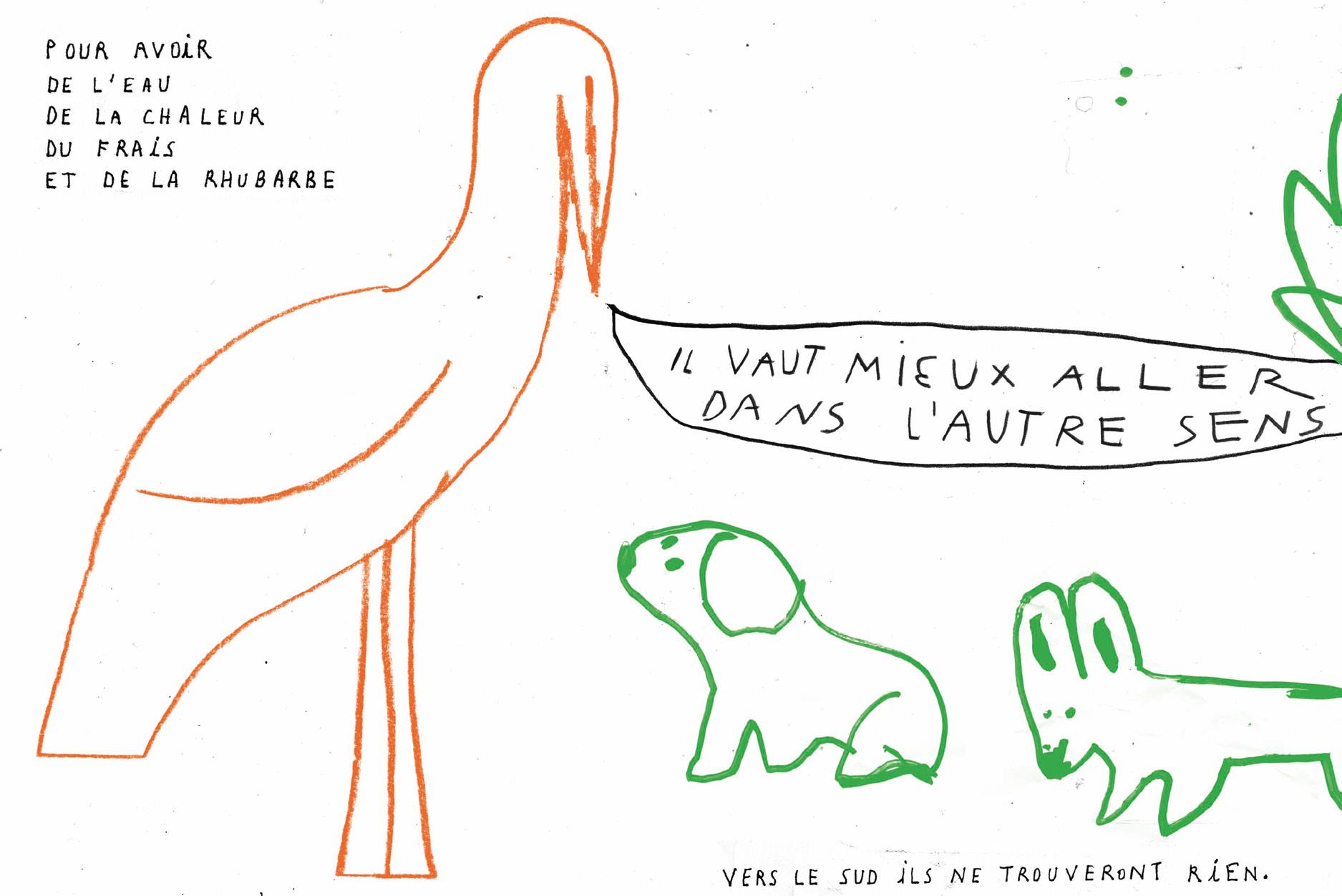 * (publiés initialement en 2002 dans le numéro 33 de la revue Lapin) en font la démonstration éclatante par le dialogue qui s’établit entre les deux personnages (dont un à tête d’oiseau!) de cette histoire de deux pages. Bien que les protagonistes n’échangent qu’une suite de néologismes aussi surprenants qu’abscons, on suit néanmoins leur conversation avec jubilation (« Quand vous me dites un bagnou vaut bien deux flubards, j’ai envie de vous répondre une bougnate apprivoisée fait se pâmer les carlets ! »).