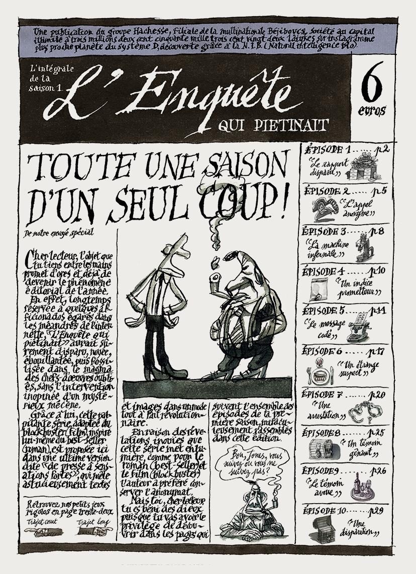 La première saison de L’Enquête qui piétinait se présente donc comme un journal, format 20 Minutes. Cette présentation étant fragile, pour plus de tenue en librairie, le journal est plié dans le sens de la hauteur et cerclé d’un bandeau de papier kraft comportant toutes les informations d’édition (ISBN, prix, code barre, information éditeur et équivalent d’une quatrième de couverture).