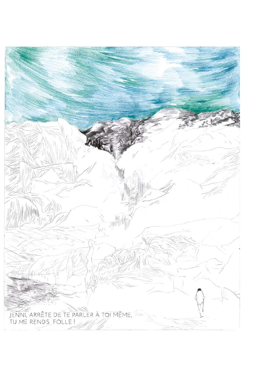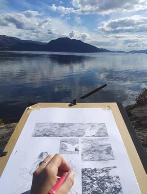 Je consacre un mois à ce projet, en résidence à la KH Messen, à Ålvik, en Norvège. Au bord des fjords ou sur des lacs en haut des montagnes, je cherche la place de mon corps dans le paysage. Du bout de mon crayon j’essaie de lire les falaises et de collecter le paysage. Un paysage que je conçois comme un combat entre les éléments qui le compose : le ciel et le vent, la mer et les rochers.