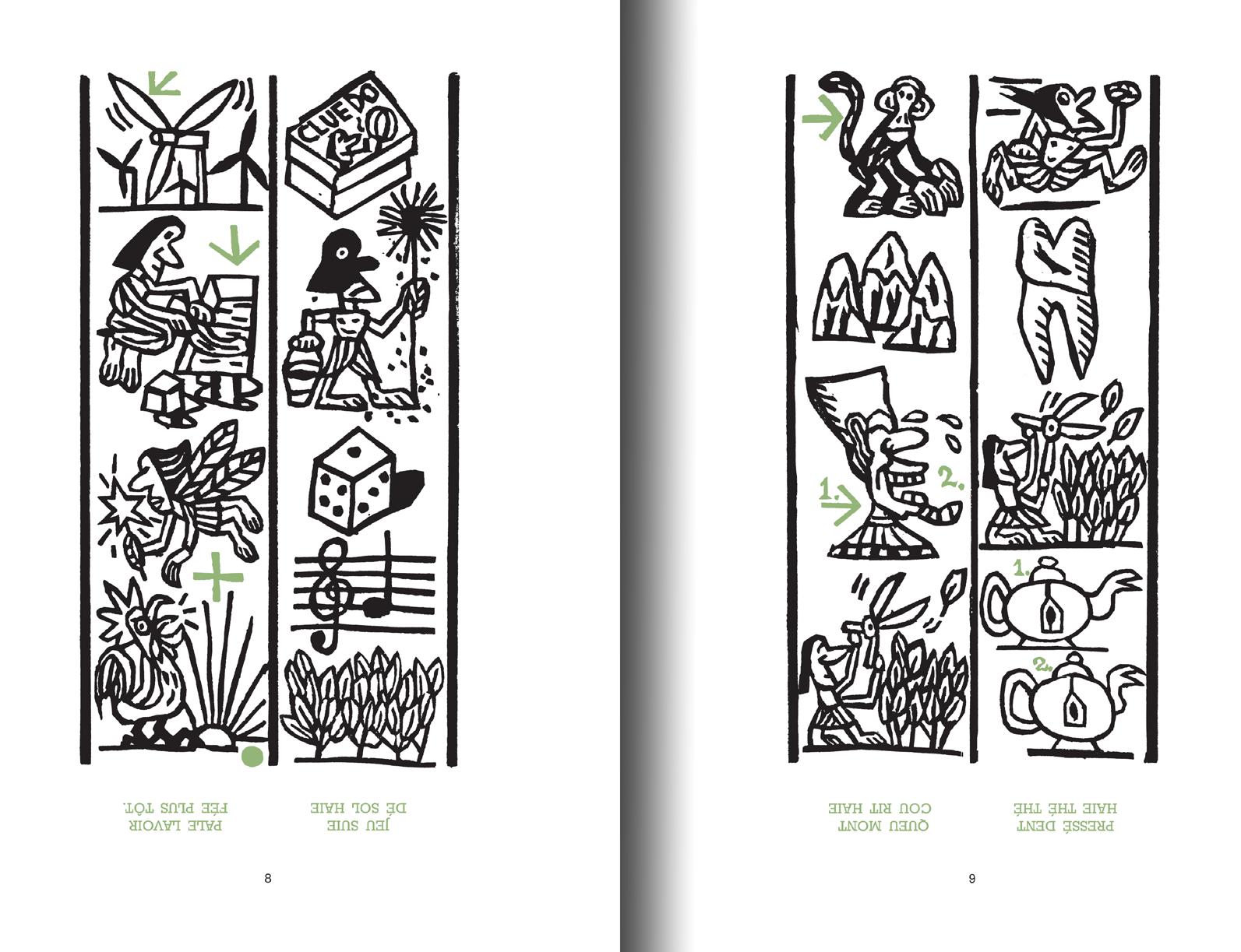 Il y a d’abord la question des mots et du langage. Langues inventées (cf. : Language Protocol), langues étrangères revues et corrigées (cf. : Het vakancie in Greece/Een avantuur van Bob met Bobeeten) ou mots remplacés par une partition musicale approximative (cf. : e précis de bonne éducation du Vicomte B. de Jacquiewsky/ Leçon n°4938 : Carnet de bal), tout ce qui apparaît dans les phylactères doit surprendre, étonner et, si possible, faire