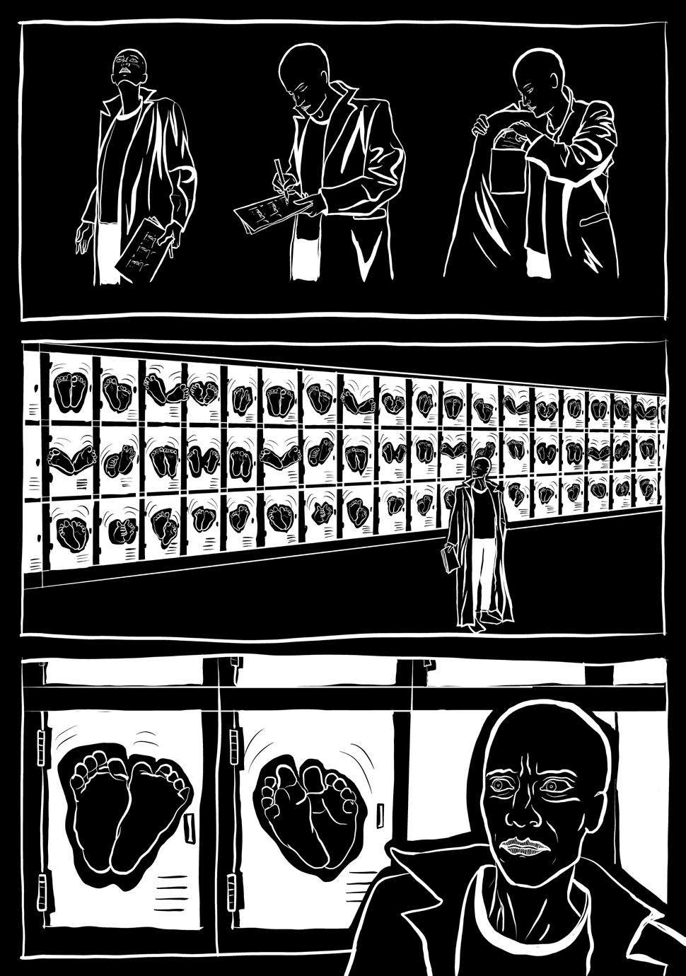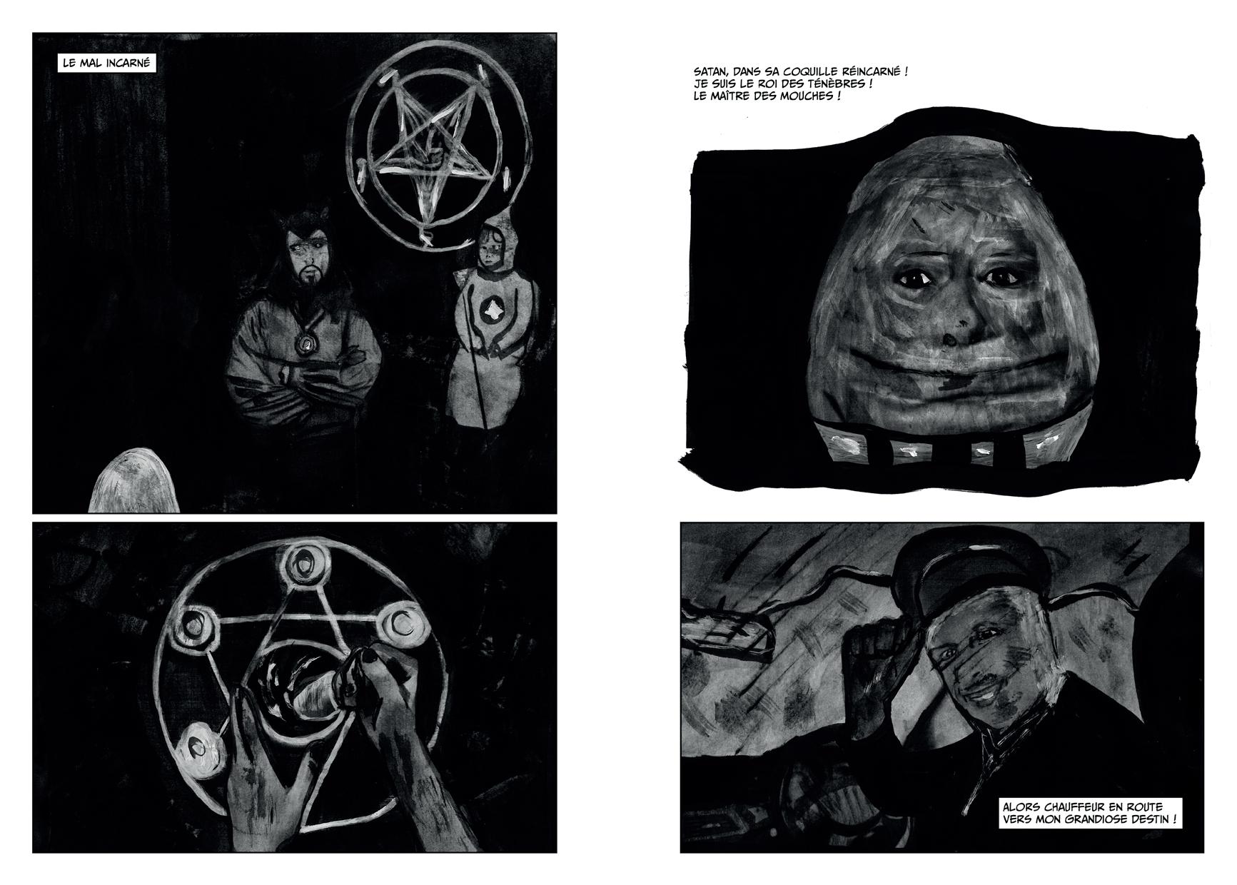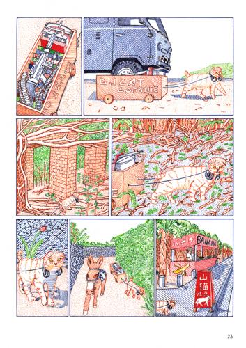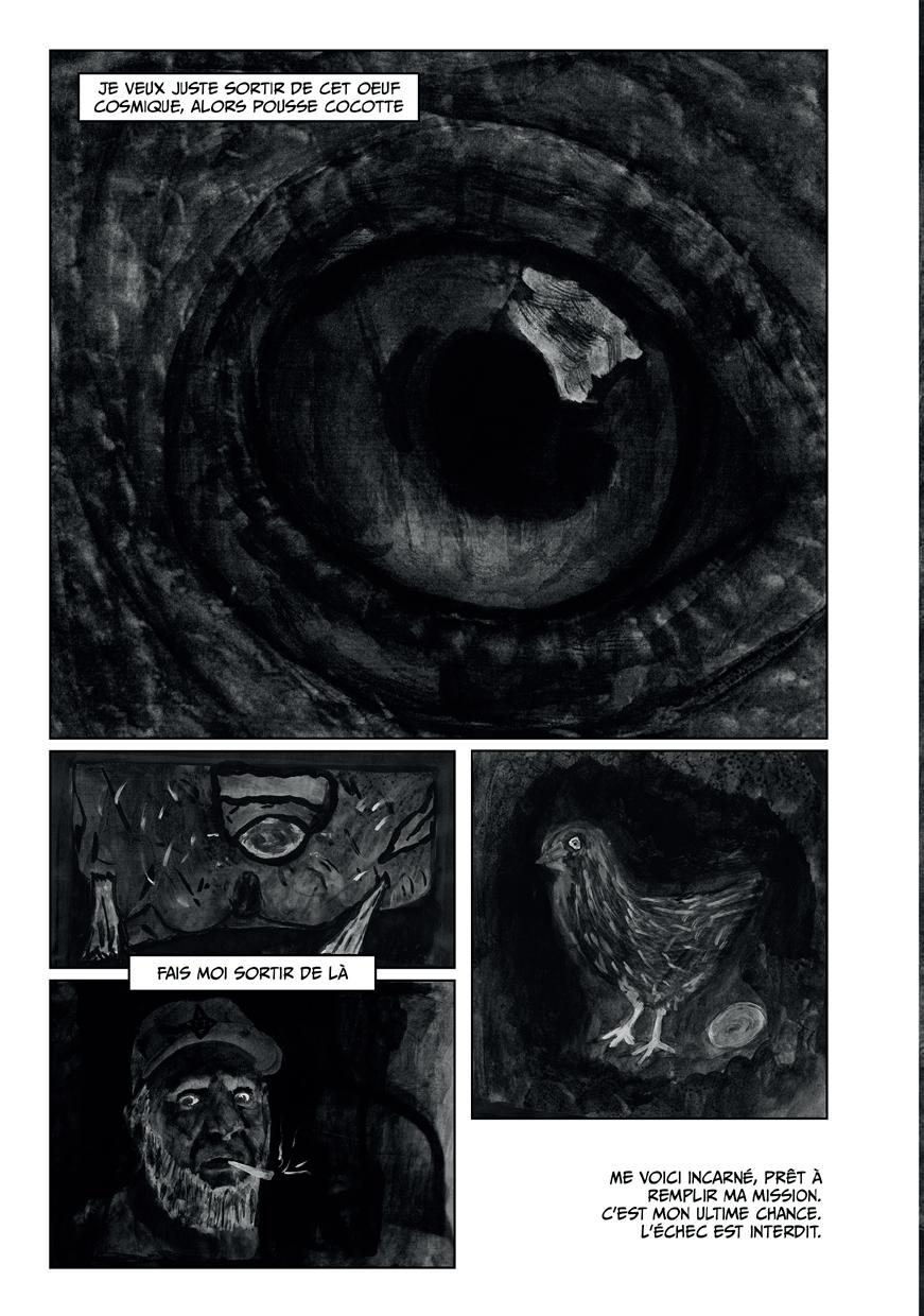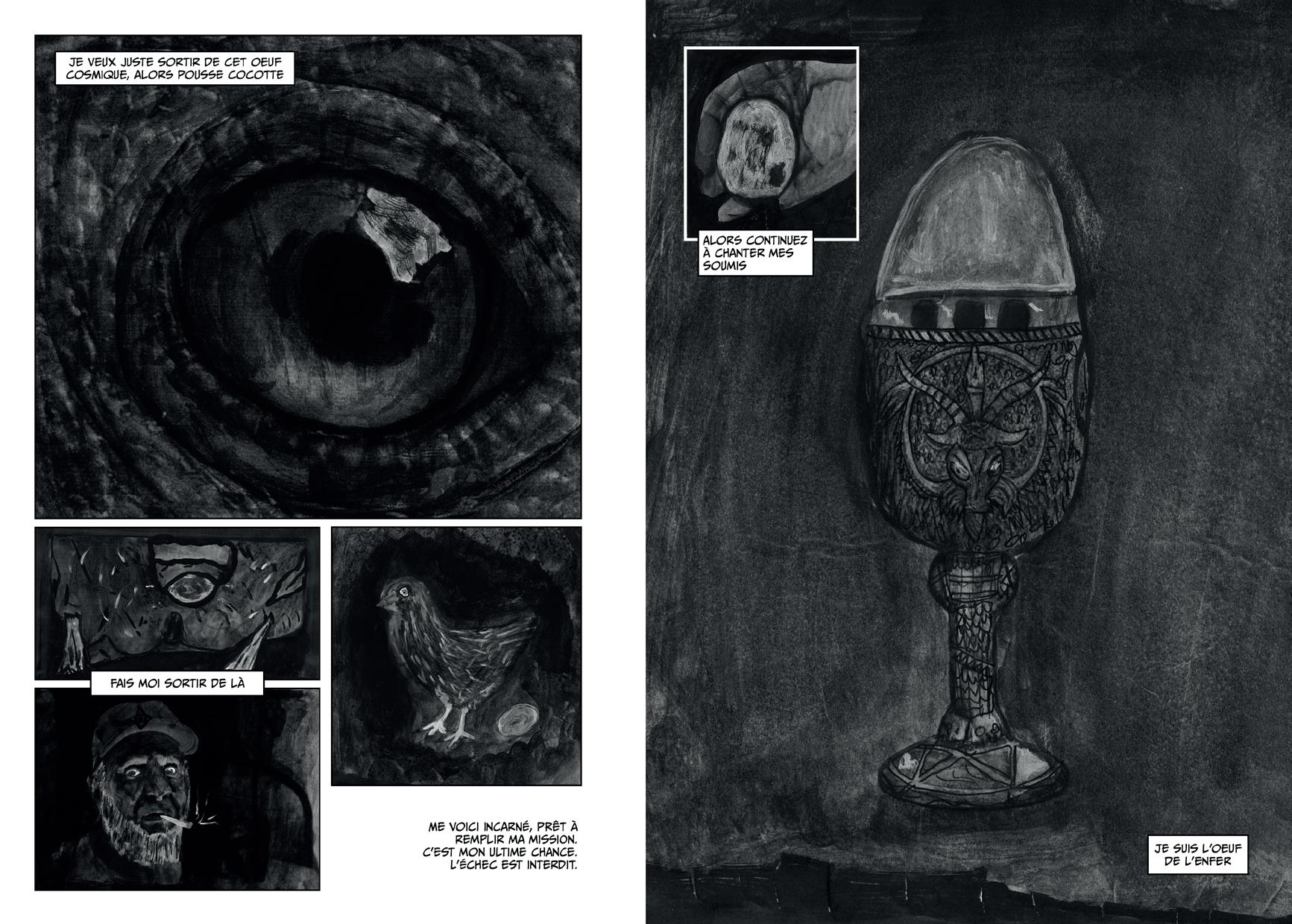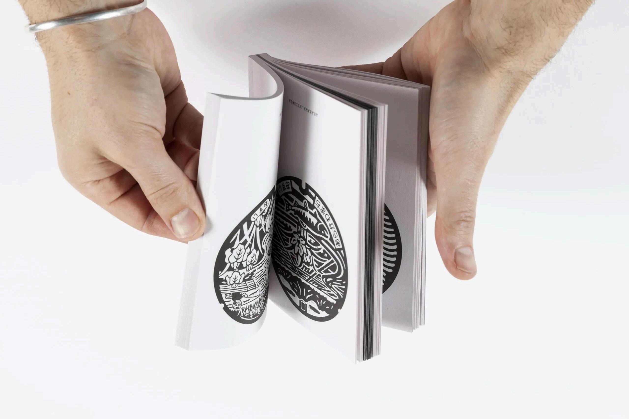 Le livre initiallement prévu en Riso, sera imprimé en offset pour reproduire au plus près les magnifiques planches à l’encre de l’auteur, qui déroule un récit visuel impressionant.
