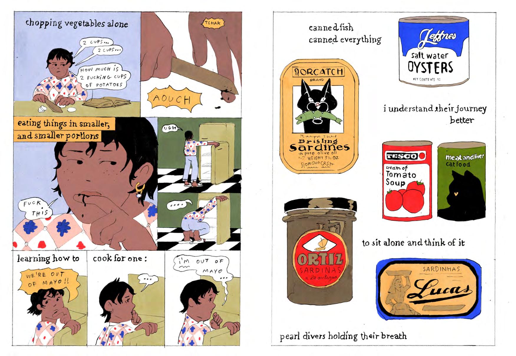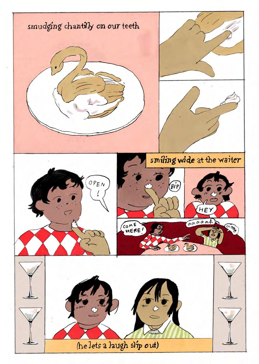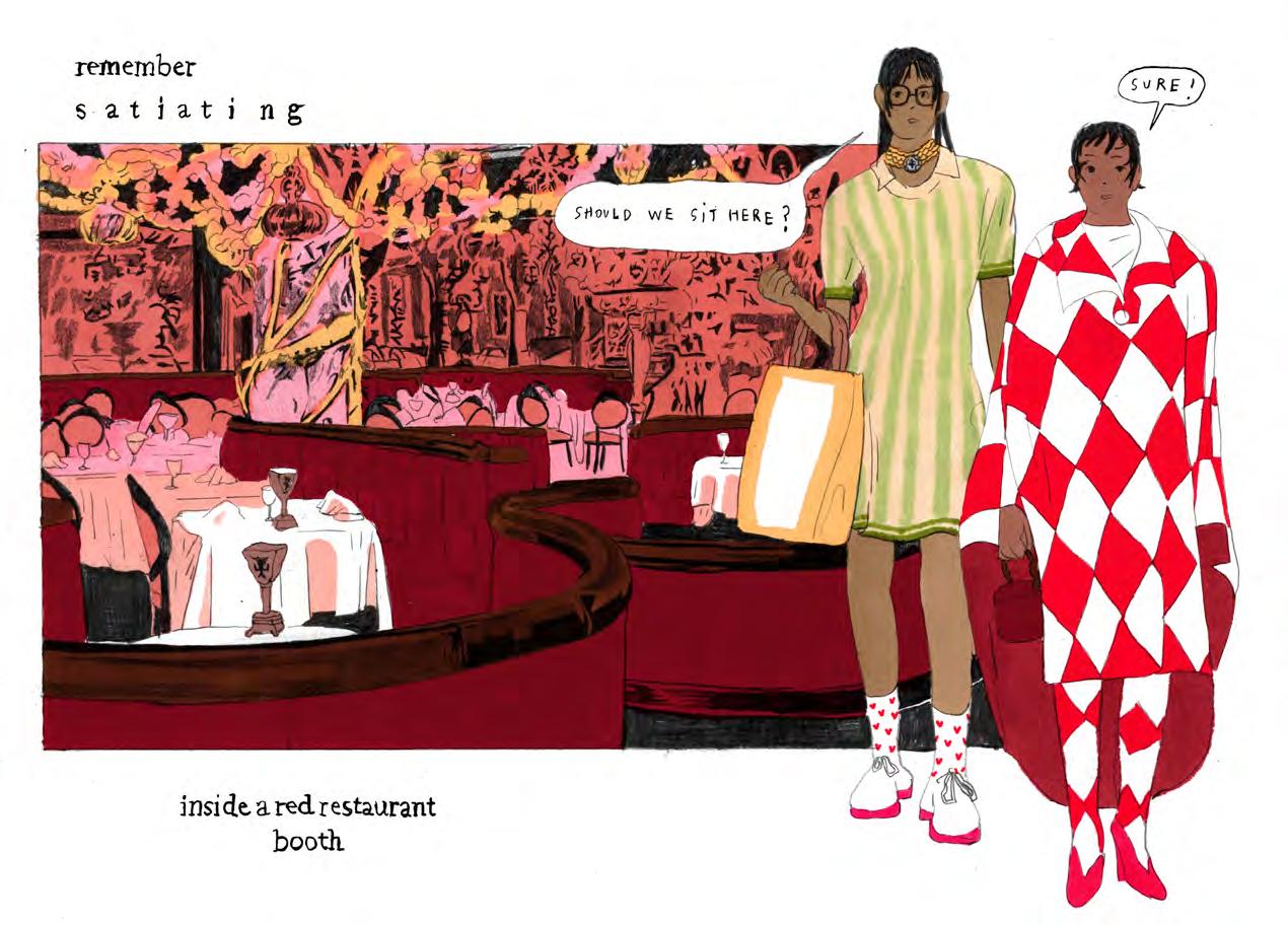 Plat du Jour est une histoire d’amour racontée à travers la nourriture. Plus portée sur le chagrin que sur l’amour et plus sur les ballonnements que sur la nourriture, la première collaboration entre Melek Zertal et Christina Svenson affirme la magie des petites erreurs. Apprendre à nouer les queues des cerises en noyant ses larmes dans un verre, observer la Voie lactée depuis une stationservice, jeter un emballage de chocolat qui reflète un visage familier… Tant de situations qui nous font nous rappeler : Le plat du jour sera différent demain.