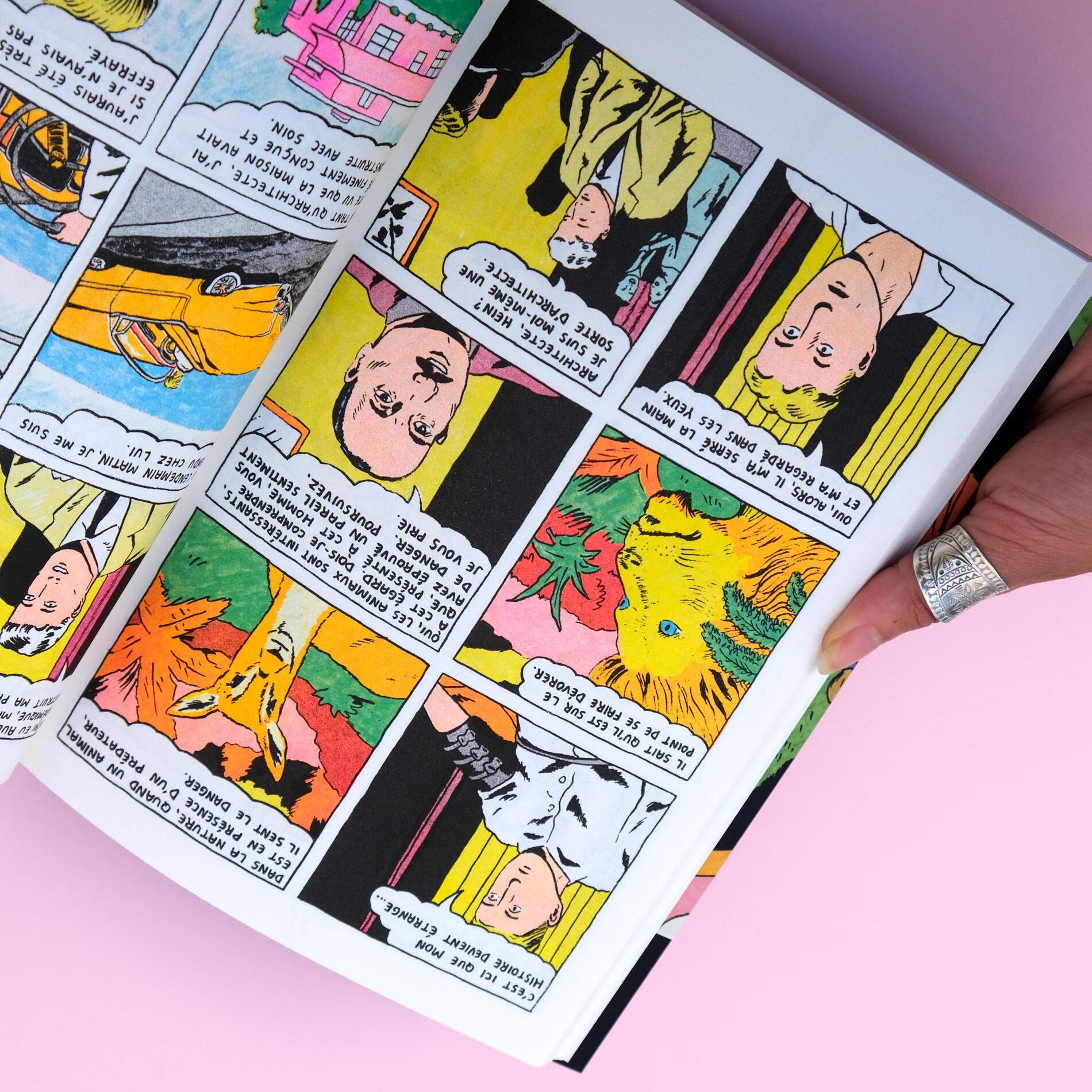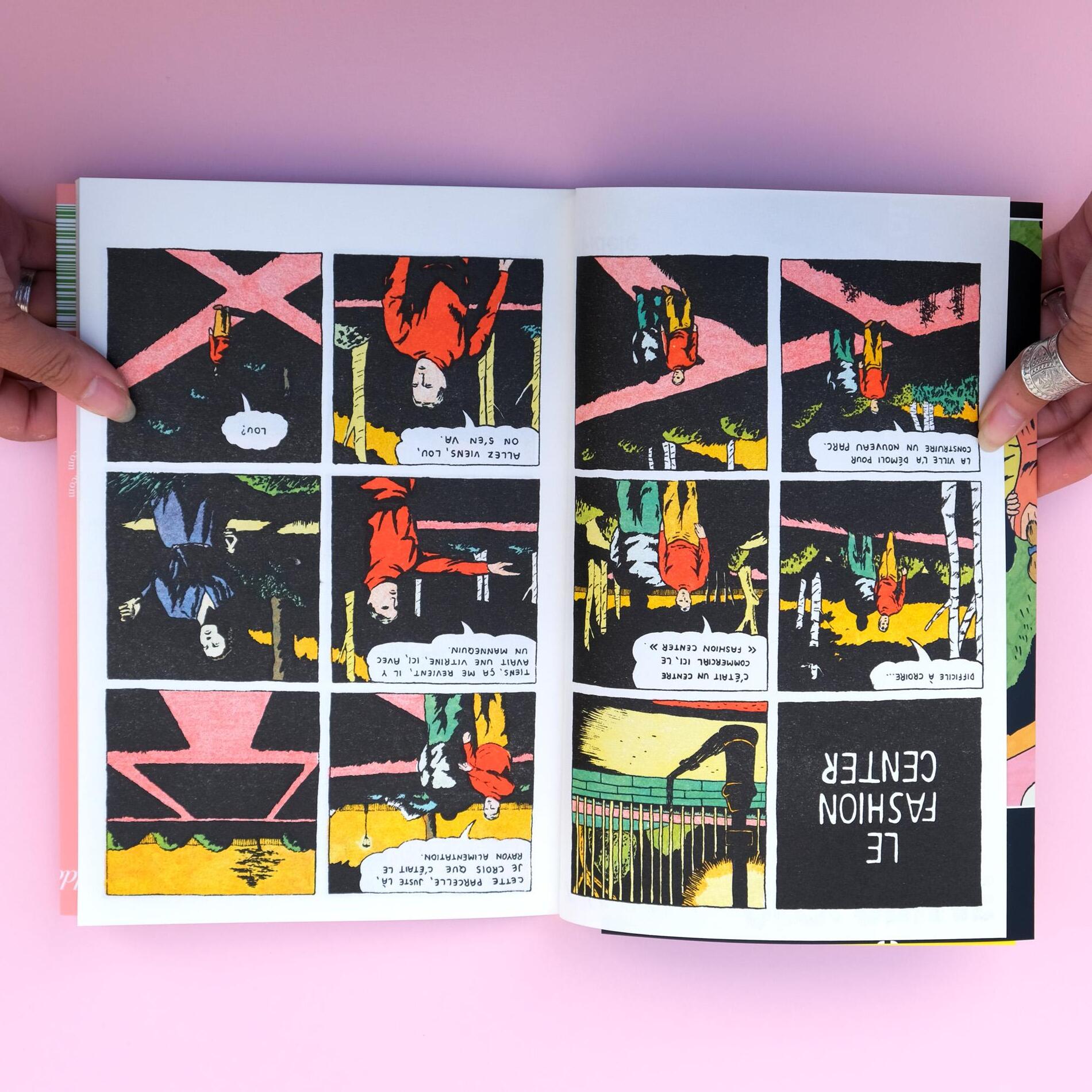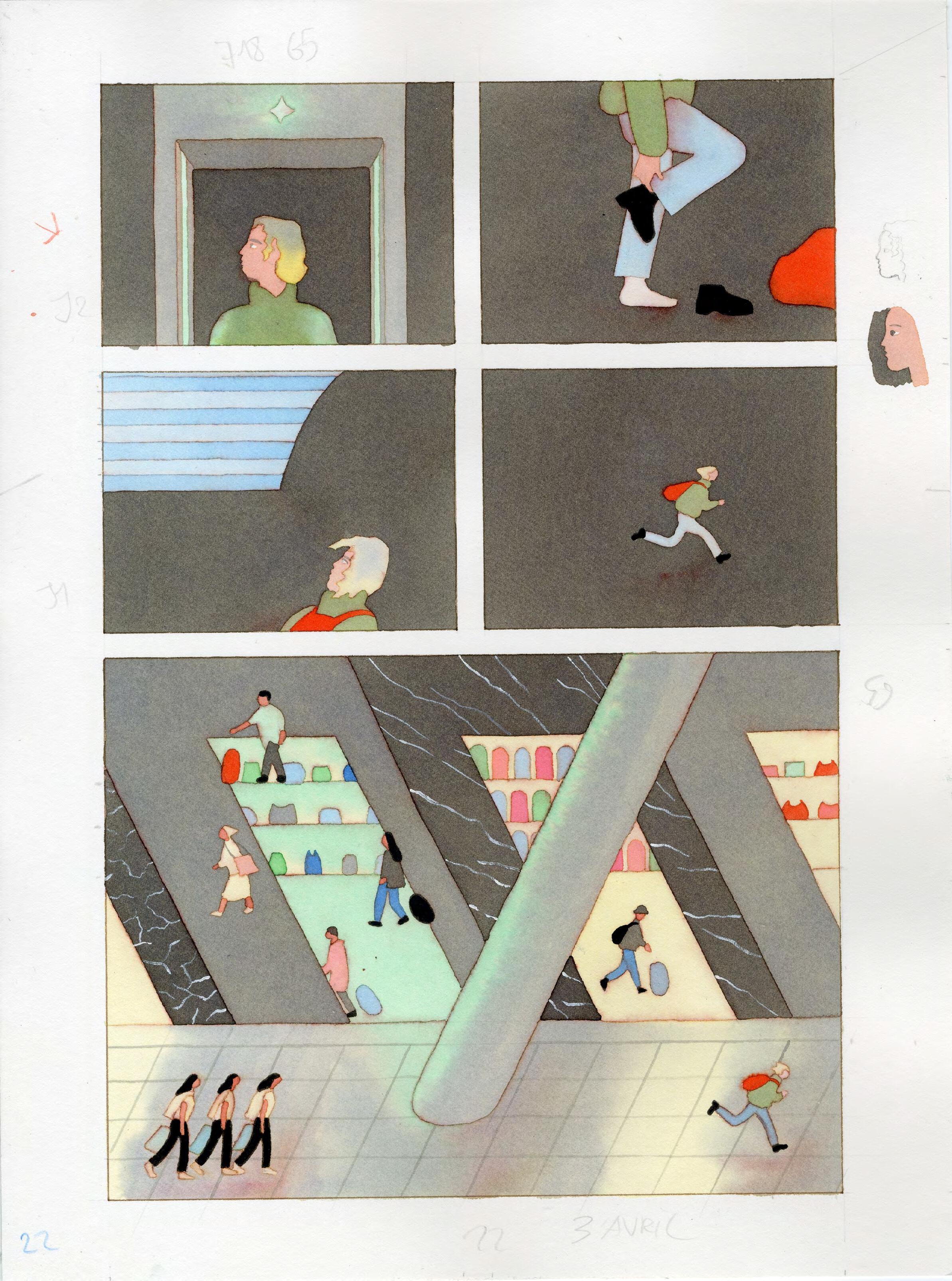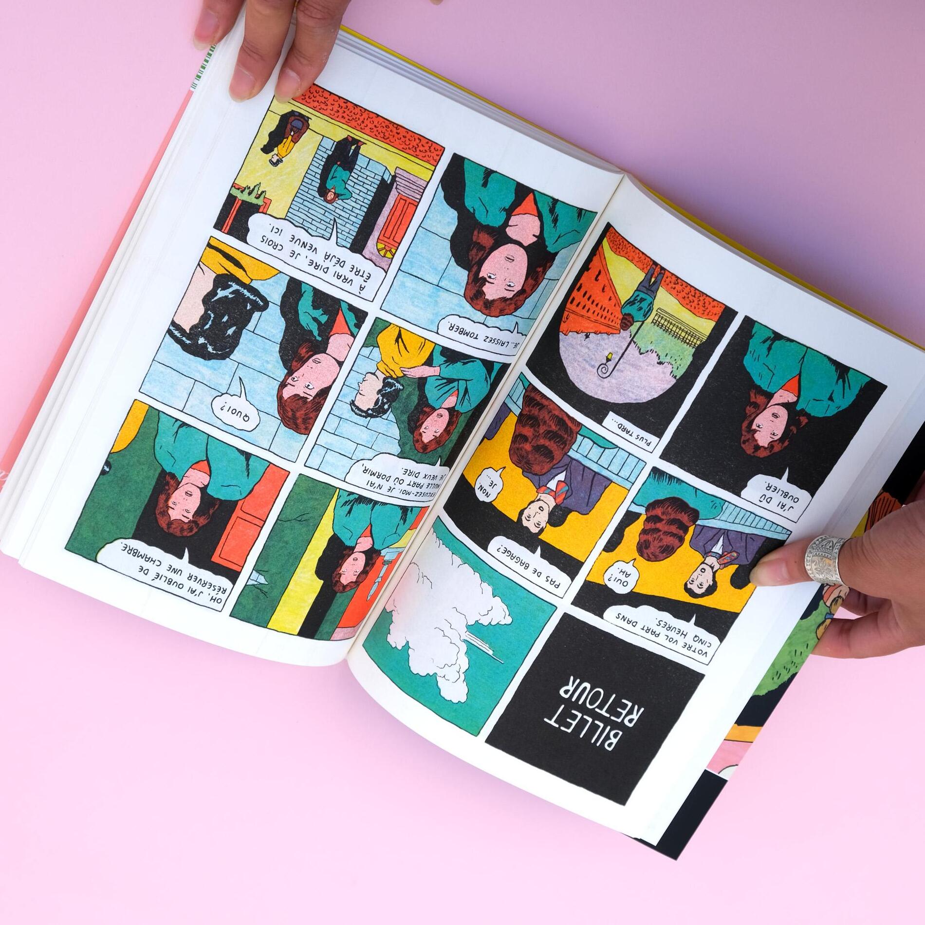 Le 27 février 2023, André et une équipe de l’aéroport CDG à Paris nous attendent sur le tarmac à la sortie de l’avion. Nous allons passer la journée à déambuler dans l’aéroport, derrière les barrières, entre les avions qui roulent jusqu’aux pistes et dans les salons privés. De cette immersion, André capte les zones qui correspondent à sa vision universelle de l’aéroport. Une zone coupée du monde et internationale, qui sera le théâtre de deux histoires drôles et sensibles travaillées à l’encre. Les couleurs vives explosent au milieu des grands aplats gris, comme les annonces et les indications dans ce grand aéroport de ciment.