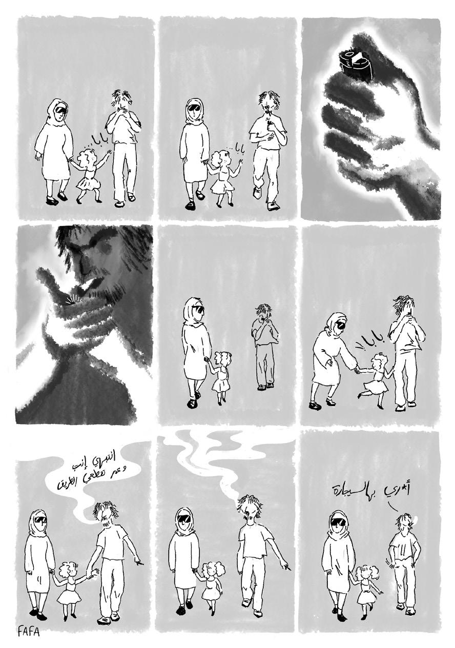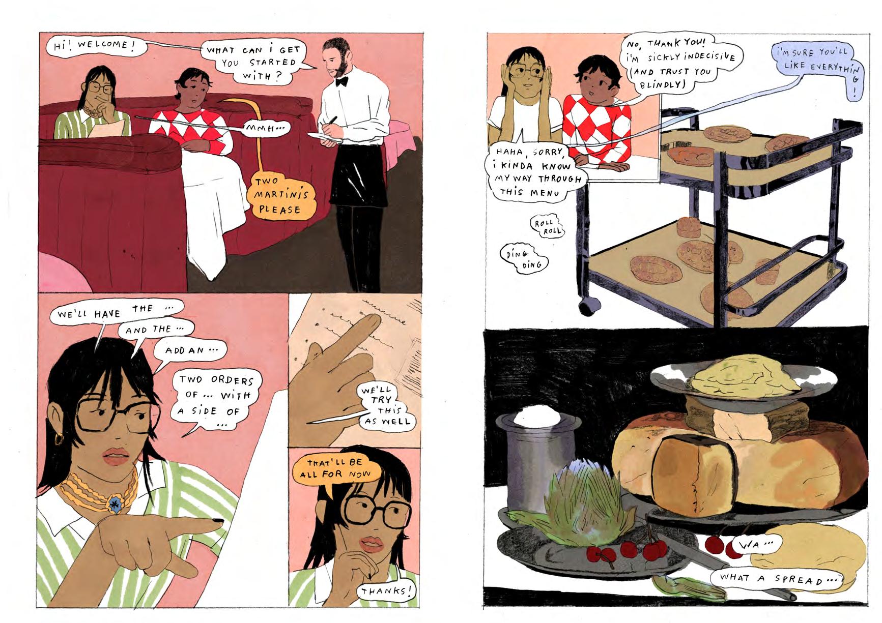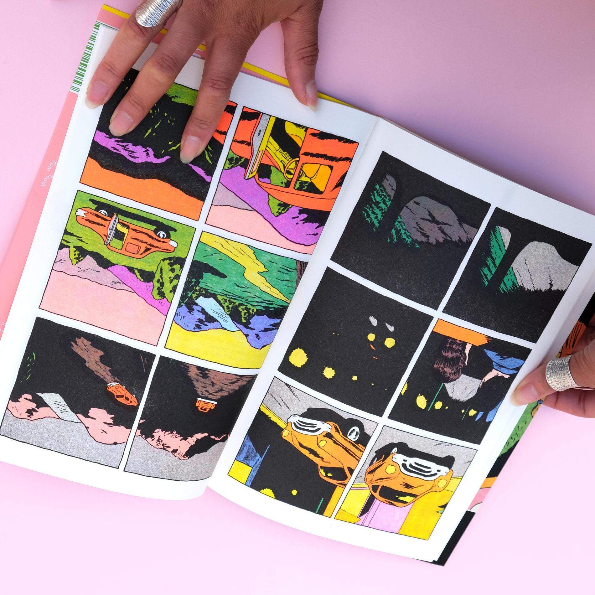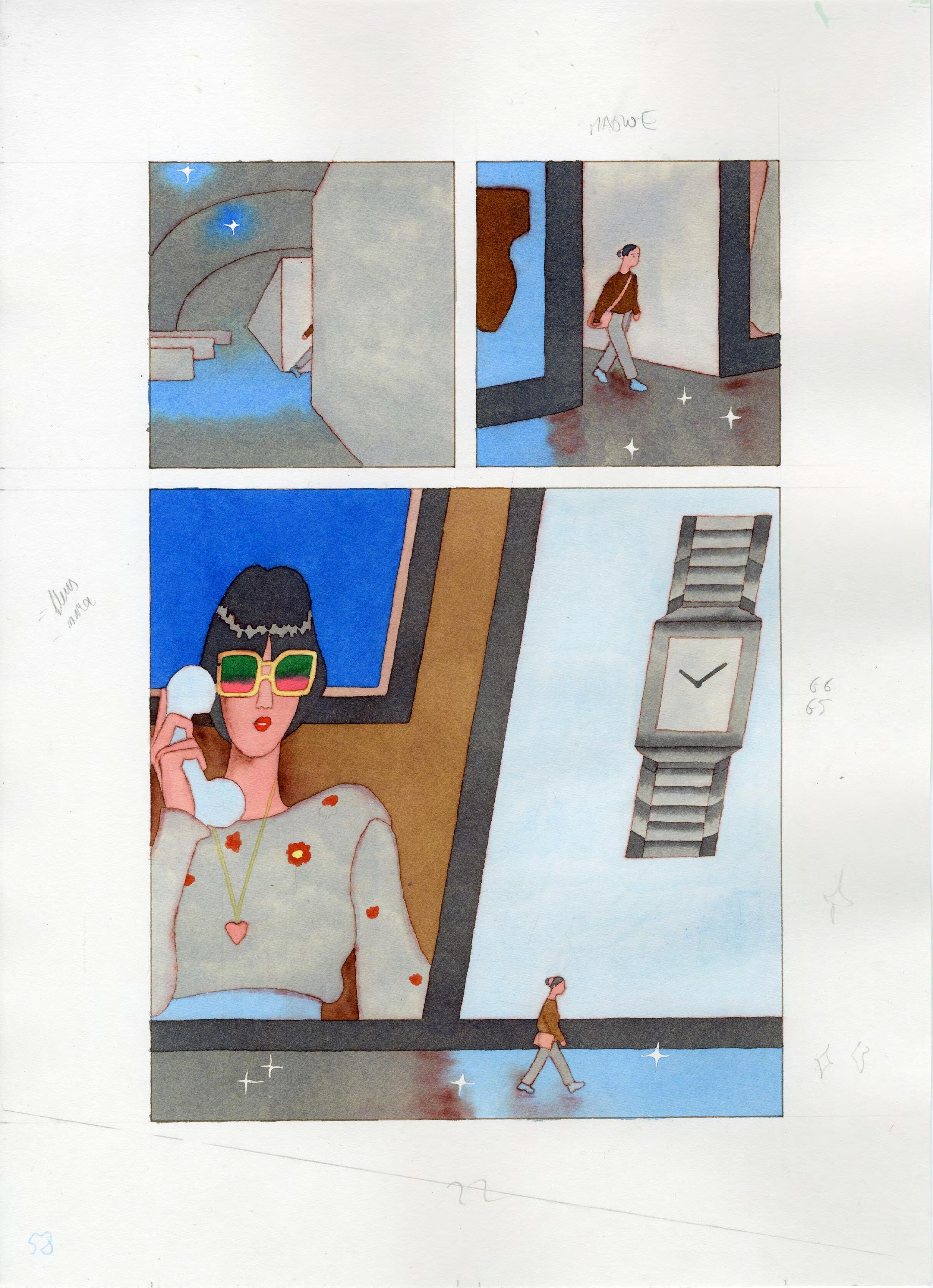 Le 27 février 2023, André et une équipe de l’aéroport CDG à Paris nous attendent sur le tarmac à la sortie de l’avion. Nous allons passer la journée à déambuler dans l’aéroport, derrière les barrières, entre les avions qui roulent jusqu’aux pistes et dans les salons privés. De cette immersion, André capte les zones qui correspondent à sa vision universelle de l’aéroport. Une zone coupée du monde et internationale, qui sera le théâtre de deux histoires drôles et sensibles travaillées à l’encre. Les couleurs vives explosent au milieu des grands aplats gris, comme les annonces et les indications dans ce grand aéroport de ciment.