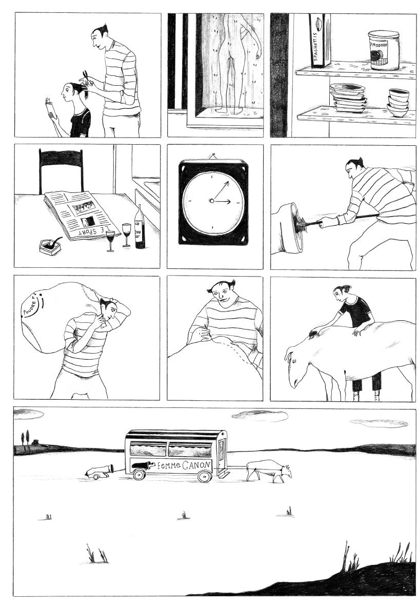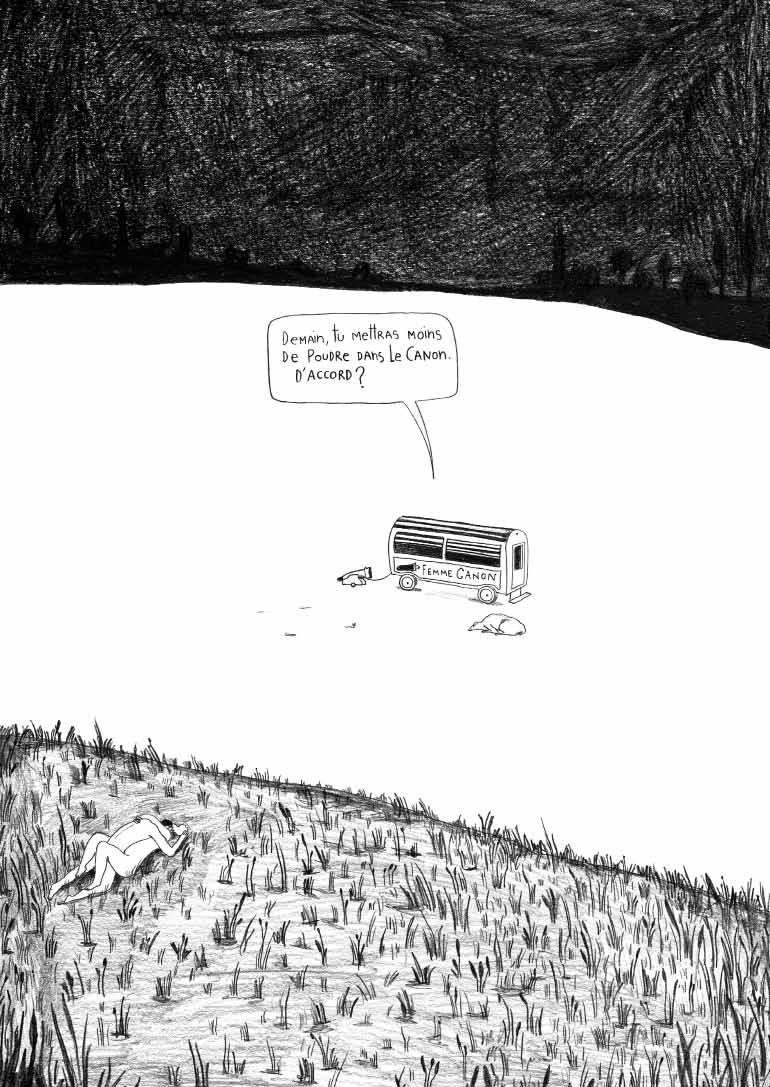 De village en village, l’homme et la femme canon font exploser la poudre. Elle vole à des kilomètres, les badauds sont émerveillés, et lui récolte l’argent et attend amoureusement son retour à la caravane. L’idylle semble parfait. Un soir, la femme canon lui demande « Demain, tu mettras moins de poudre dans le canon d’accord ? ». Elle vole trop loin et s’épuise. Lui ne comprend pas. Jusqu’au jour où elle ne revient pas de son envol…