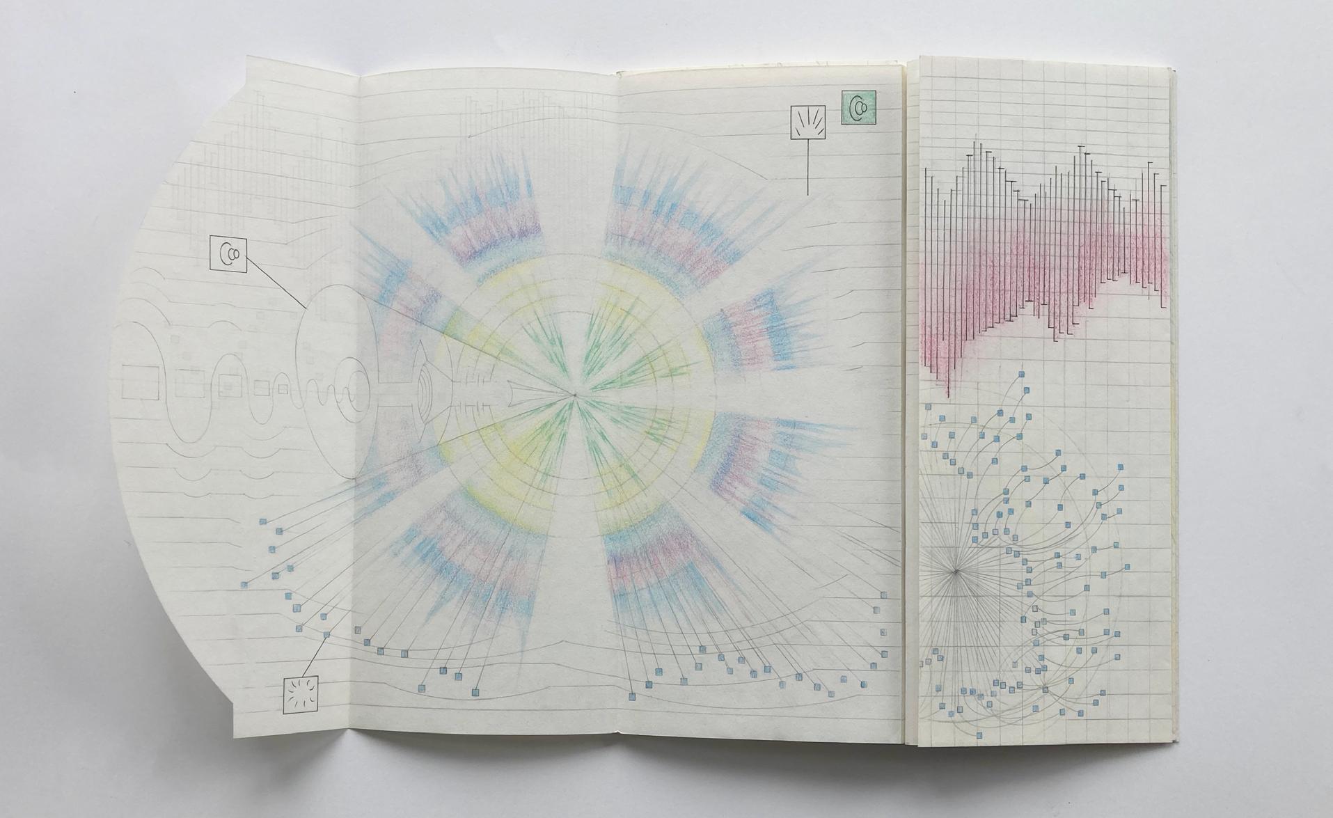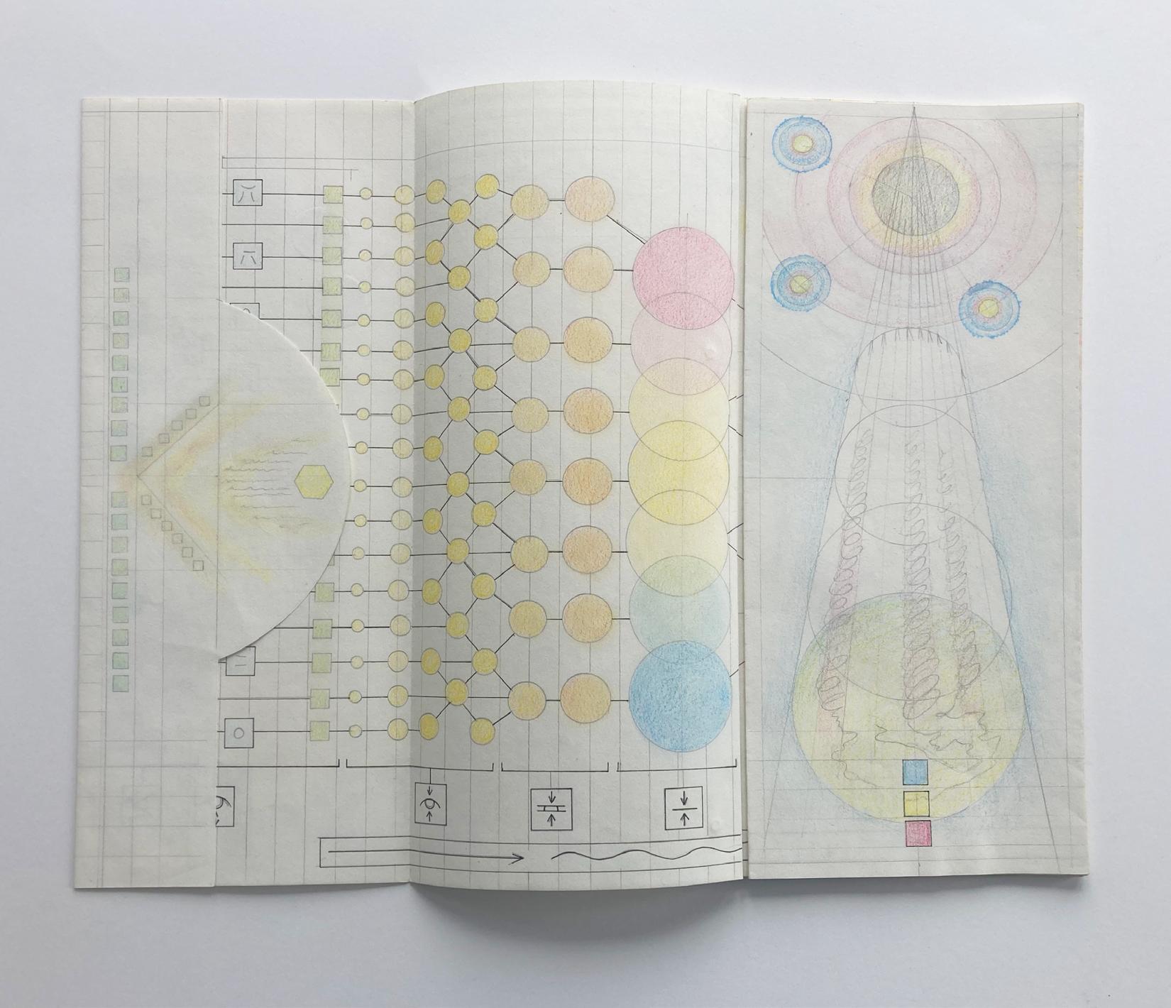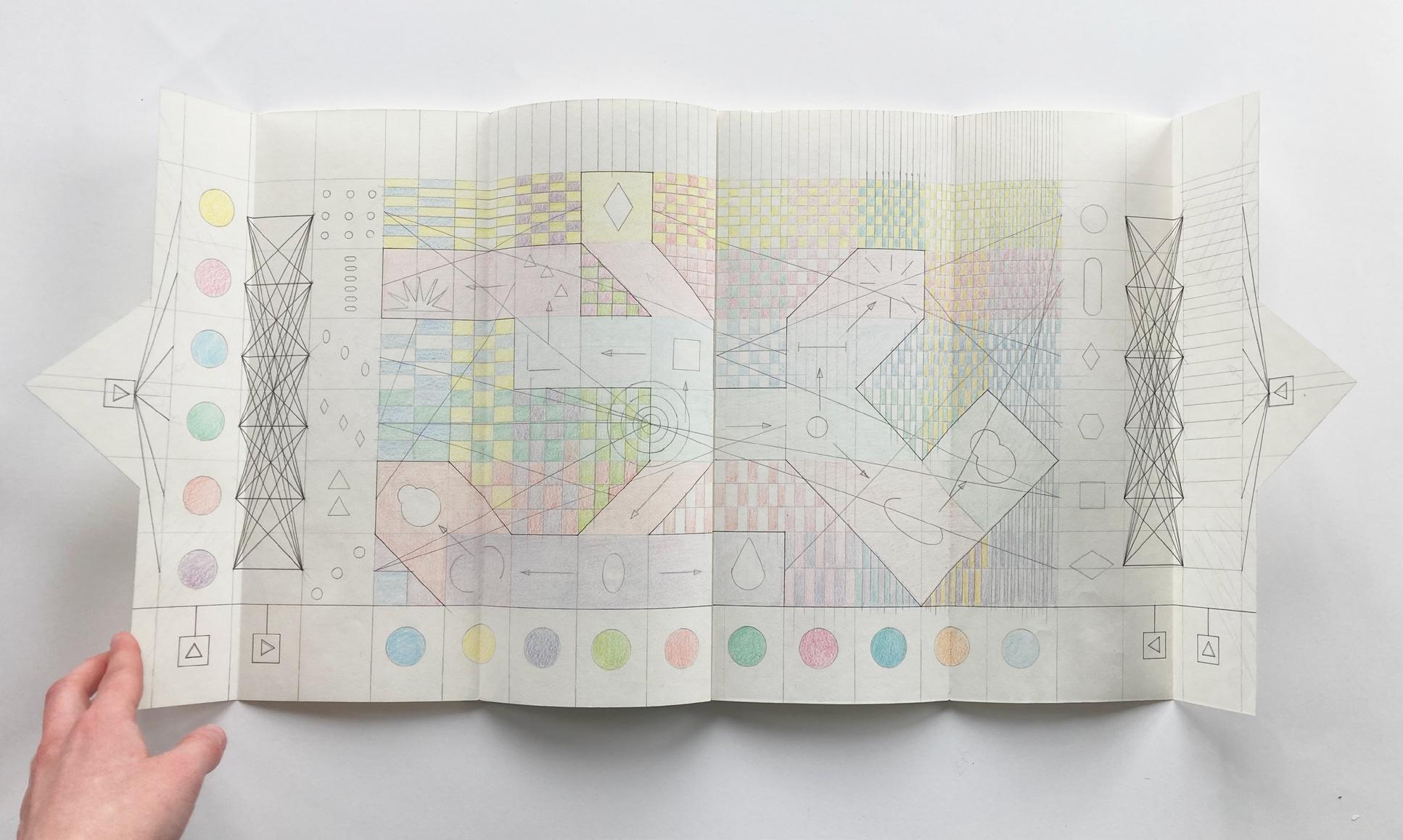 Sur le Spin off du FIBD d’Angoulême, en mars 2022, le travail de Chloé Vanderstraeten a surgi telle une révélation. Soigneusement conservé à distance de la libre consultation, le précieux exemplaire unique de Cartographies n’attendait là que de dévoiler sa précision esthétique, sa richesse conceptuelle et sa puissance manipulatoire. Dans ce livre d’artiste (édité aujourd’hui sous la forme d’un fac similé), cinq blocs de papier autonomes et complémentaires répondent chacun à un déploiement en cinq gestes, pris dans le suspens de leur mise au jour, pour dévoiler de savantes constructions diagrammatiques, offertes à une appréhension tant sensorielle qu’intellectuelle. Se joue là une analyse figurale de l’engagement du corps autour d’actions aussi évidentes qu’essentielles, dont l’habitude tend à nous laisser négliger leur complexité : dormir / respirer / jouer / écouter / cultiver. Dégagé de tout texte, des motifs géométriques référencés au dessin technique s’affichent comme parties d’un processus ambigument articulé entre le mécanique et l’organique, et voient leur force d’évocation décuplée par une ornementation attentive et codifiée, usant d’une gamme resserrée de crayons de couleur.