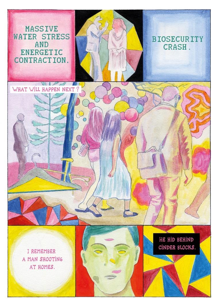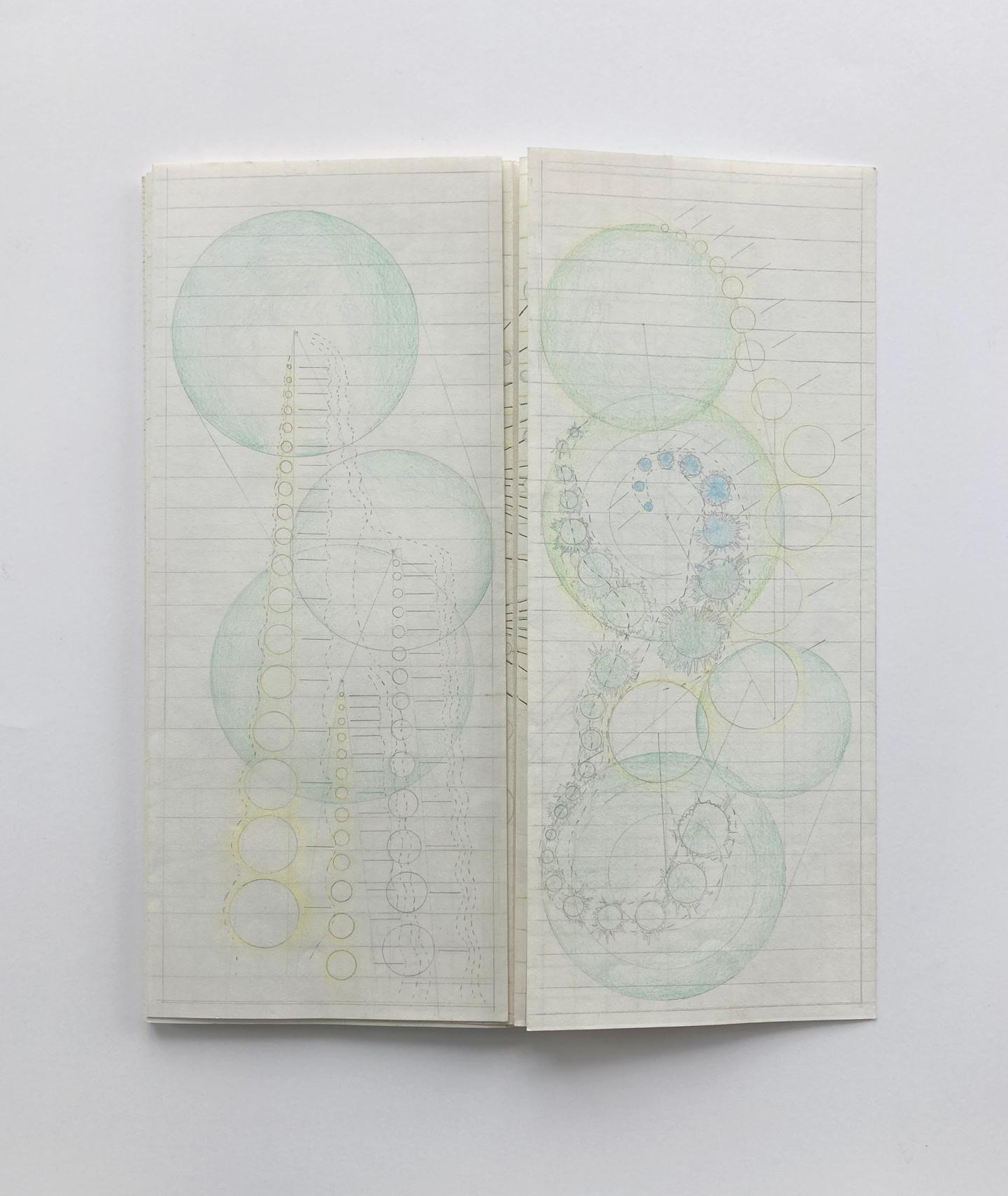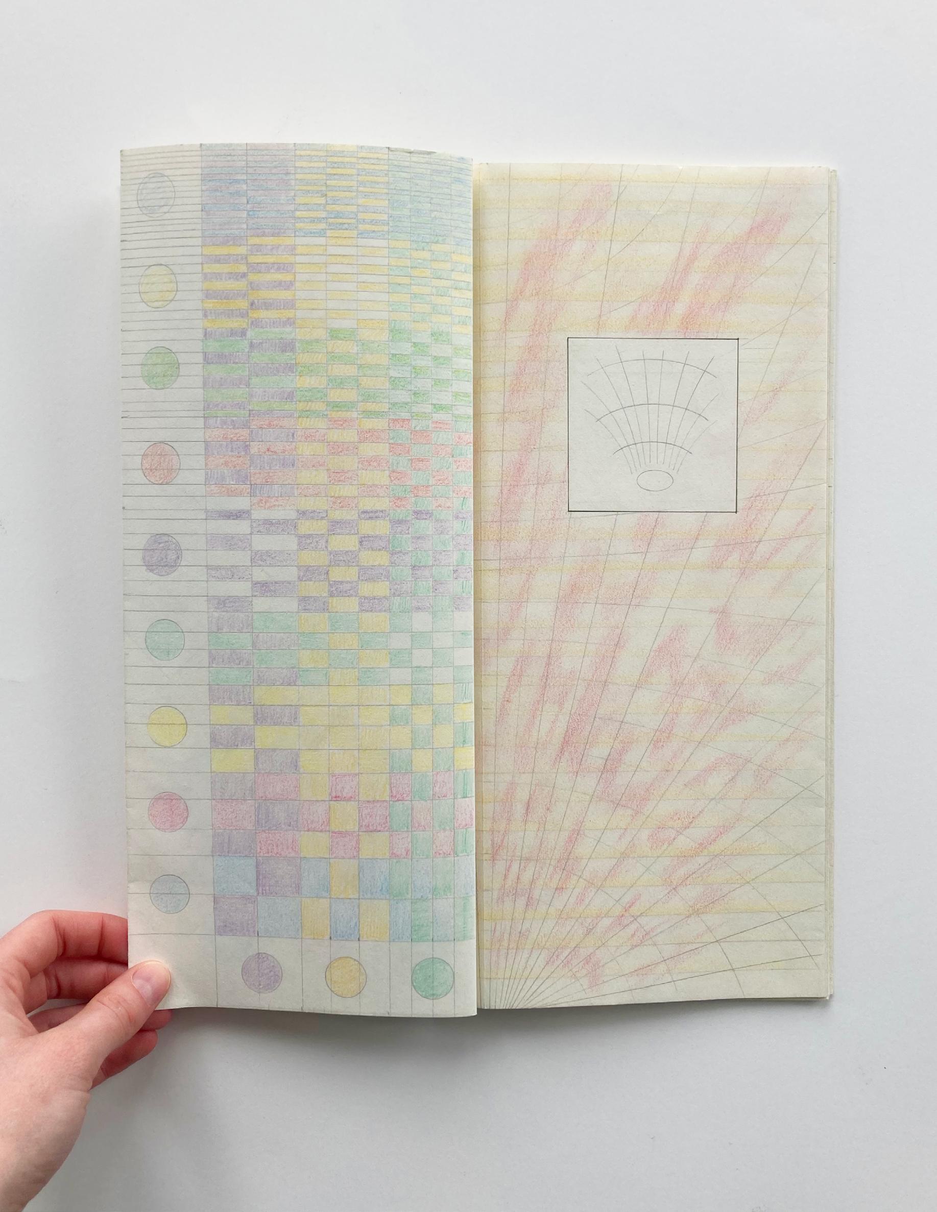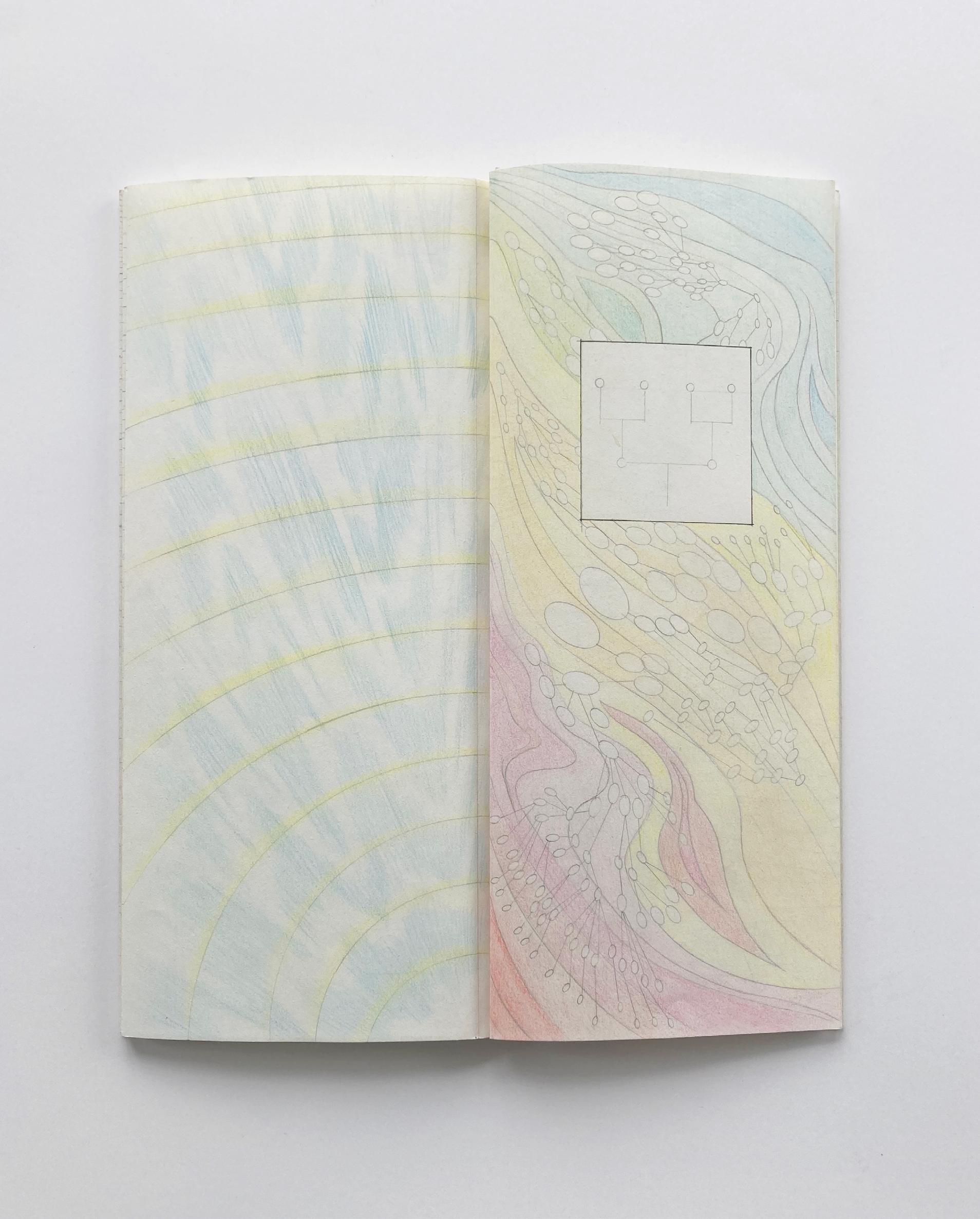 Sur le Spin off du FIBD d’Angoulême, en mars 2022, le travail de Chloé Vanderstraeten a surgi telle une révélation. Soigneusement conservé à distance de la libre consultation, le précieux exemplaire unique de Cartographies n’attendait là que de dévoiler sa précision esthétique, sa richesse conceptuelle et sa puissance manipulatoire. Dans ce livre d’artiste (édité aujourd’hui sous la forme d’un fac similé), cinq blocs de papier autonomes et complémentaires répondent chacun à un déploiement en cinq gestes, pris dans le suspens de leur mise au jour, pour dévoiler de savantes constructions diagrammatiques, offertes à une appréhension tant sensorielle qu’intellectuelle. Se joue là une analyse figurale de l’engagement du corps autour d’actions aussi évidentes qu’essentielles, dont l’habitude tend à nous laisser négliger leur complexité : dormir / respirer / jouer / écouter / cultiver. Dégagé de tout texte, des motifs géométriques référencés au dessin technique s’affichent comme parties d’un processus ambigument articulé entre le mécanique et l’organique, et voient leur force d’évocation décuplée par une ornementation attentive et codifiée, usant d’une gamme resserrée de crayons de couleur.