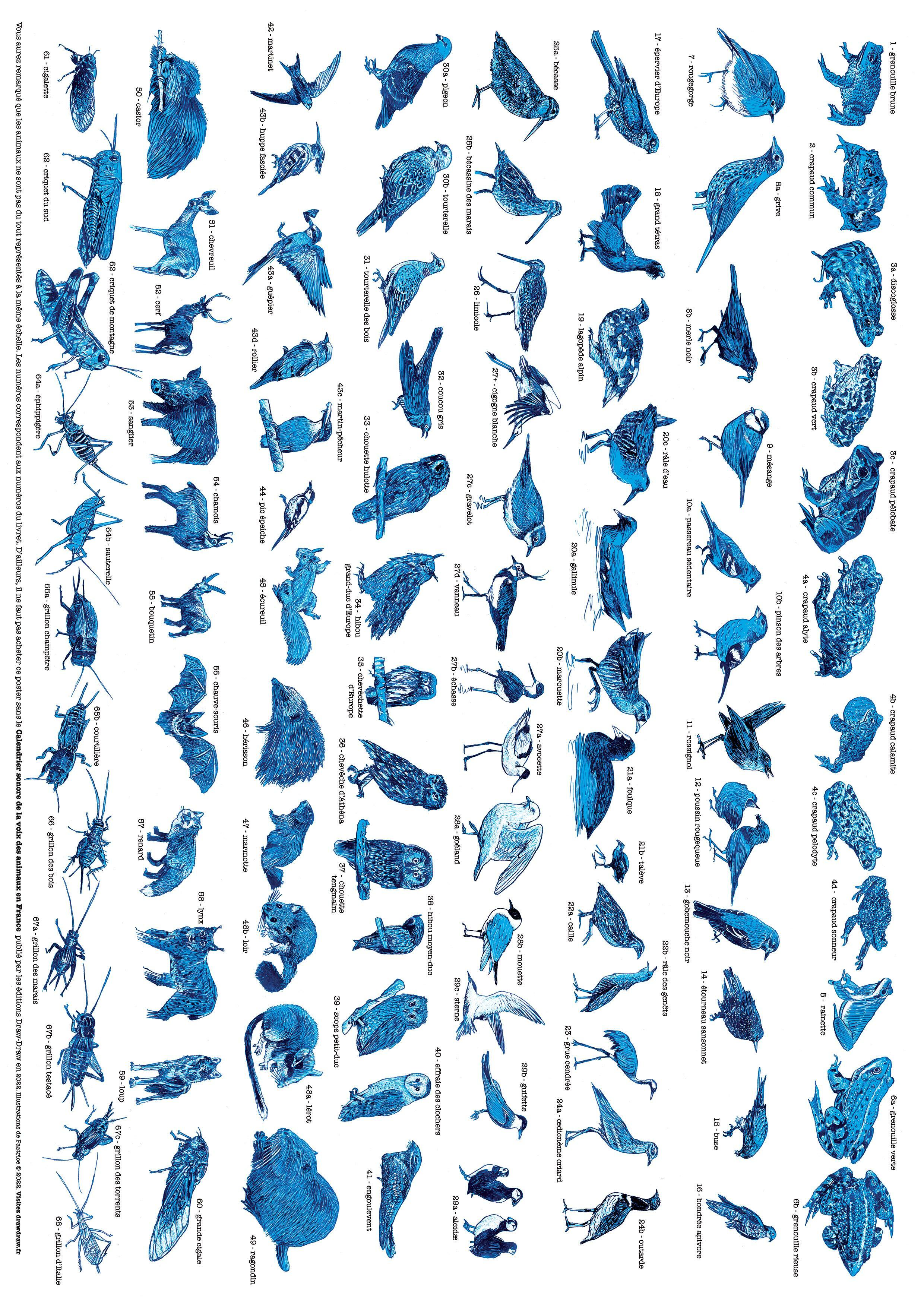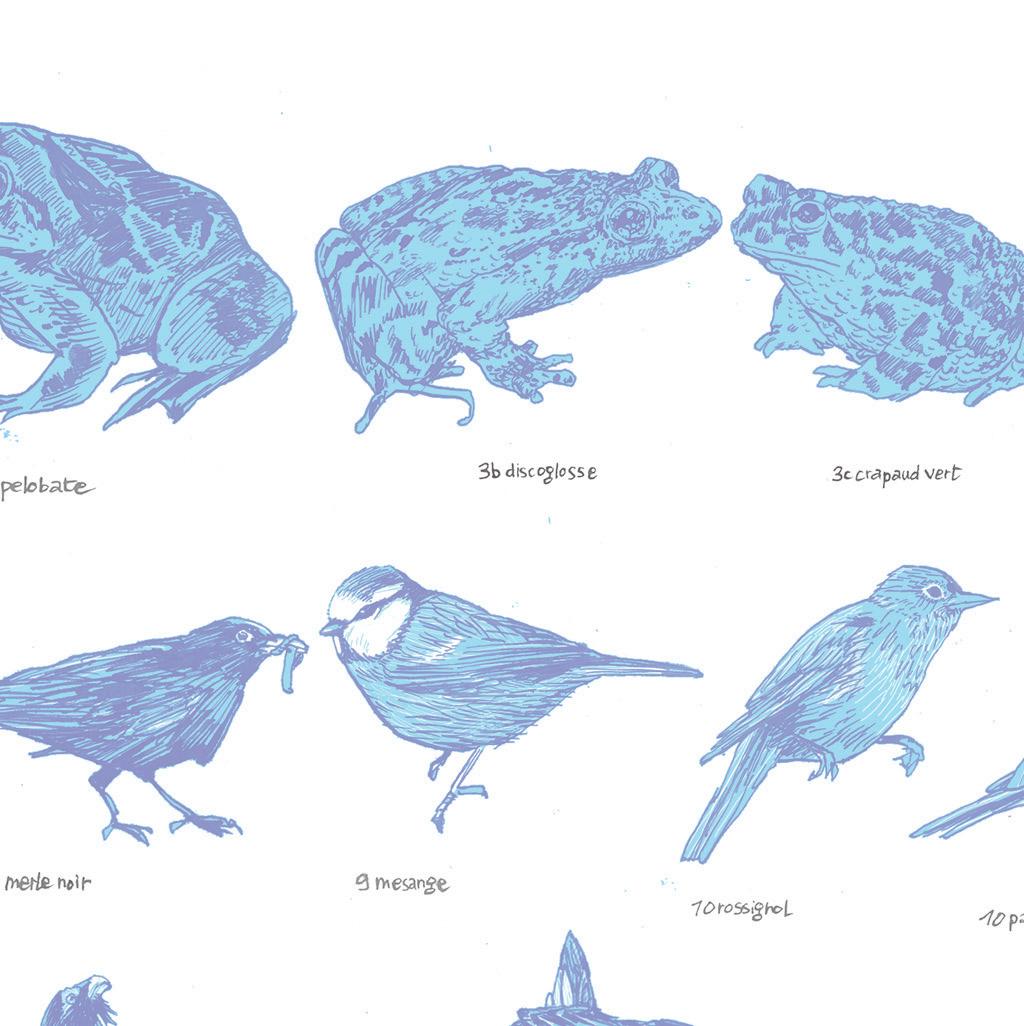 auteur: Fernand Deroussen illustrateur: Paatrice titre: CALENDRIER SONORE DE LA VOIX DES ANIMAUX EN FRANCE format : 24 x 16 cm pages: 32 prix : 25 € tirage : 1500 ex. isbn : 978-29555626-9-7 Quand on lui demande, Paatrice dit qu’il sait « parler et dessiner un grand nombre de langues imaginaires. » Il a ici réalisé une série d’illustrations réalistes et délicates, sur un grand poster 40 x 60 cm, imprimé en deux couleurs, en risographie, à l’atelier Quintal.