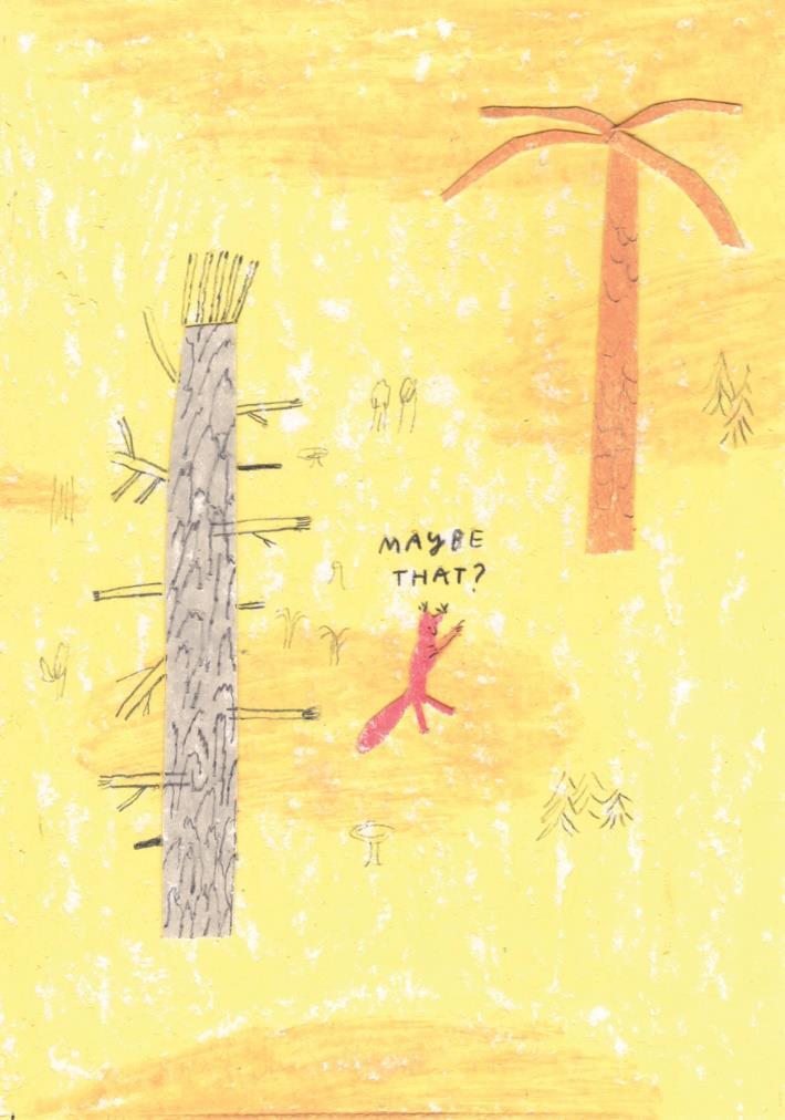 Tout comme sur les feuilles d'album, les deux types de peinture alternent, se rencontrent, s'éloignent, il en est de même pour les deux personnages de l'histoire. Une poule et un cerf se rencontrent, tombent amoureux, seuls entre les pages du livre ils se désirent et tentent de se rejoindre sans y parvenir jusqu'à ce qu'un stratagème leur permette de se rencontrer et de s'aimer ! 31,8x 23,5x 0,3 cm