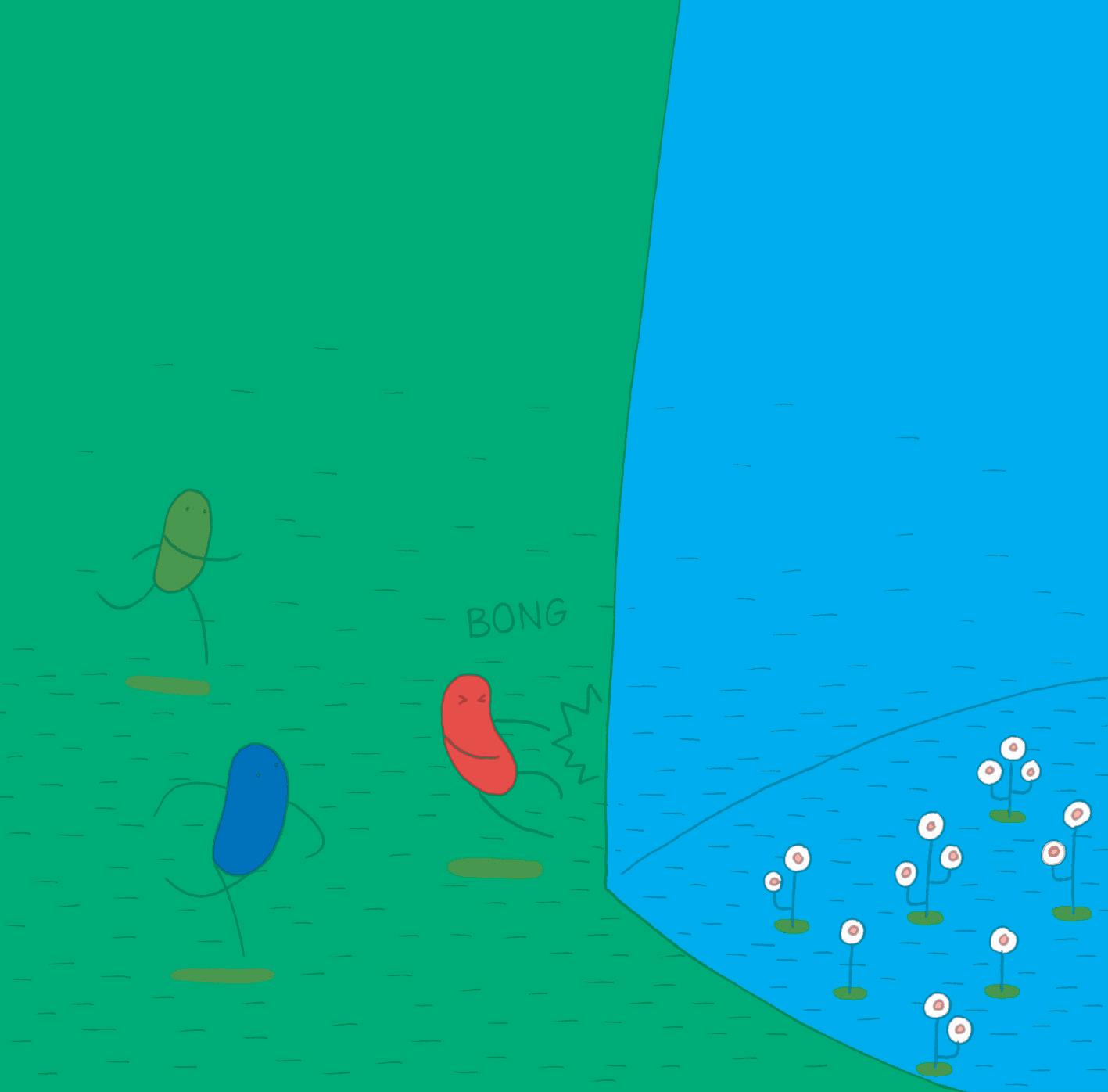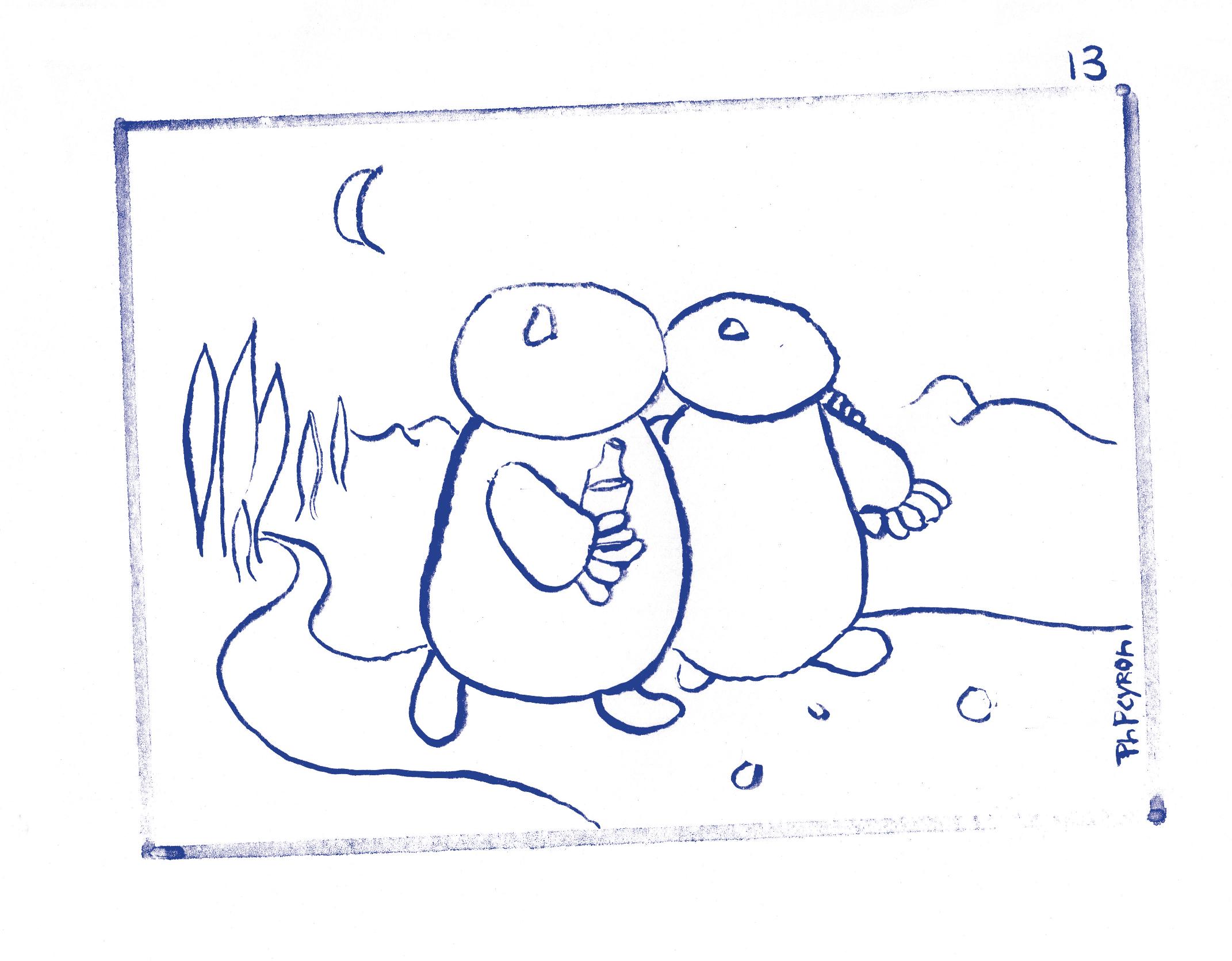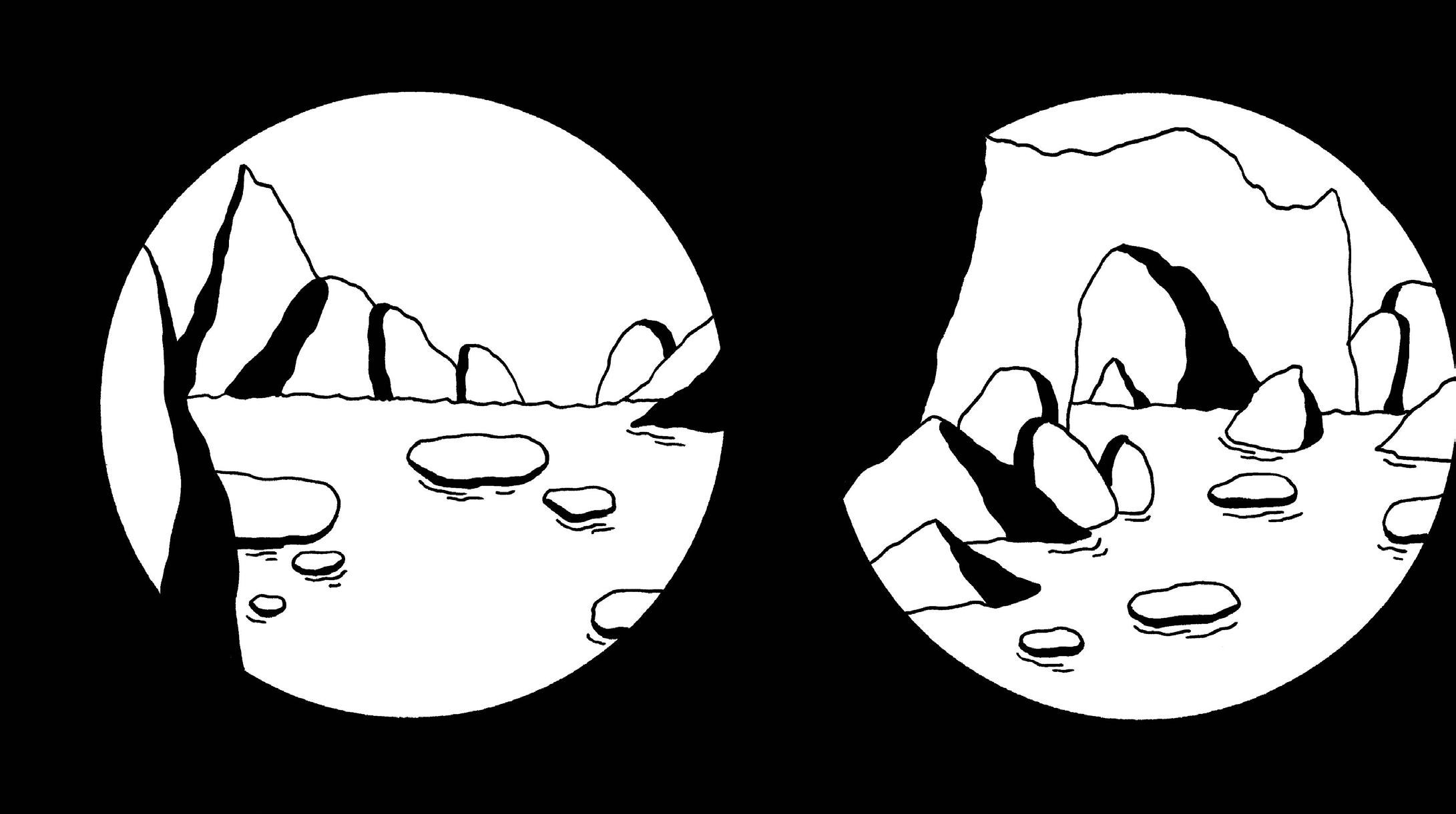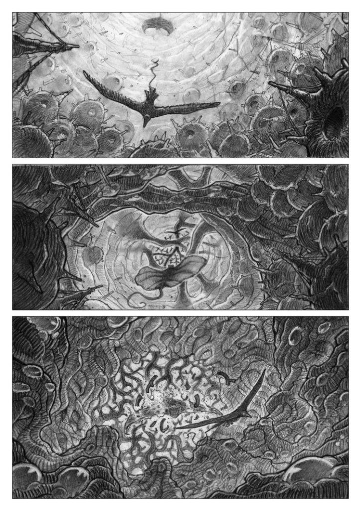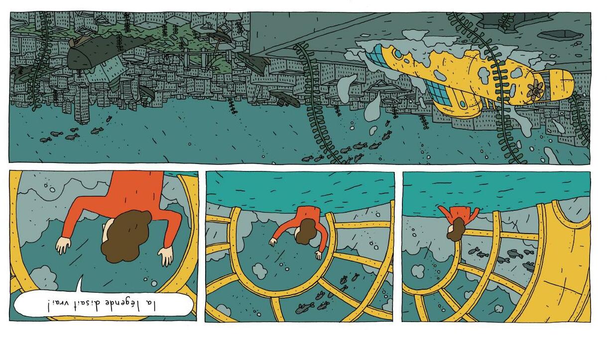 L’univers unicellulaire d’Alex Chauvel est aussi minimaliste que foisonnant. Dans ce monde fait de toutes petites choses et avec une économie de moyens remarquable, l’auteur nous emmène dans une contrée vivante et pleine de surprises. Une carte évolutive du microcosme permet d’aller voir ce qui se passe dans différents lieux et chez différentes espèces. Au fur et à mesure de notre progression dans les trois chapitres de cette histoire, la carte se dévoile, se transforme, laissant apparaître les modifications du territoire et les déplacements de nos héros.