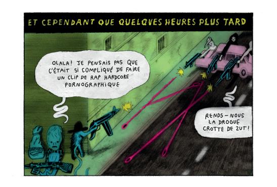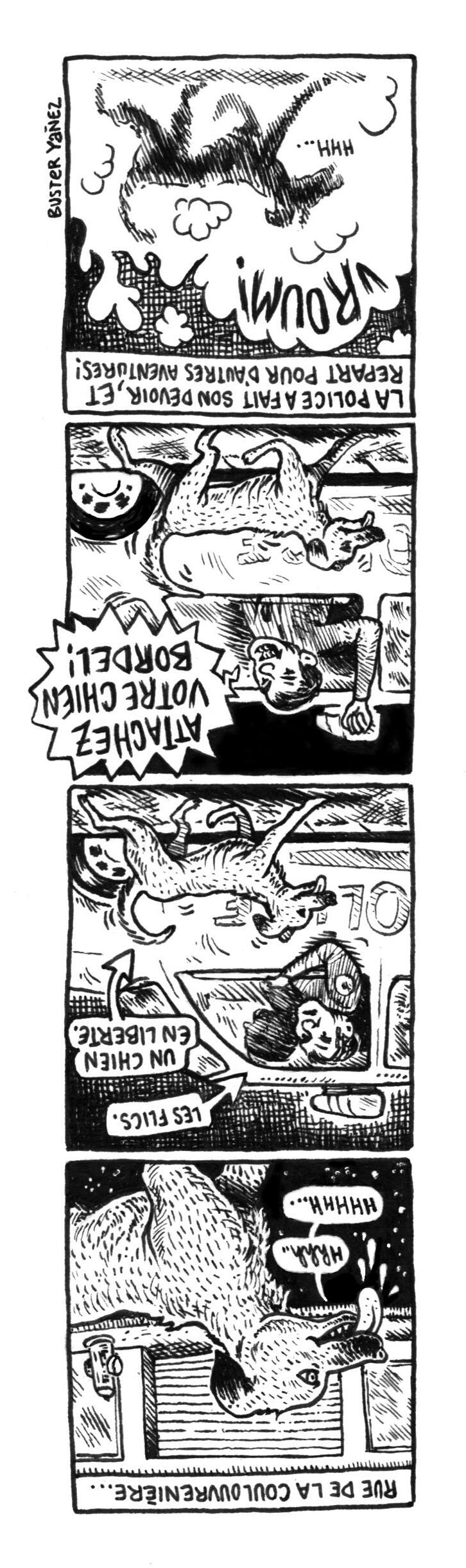 Dans cette vue urbaine cisaillée, on va chercher des fragments de récits dissimulés qui feront apparaître des histoires cachées. Rassemblant tous les éléments d’une sorte de chasse au trésor citadine, Buster Yañez se garde d’un ludisme superflu et nous emmène dans la lecture d’un petit comix évoquant la belle époque de l’underground américain, en version cliquable.