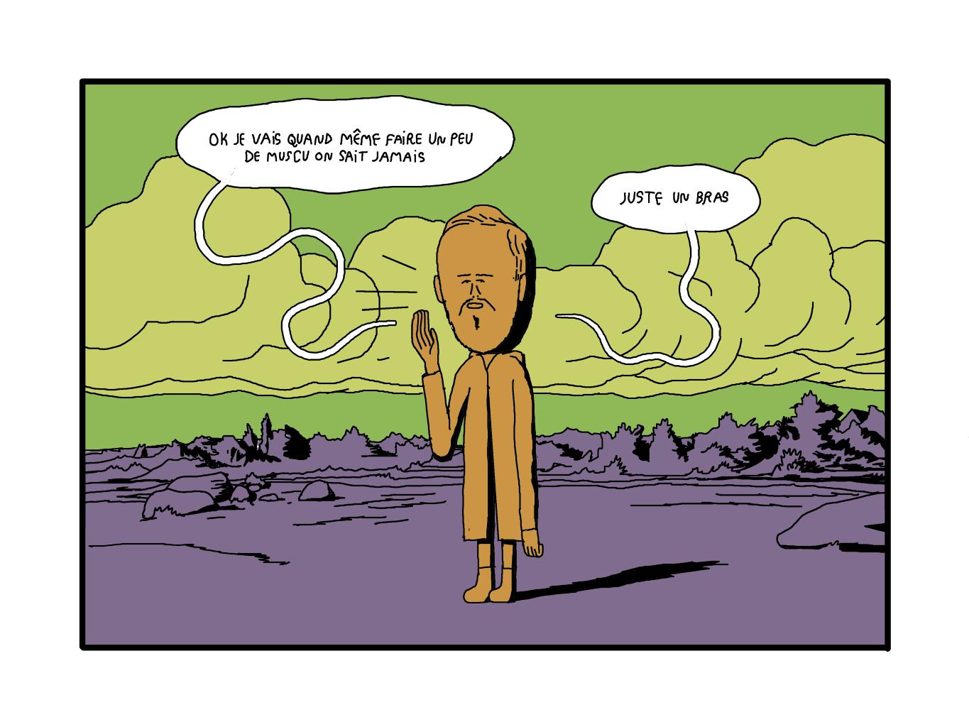 Le marcheur est un récit contemplatif, sans parole, servi par le trait particulier, reconnaissable et libre de Krum qui, pour le coup, contrairement à son habitude, emploie la couleur pour servir et peindre son imaginaire. Le découpage, en gauffrier (3 vignettes verticales) et le format, à l’italienne pour une publication cartonnée, font un écrin original et de qualité.