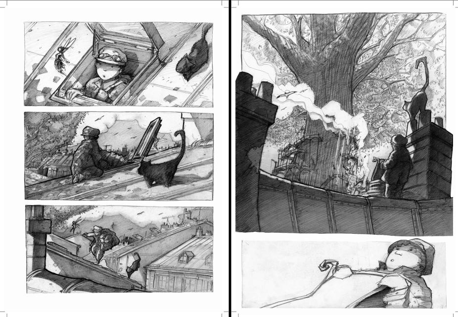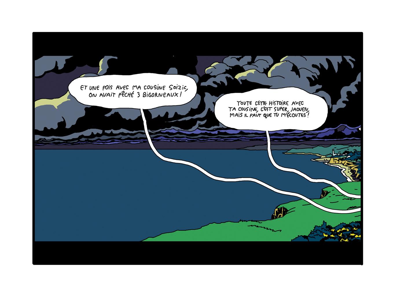 À travers une alternance de points de vue soigneusement orchestrée, des dizaines de mini-récits s'entremêlent dans cet ouvrage incroyablement riche. On navigue à vue dans des réseaux de longs scrolls panoramiques jusqu'à ce que se constitue un tableau d'ensemble. Peu à peu émerge une cartographie de drames iodés, toujours teintés d'une légère ironie. Mais les nombreuses pistes que propose Tangage et roulis ne se parcourent pas en une seule lecture. Ainsi les finalités fluctuantes de ce périple se révéleront pleinement en s’y replongeant encore et encore. Nul doute qu'avec le noir et blanc ultra efficace de Matis Monvoisin, on se laissera volontiers entraîner de la surface aux profondeurs et inversement, au cœur d'un formidable tourbillon d’événements.