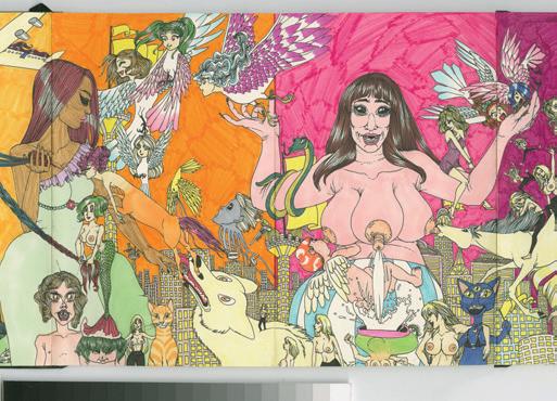 temps à regarder ce dessin, fascinée. Elle se souvient encore de l’attraction qu’il a exercé sur elle, convaincue qu’il a contribué à son désir de créer. On dirait même qu’elle tente de reconstituer ce souvenir qui, chaque année, à la fois s’effrite et s’enlumine de l’aura de légende que la mémoire confère aux souvenirs que nous chérissons. En 2016, elle a entamé de dessiner Femme Ville, forte de l’expérience acquise avec un premier leporello intitulé Tomorrow Never knows en hommage aux Beatles. Elle a ainsi décidé de poursuivre dans la même ligne, dans une totale liberté narrative, mais cette fois-ci avec une donnée simple qui puisse tenir de fil conducteur. Spontanément, sans idée préconçue, un premier personnage féminin est apparu… Elle tenait son thème ! Une procession loufoque de femmes a surgi. Femmes géantes, femmes animales, femmes hélicoptères, femmes dans tous leurs états. Ce travail sur carnet papier japonais a ainsi permis à Caroline Tschumi un véritable déploiement géographique de l’imaginaire. Celle-ci conserve depuis lors cette pratique dans son travail artistique.