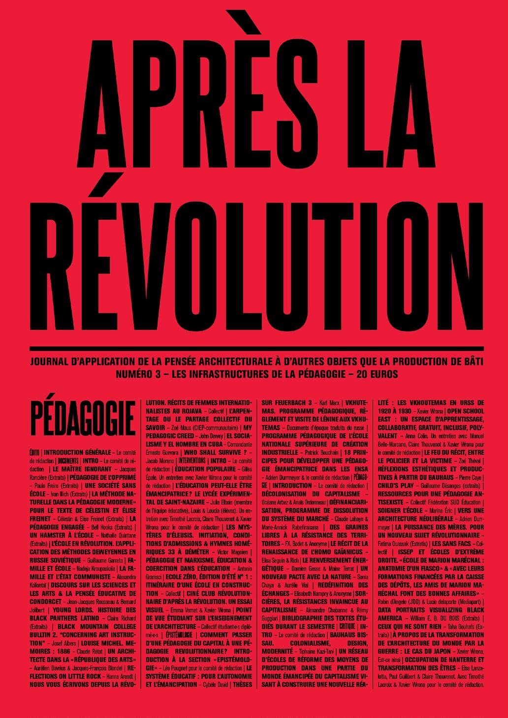 Le présent numéro d’Après la révolution a pour objectif de travailler la question des projets pé dagogiques compris comme un processus de transformation et d’émancipation des êtres en imaginant comment la discipline architecturale pourrait être utile à la construction de pédago gies alternatives à celles du capital. Ce numéro s’est fixé comme objectif de travailler la ques tion des structures et des programmes pédago giques afin de pallier un manque sur le terme exact de pédagogie et son importance dans la construction des êtres. Il s’agit de mettre un terme à une pédagogie stérile et uni-direction nelle afin de construire une méthode et une in frastructure de la pédagogie au sein d’un projet politique collectif.