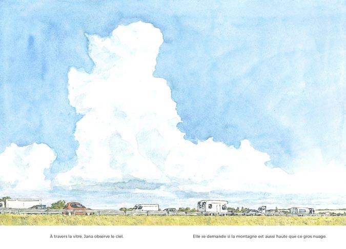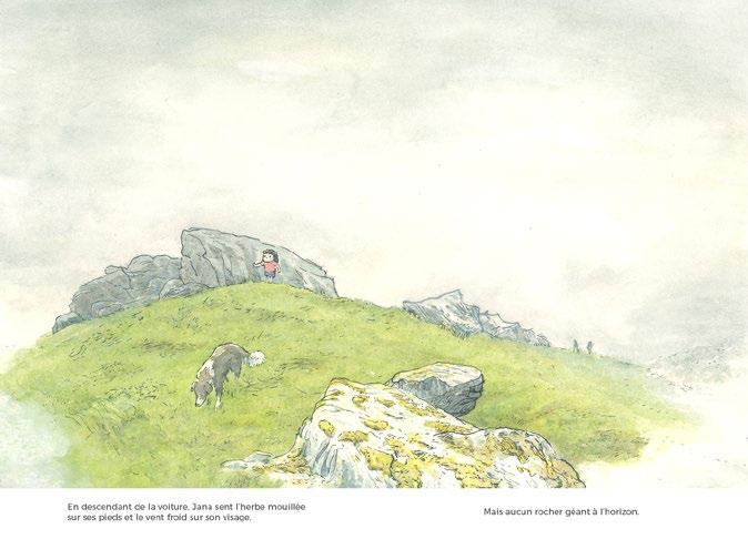 Jana part en vacances et, pour la première fois, elle va voir la montagne. Impatiente, elle passe le voyage à en parler à son chien, à poser des questions à ses parents ou à rêver de ce gros rocher aussi haut que les nuages. Mais quelle déception, en se rapprochant du chalet, elle découvre que la montagne se cache dans la brume. Ce soir-là, Jana s’endort inquiète et déçue. Pourra-t-elle enfin voir en vrai la montagne ?