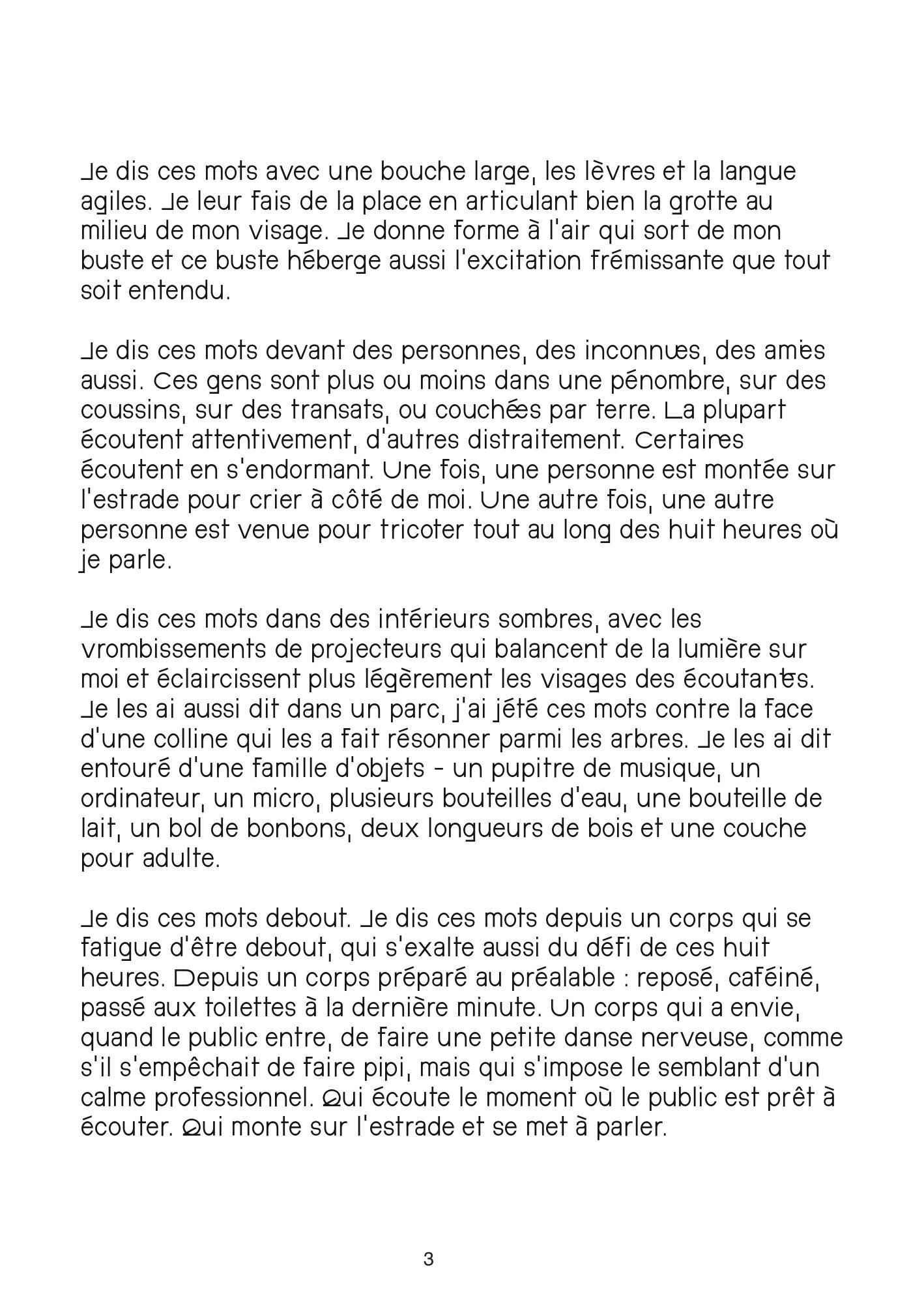Un collage d’impressions, de messages échangés, de moments partagés, de phrases saisies au vol, en vrac, de descriptions, de reconstitutions. De préjugés que j’ai sur Valentin Carron. De choses surprenantes, d’étonnements, de projections, de découvertes, de déceptions, de sympathies ou d’incompréhensions. Mettre en scène nos échanges, écrits, oraux, nos téléphones, ses paroles, ses gestes, nos rendez-vous, dans une enquête sur qui il est. Une enquête donc, une étude, un texte qui part à la recherche : mais qui est cet artiste ? Mais qu’est-ce qu’il crée ? Mais qu’est-ce qui le relie à ses œuvres ? Mais pourquoi est-il ce qu’il est ?