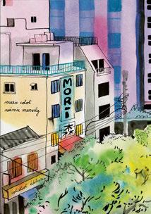 Illustration: stylo à encre noire (contours), tampons faits de papier (masse des escaliers), ordinateur (mise en couleur)