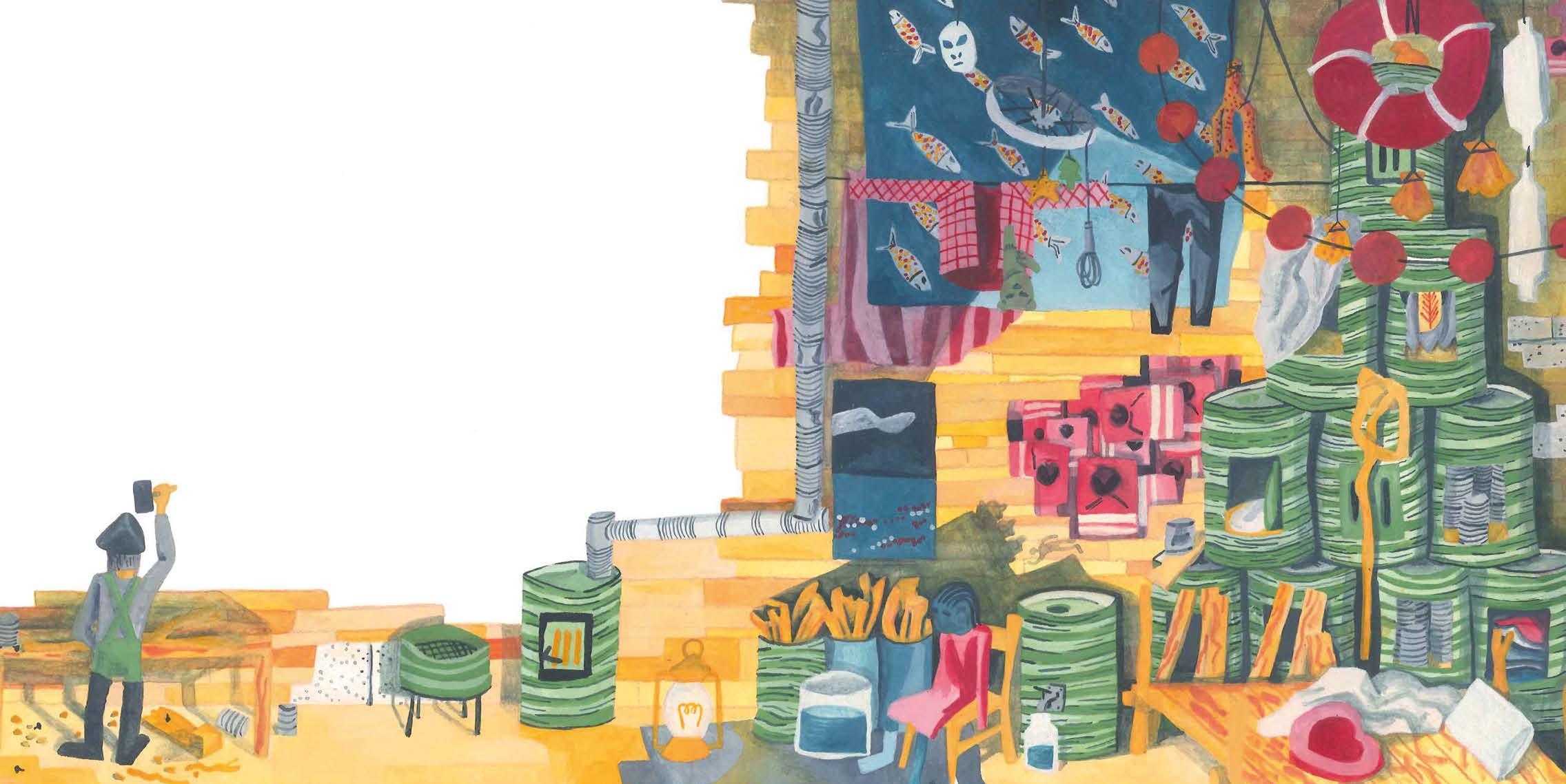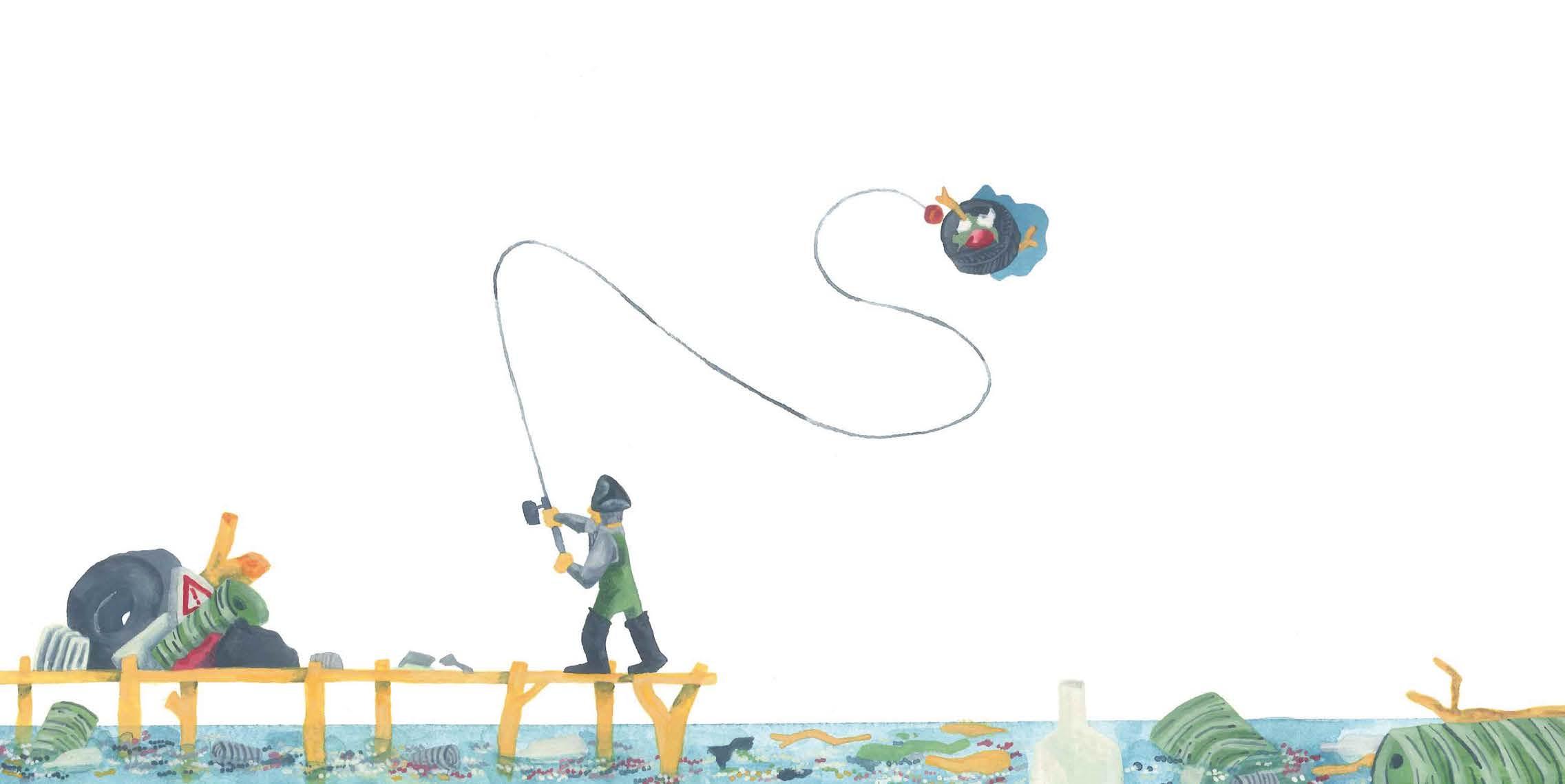 Comme tous les matins, un homme s’installe face à la mer et pêche… des boîtes de sardine rouillées, de vieux bidons, des casseroles rongées par le sel.