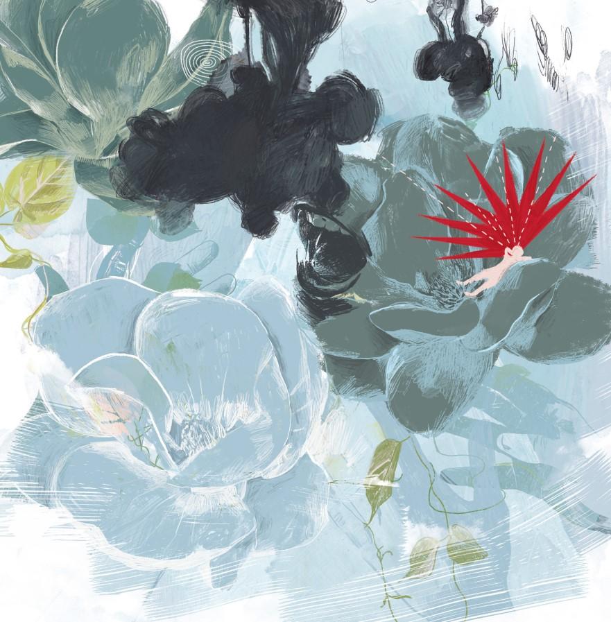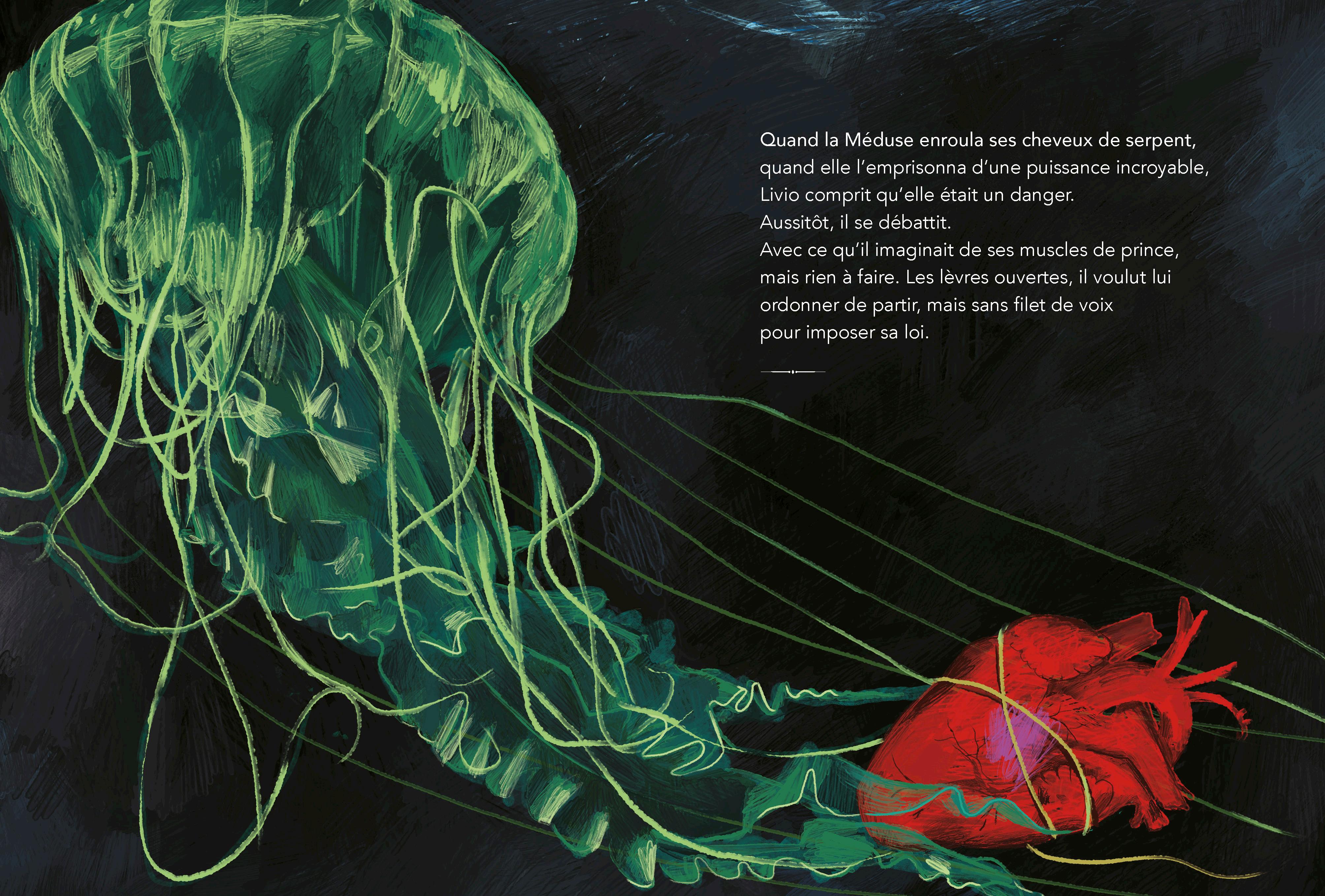 Inspirée par les « textures graphiques » du peintre américain Cy Twombly, Claire Gaudriot s’est laissée embarquer par la poésie – le garçon d’océan au cœur de la mer – pour exprimer sous des traits de crayon chatoyants à la fois le temps qui passe, l’attente, l’impatience et la peur.
