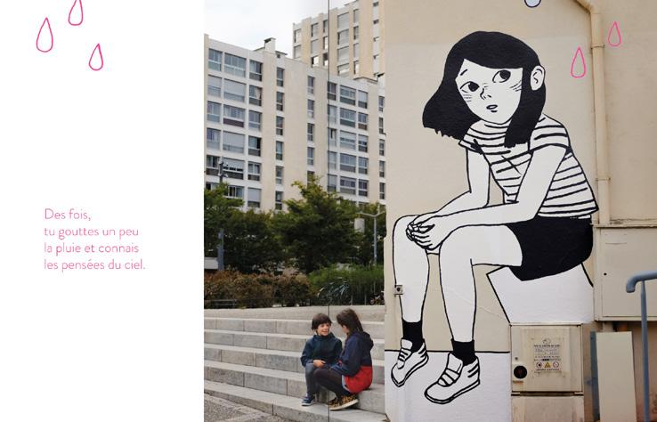 Une enfant traverse la ville, tantôt sirène, tantôt bergère d’un troupeau de songes, se transforme et s’adapte à l’environnement urbain pour s’épanouir et découvrir sa propre liberté. En envahissant un quartier de Lyon avec ses collages géants, Lucie Albon propose à ses habitants d’inventer l’histoire d’une jeune fille.