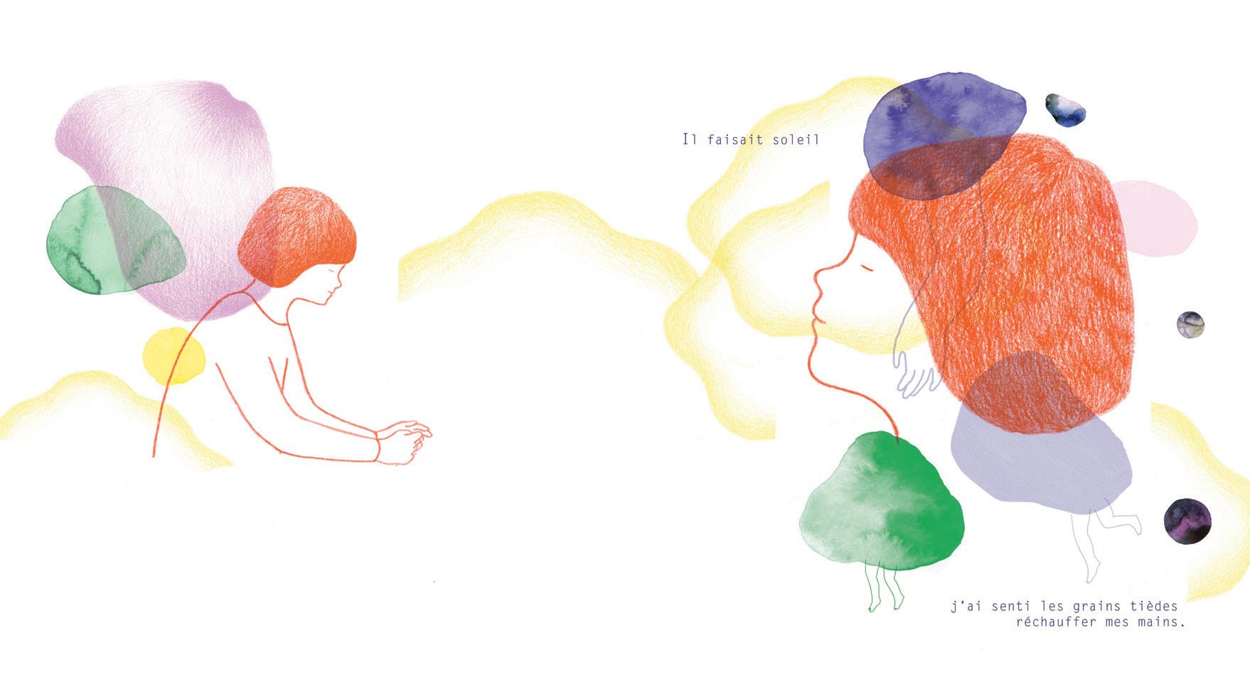 Assise dans le grand bac à sable, j’en ai pris une poignée. Il faisait soleil, j’ai senti les grains tièdes réchauffer mes mains. Je les ai laissés couler entre mes doigts comme une petite cascade. Il en restait un peu au creux de ma paume.
