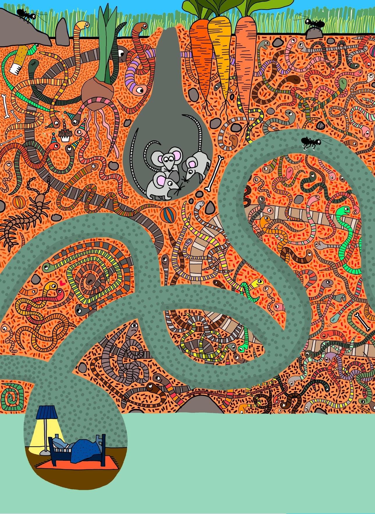 C’est ici que débute le grand voyage de cette petite fourmi curieuse, baroudeuse et un peu bigleuse, qui voulait découvrir le monde. Elle vit sous la terre, au royaume des vers de terre. Elle connait bien la chaleur et la moiteur de cet endroit. Elle aime beaucoup toutes ses odeurs. Mais cette petite fourmi n’a pas une très bonne vue, habituée à la pénombre, elle ne voit pas plus loin que le bout de son nez.