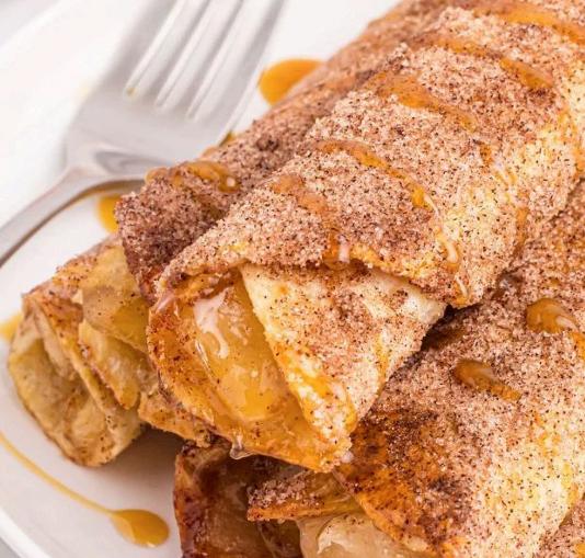 Lay tortillas out on flat surface. Spoon 2 tablespoons of apple filling down the center of each. Roll tightly to form taquito. Brush with melted butter. In a shallow, flat dish, mix the sugar and cinnamon, then roll the buttered taquito in the mixture, coating the outside. Place in the air fryer basket, seam side down, without overlapping. Air fry at 350 degrees F for 9-11 minutes, until the taquito is golden and crispy. Use tongs to flip them over, and air fry for an additional 3-4 minutes, or until they reach your desired crispness.