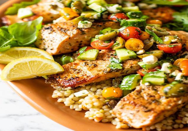 Salmon: Coat salmon with olive oil and fresh squeezed lemon. Sprinkle dry seasonings to all sides of each fillet. Let sit for 10 minutes. Heat a generous amount of olive oil in skillet over medium-high heat. Pan-fry fillets, skin side down for 5 minutes. Gently flip fillets and cook for an additional 2-3 minutes on the other side. While salmon is cooking, in separate bowl, mix the topper ingredients. To serve, top each piece of salmon with topper ingredients.