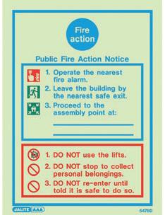 The Fire Action sign will advise people of what they should do in the event of a fire. It suggests that the alarm should be raised and that you can break the glass to do this. It also states that you should head for the nearest exit and safe assembly point.