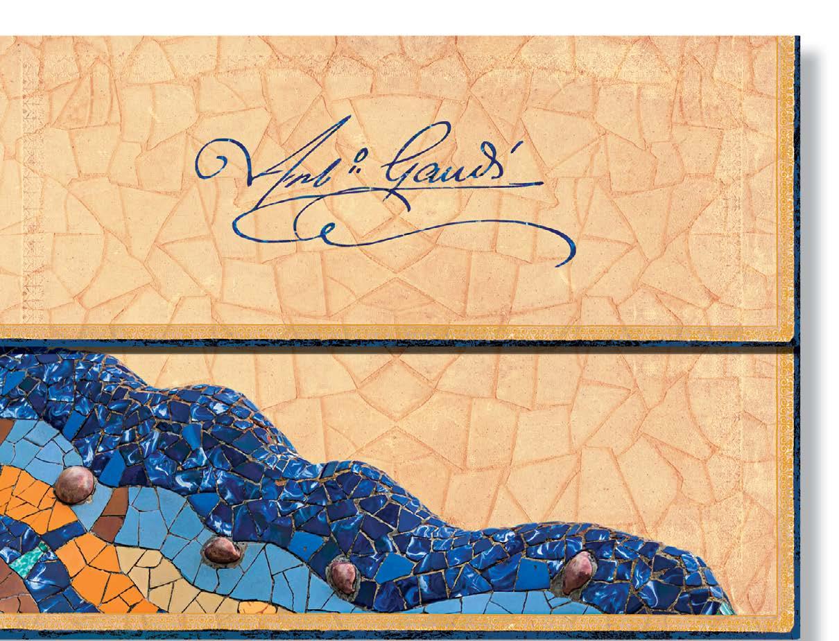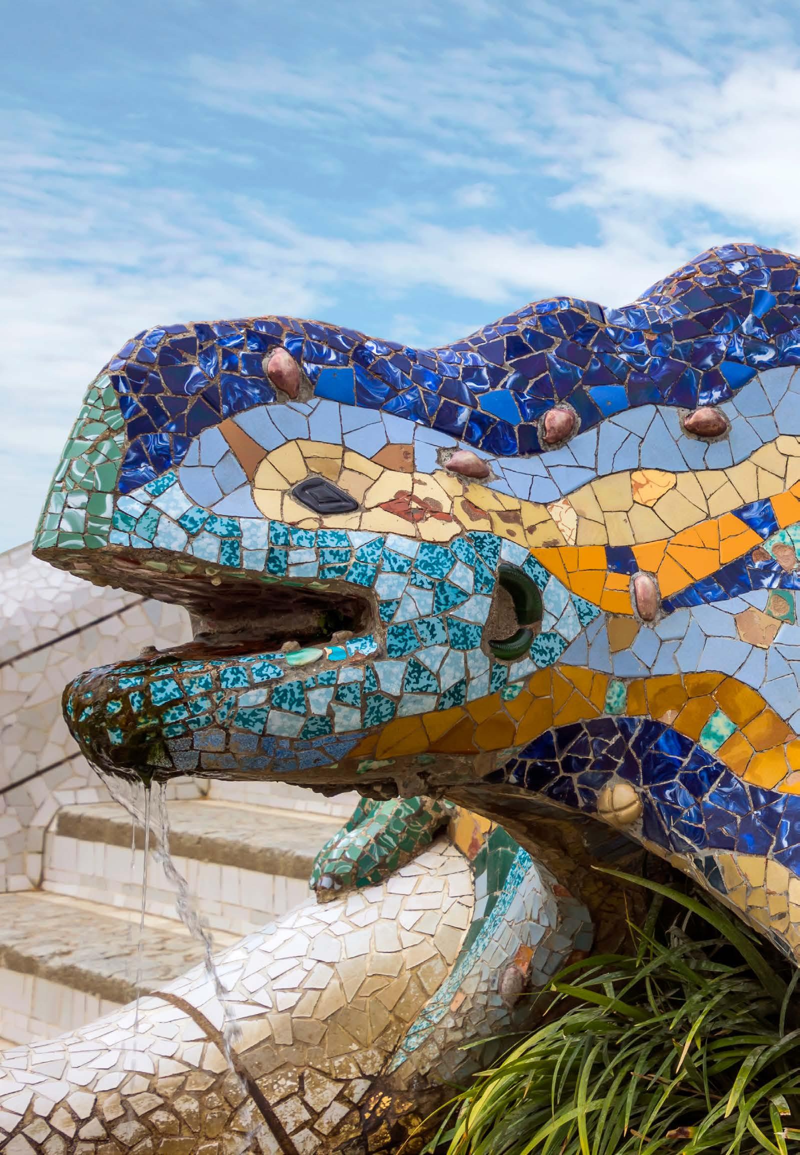 O Mosaic elements from Gaudi’s iconic Dragon Salamandra in Park Güell in Barcelona make up the colourful details incorporated into this cover design.
