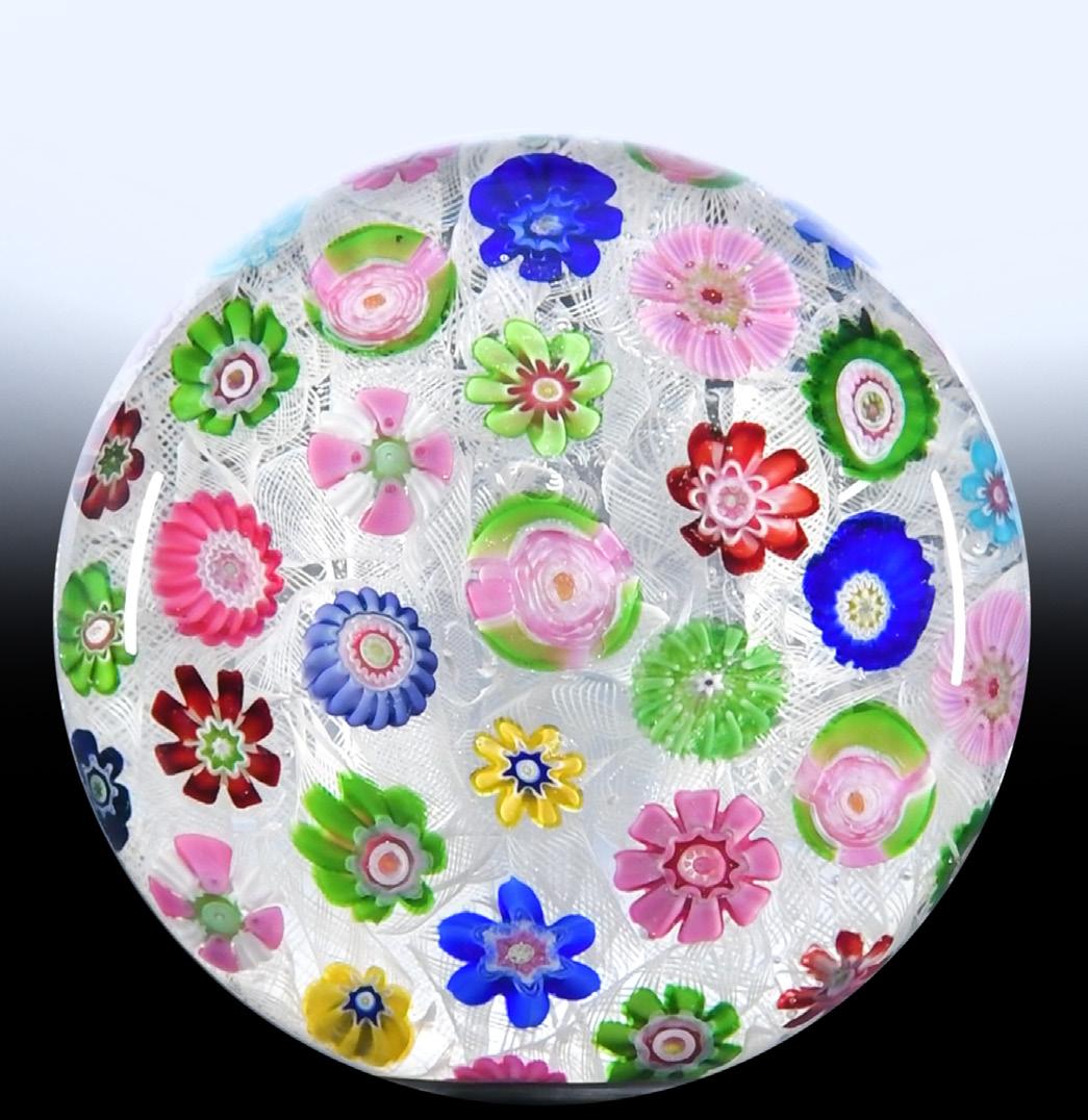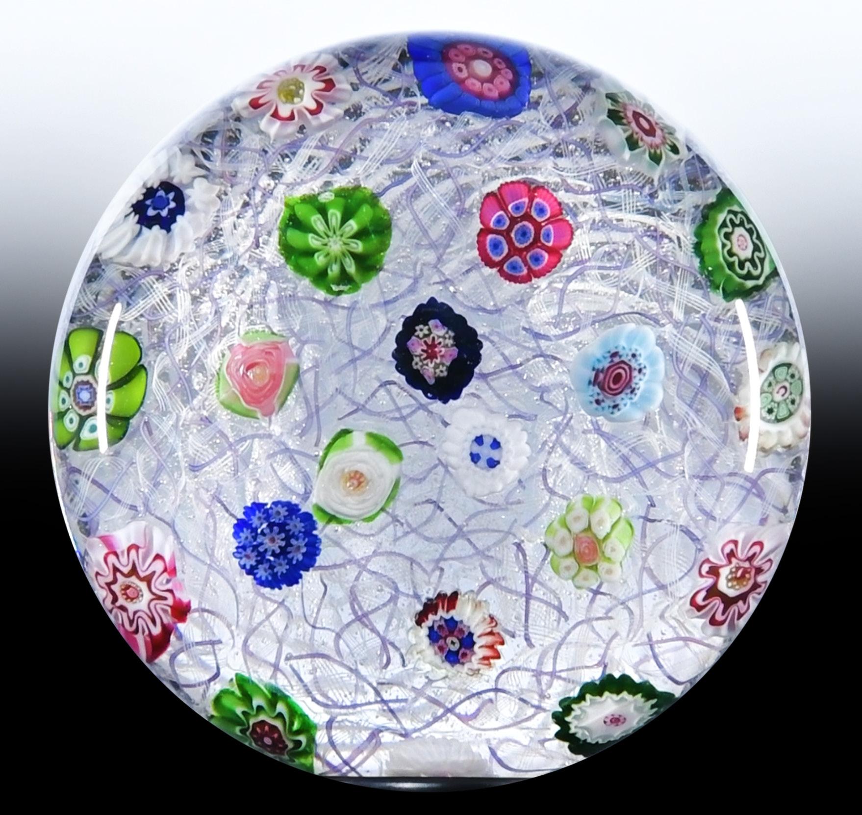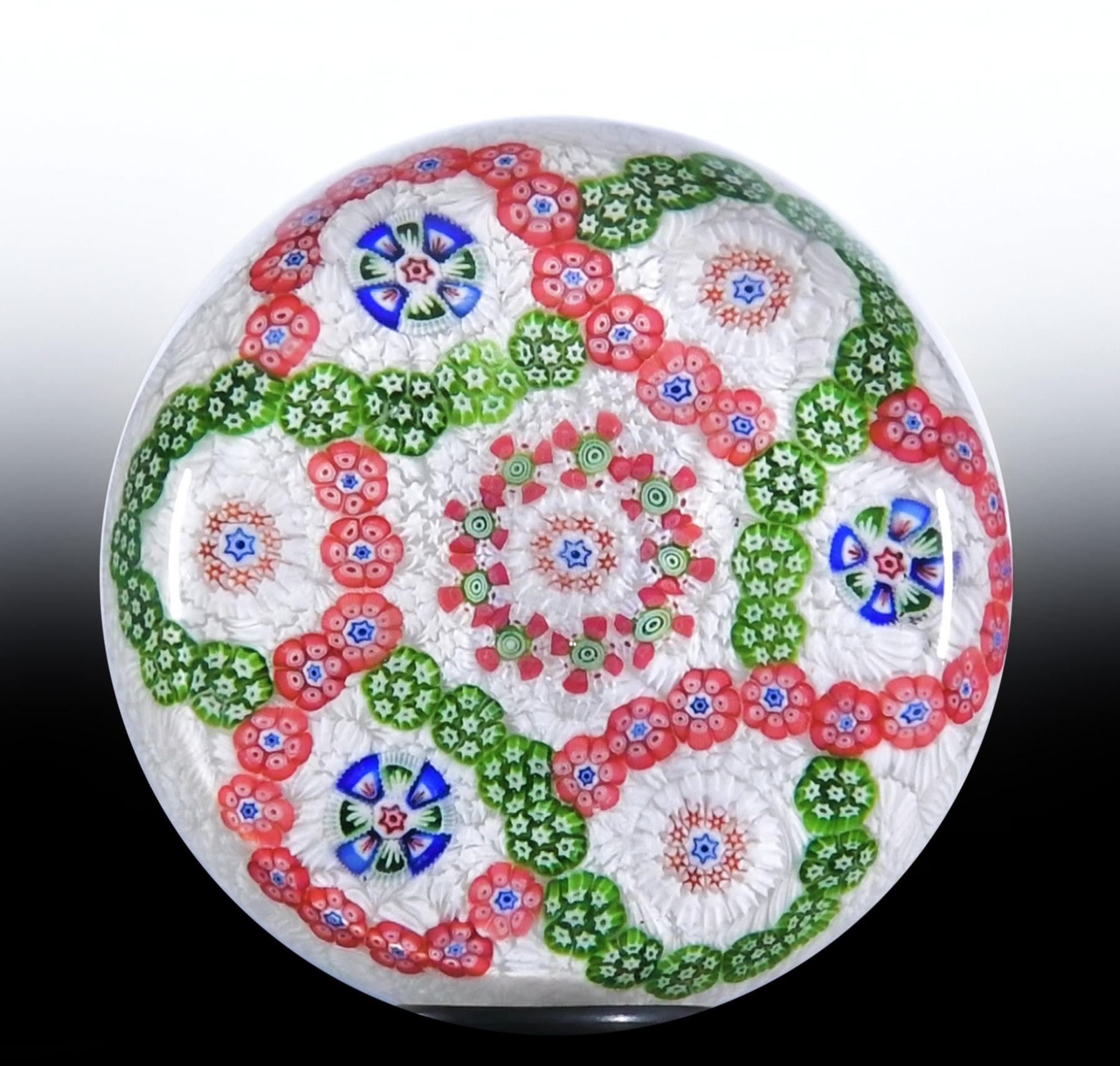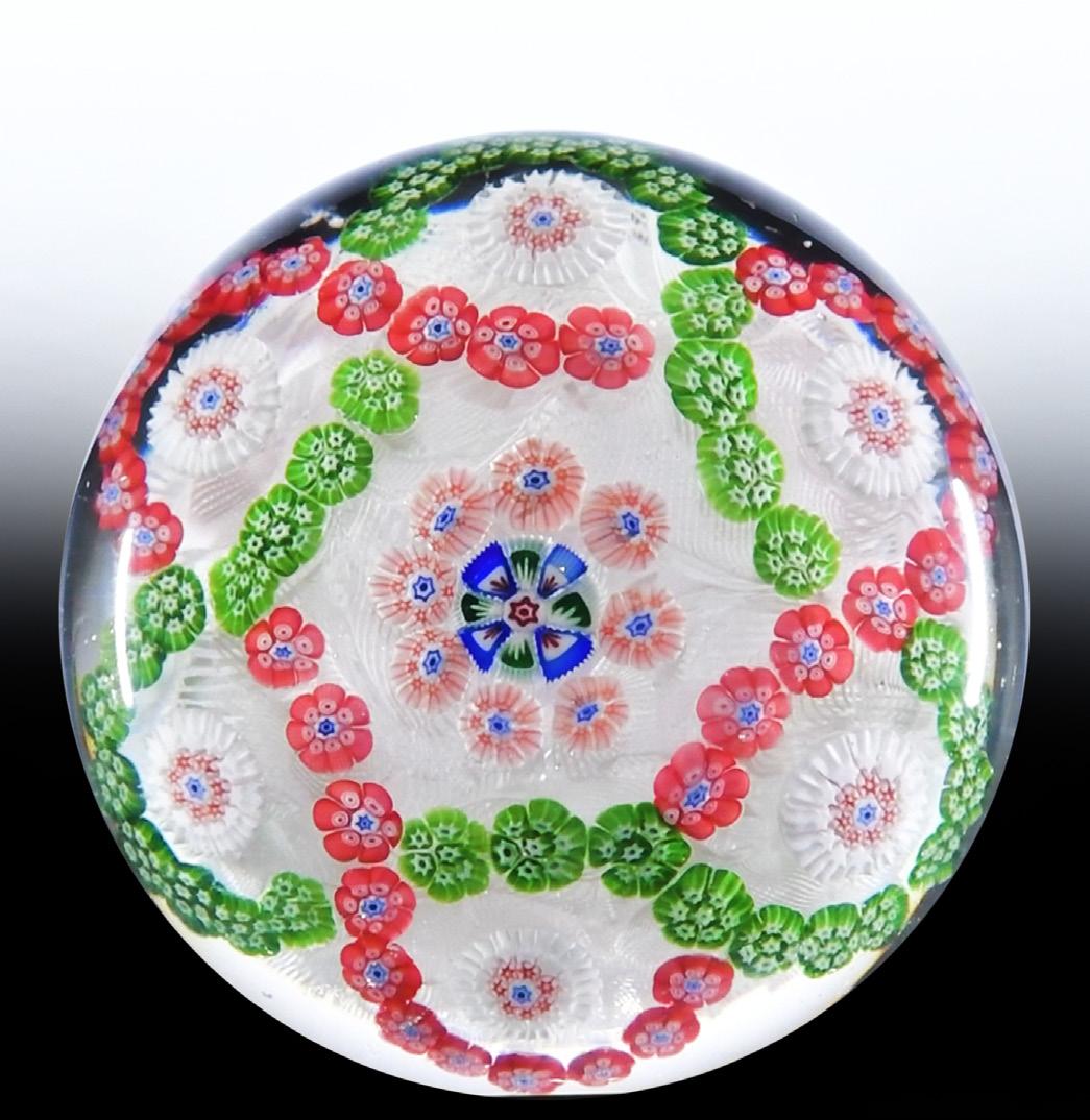 “Whether woven to celebrate love, victory or merely beauty, the millefiori garlands found in patterned spacing schemes are among the most graceful and delicate ornaments found in paperweights.” —Paperweights for Collectors . Previously sold in the L.H. Selman Ltd. Fall 2011 49th Auction as lot 15.