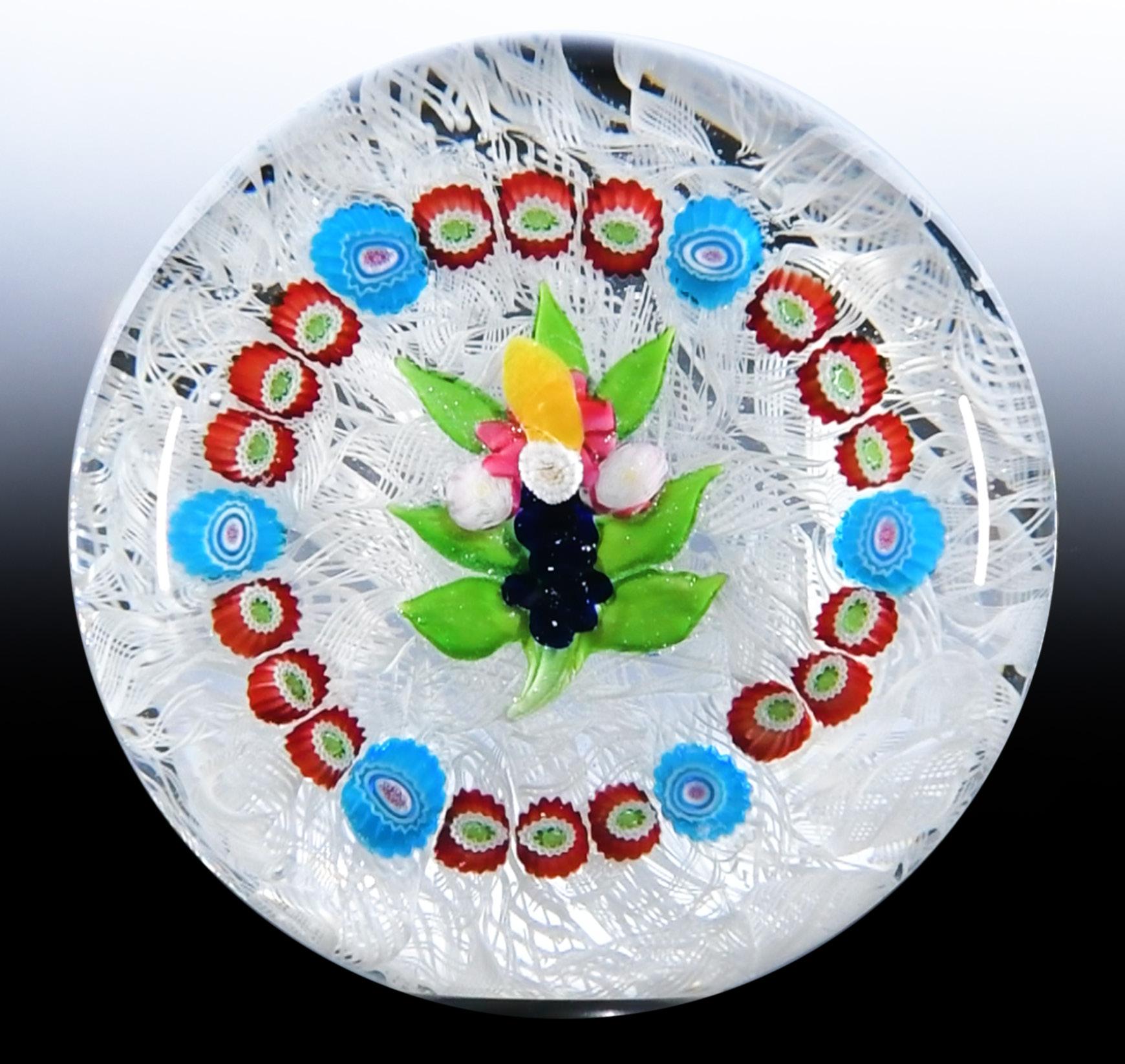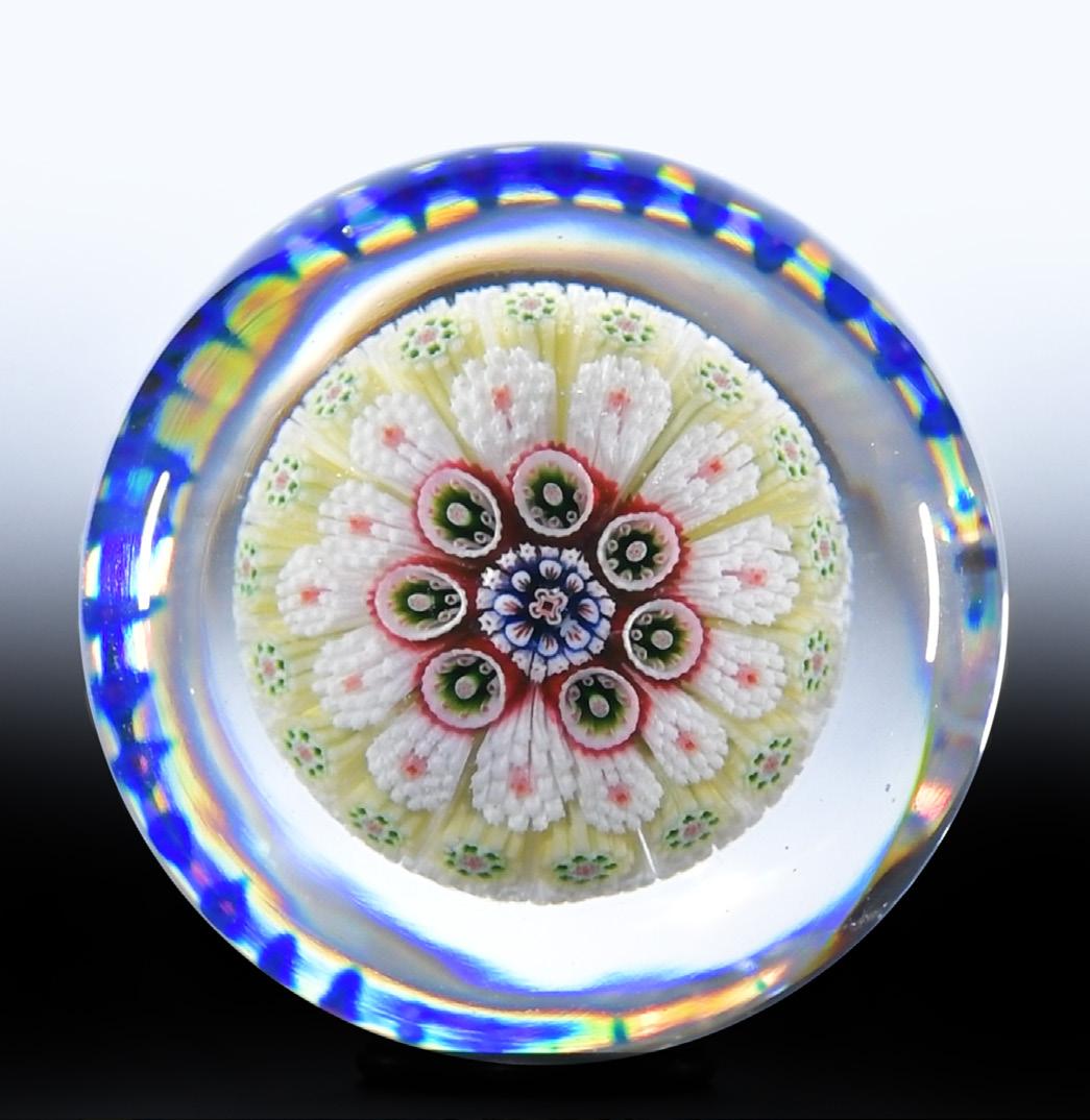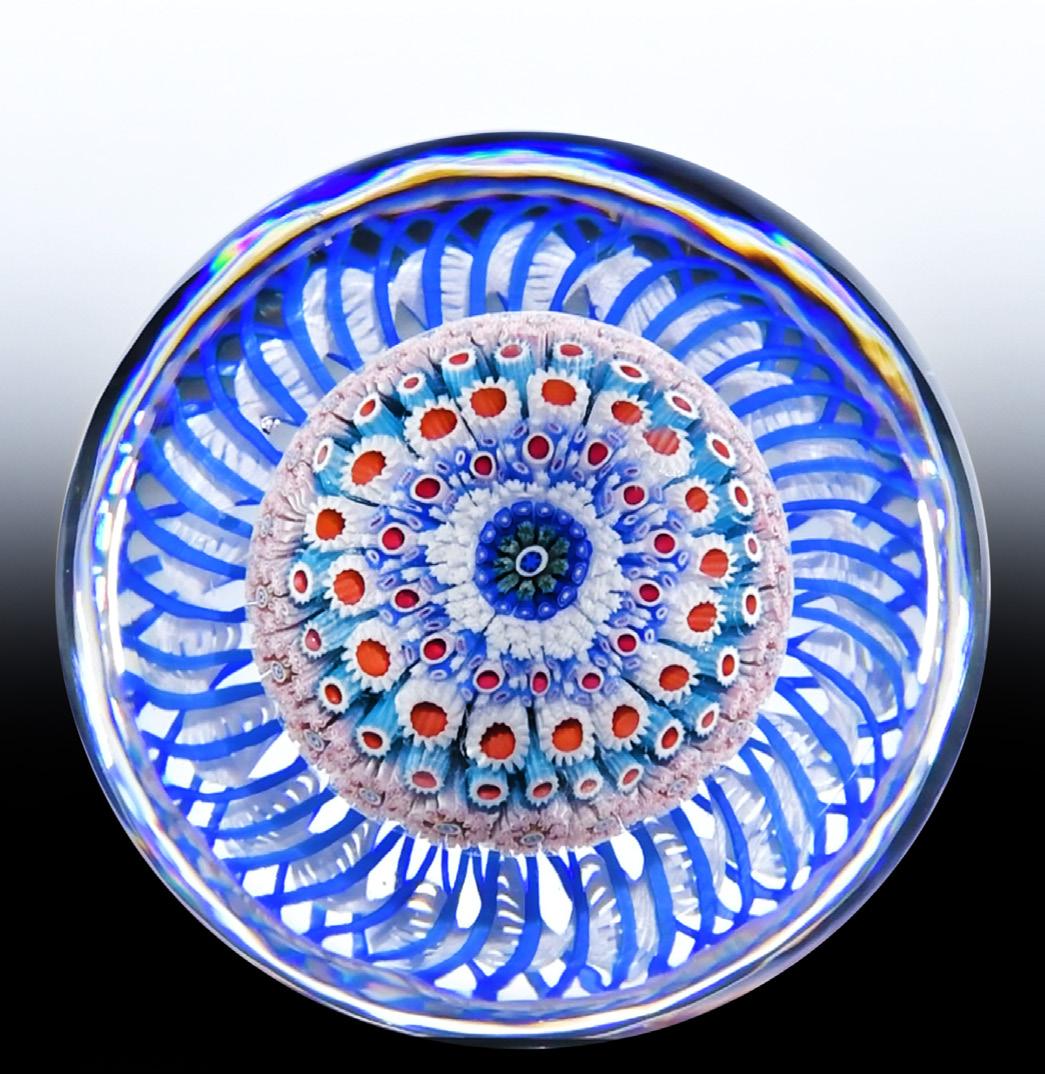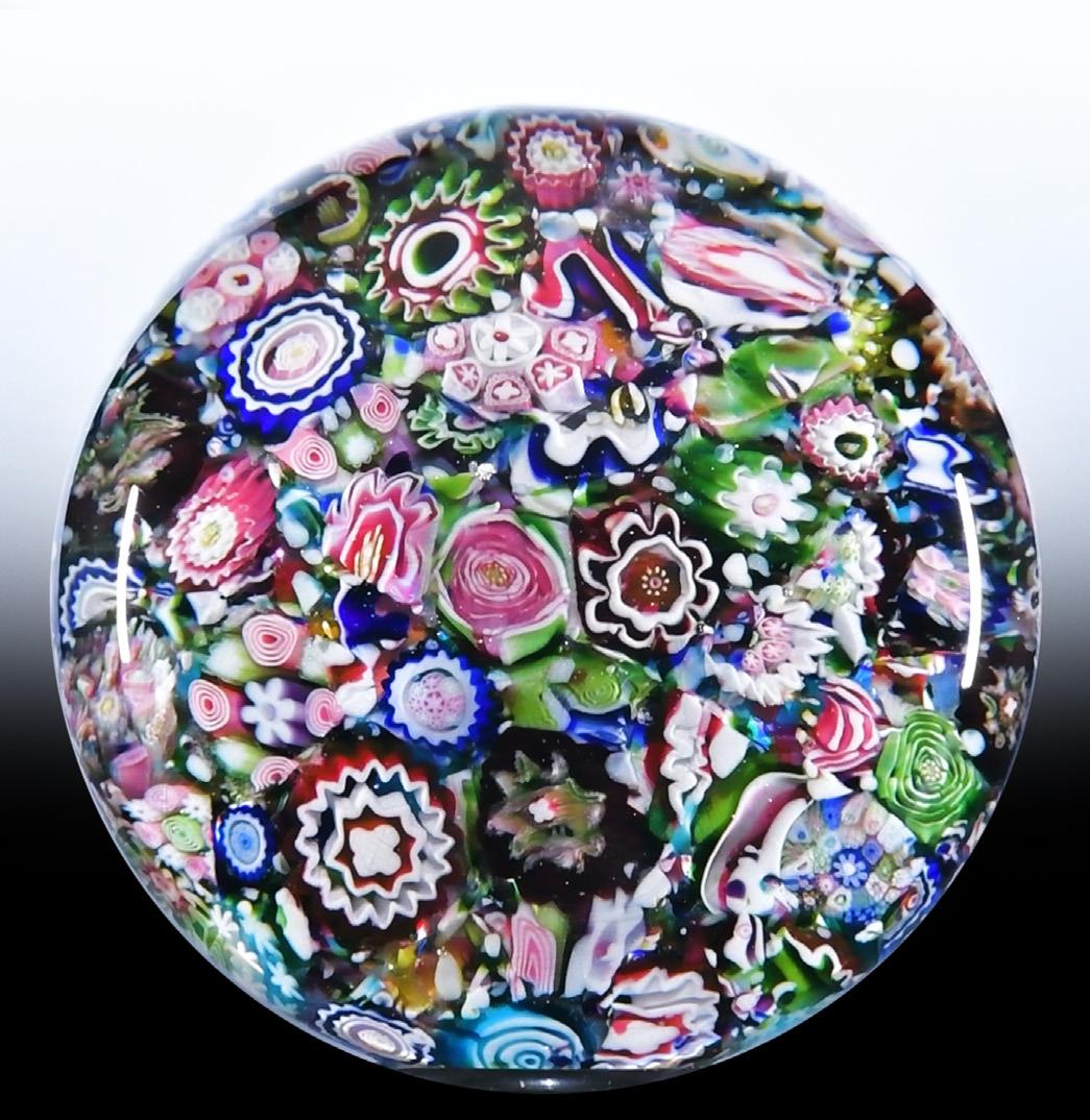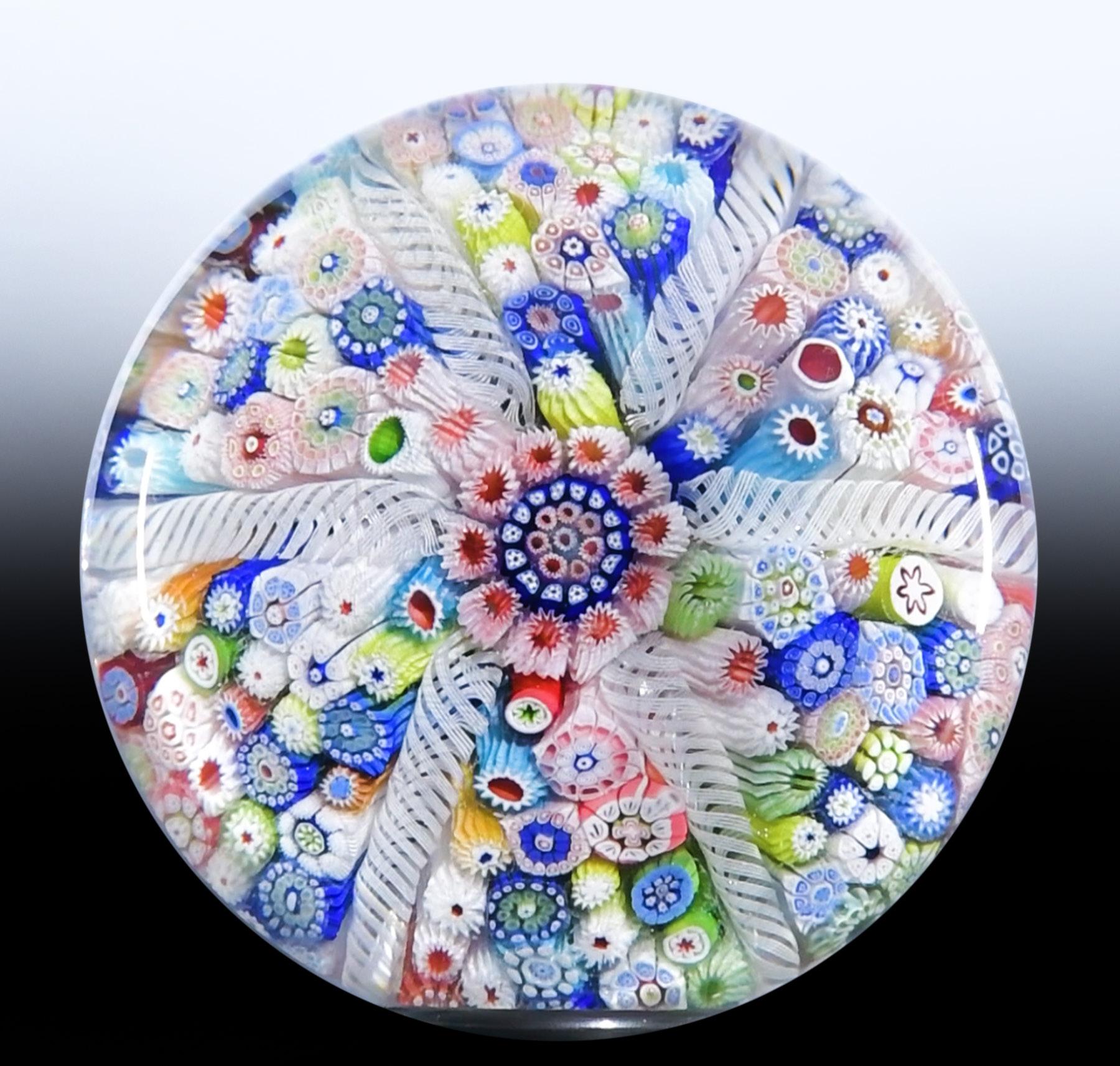 “Whether woven to celebrate love, victory or merely beauty, the millefiori garlands found in patterned spacing schemes are among the most graceful and delicate ornaments found in paperweights.” —Paperweights for Collectors . Previously sold in the L.H. Selman Ltd. Fall 2011 49th Auction as lot 15.