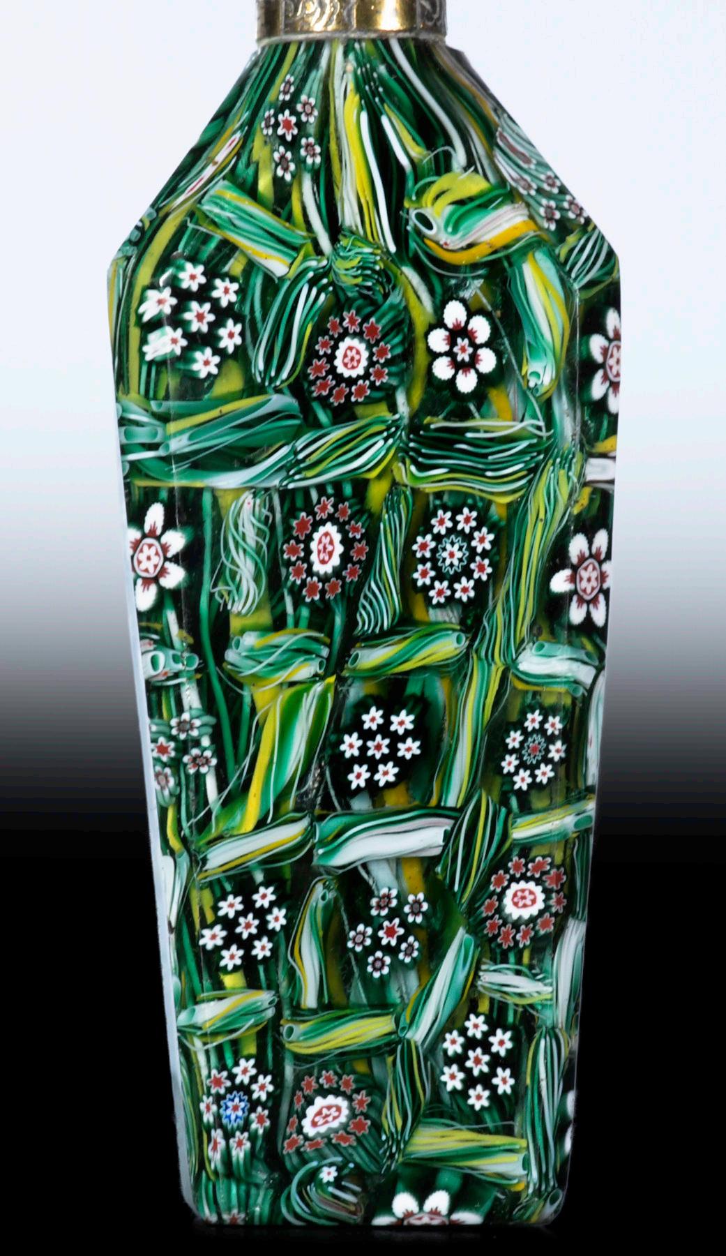 93 Spectacular, fine and extremely rare antique Karlsthal millefiori chequer scent bottle and vermeil stopper. Spaced millefiori, including distinct floret bundle canes and arrowhead flower canes in red, white, blue and green, fill the voids of a chequered pattern of fine green, yellow and white latticinio segments, which is supported by an underlayer of twisted green, yellow and white ribbons. The design extends the entirety of a flared rectangular scent bottle, with concave front and back sides and with a pointed neck leading to a decorated hinged gilded silver, vermeil, stopper. For more information about the Karlsthal glassworks, see Classic Paperweights from Silesia/Bohemia, page 42. Fine condition.