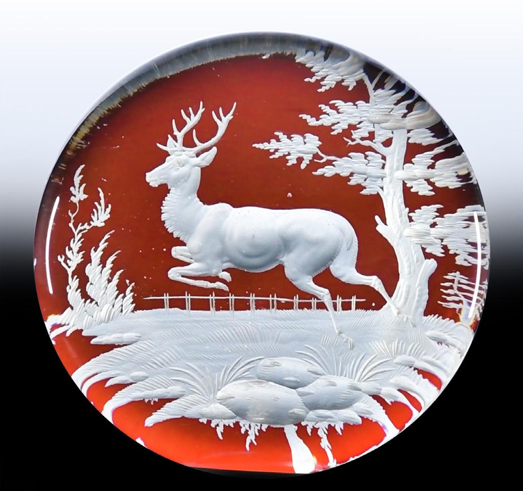 36 Antique Bohemian engraved stags and doe red-stained low-domed paperweight. A pastoral landscape of a grassy clearing with a fence is the playground of a leaping athletic young stag. The engraved scene is captured against a transparent ruby red-stained base.