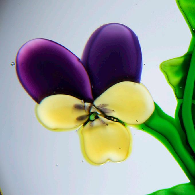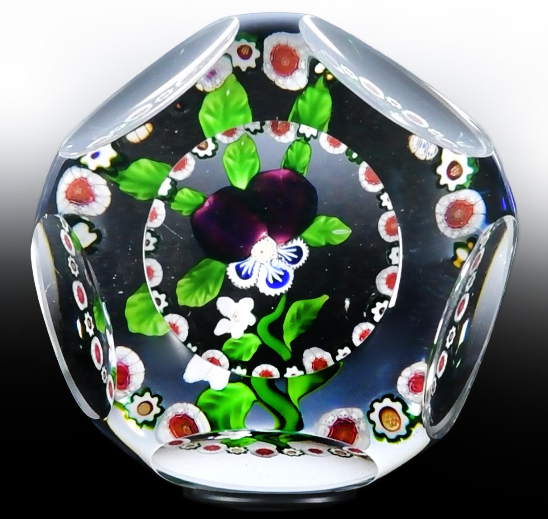 32 Very rare antique Baccarat commemorative enameled pansy and flower bouquet engraved faceted paperweight. A pansy bouquet is acid-etched and enameled with delightful colors on the base of a clear crystal dome, which has been not only faceted with six and one facets but also engraved with “Tour Eiffel 12 Aout 1889" and the initials “F.A.”. “...there are a few very rare weights from Baccarat which were etched with a bouquet on the base, then enameled.” —Baccarat Paperweights: Two Centuries of Beauty, page 119. Good condition. Diameter 3 1/4"