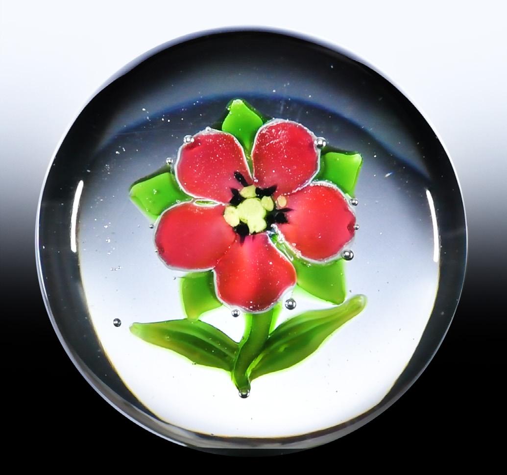 10 Very rare antique Clichy white and red convolvulus flower paperweight. An undulated trumpet-shaped white convolvulus flower has a magenta rim and a thin curved green stem from which a single shaded-green leaf sprouts. Derived from the Latin convolvere, to roll together or roll up, the convolvulus is an interchangeable term for morning glory. There are twenty-three documented examples of this type of design by Clichy. Fine condition. Diameter 2 15/16" $12,000—15,000