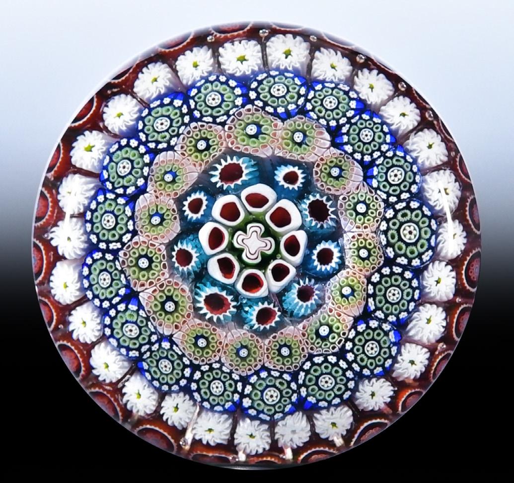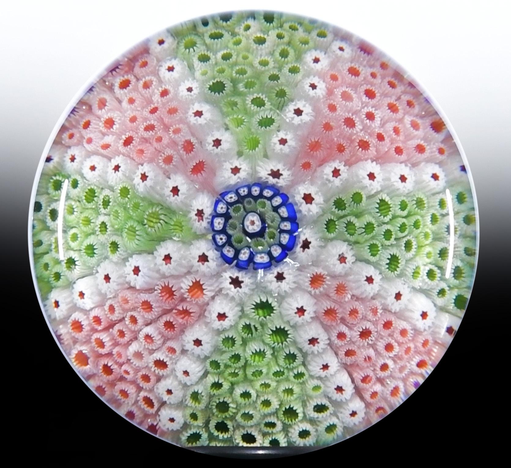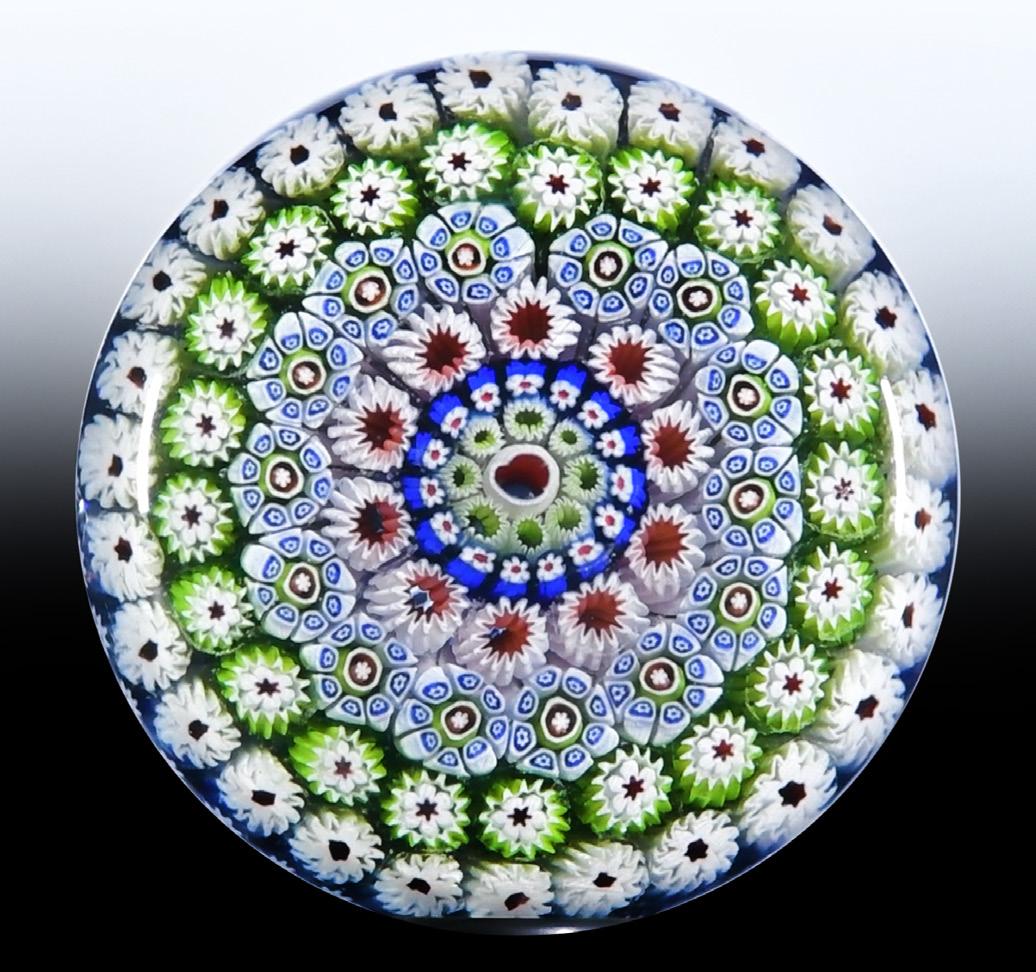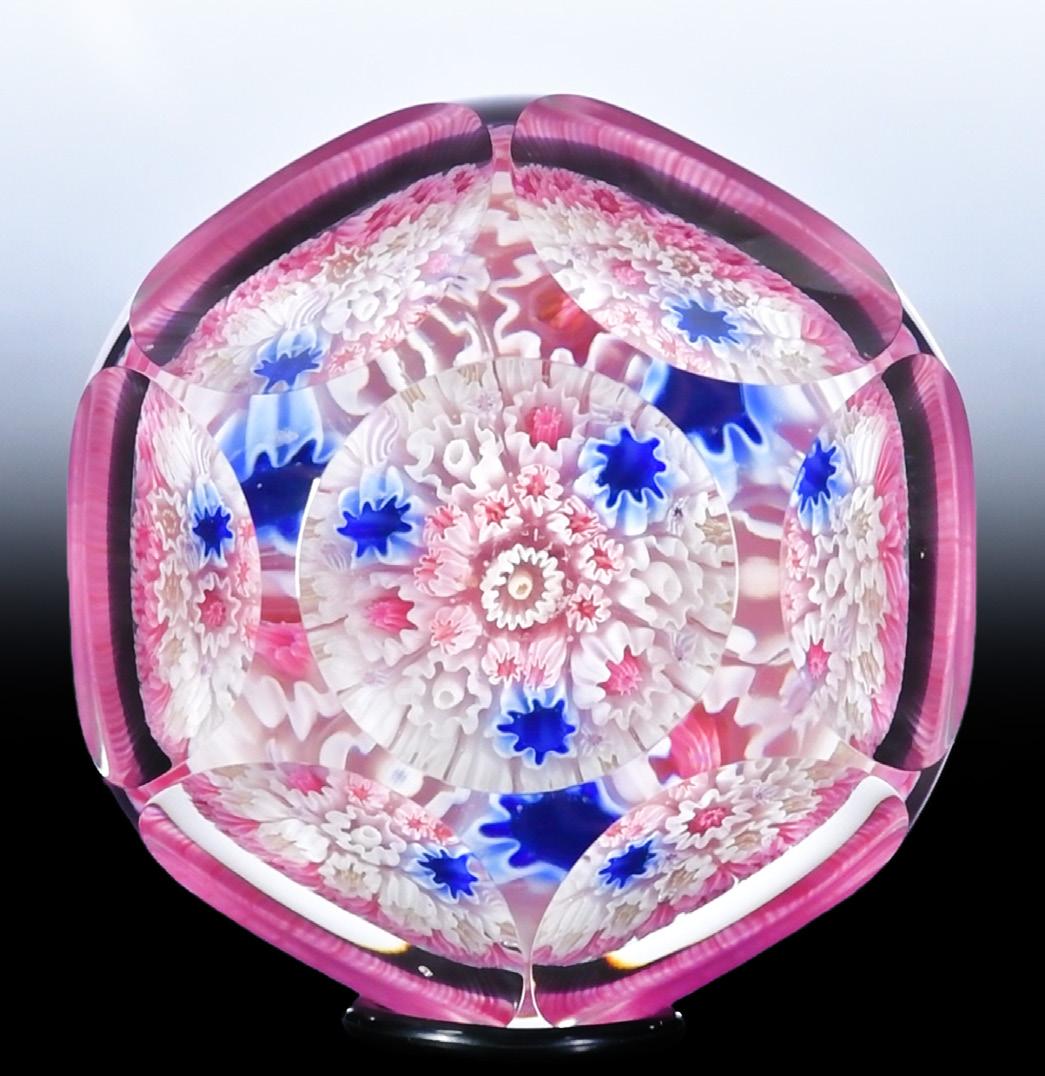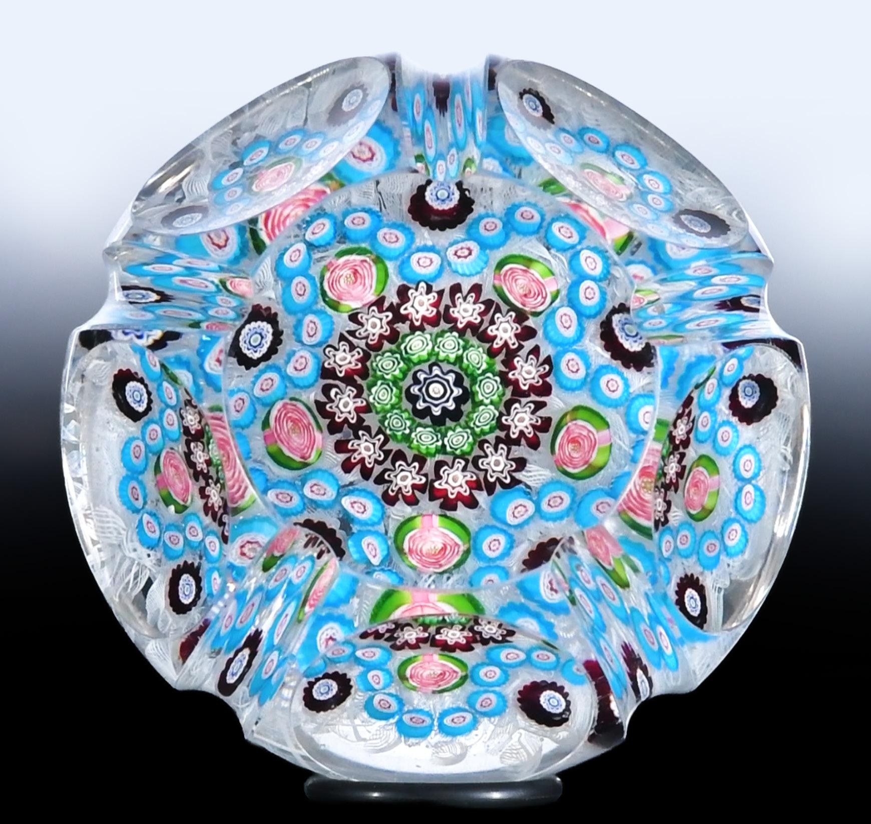 7 Extremely rare antique Saint Louis Maltese Cross eight-paneled millefiori carpet ground paperweight. A large blue, green and white complex cane, made of tubes, cogs and florets, centers eight white cog canes, with red six-point star centers, each of which is the start of radial rows of the same cane, dividing eight panels filled with a thick carpet of hollow cog canes, alternating between pink and green. One of only two known examples, its twin sold in Sotheby’s February 1980 auction as lot 159A for the then remarkable sum of 5,000 pounds sterling, the price of a substantial London home at the time. Previously sold in the L.H. Selman Ltd. Fall 2014 58th Auction as lot 6. Fine condition.