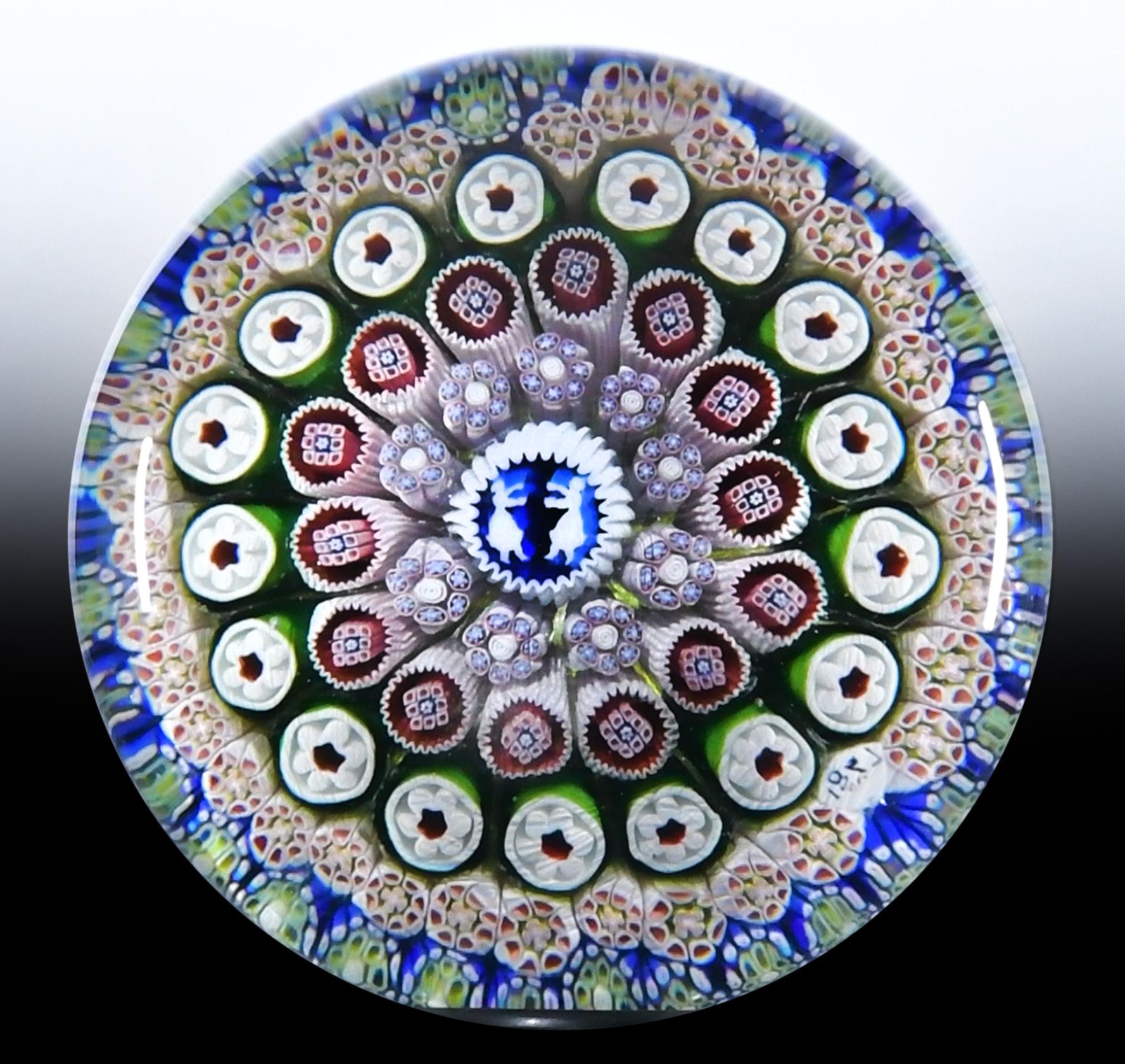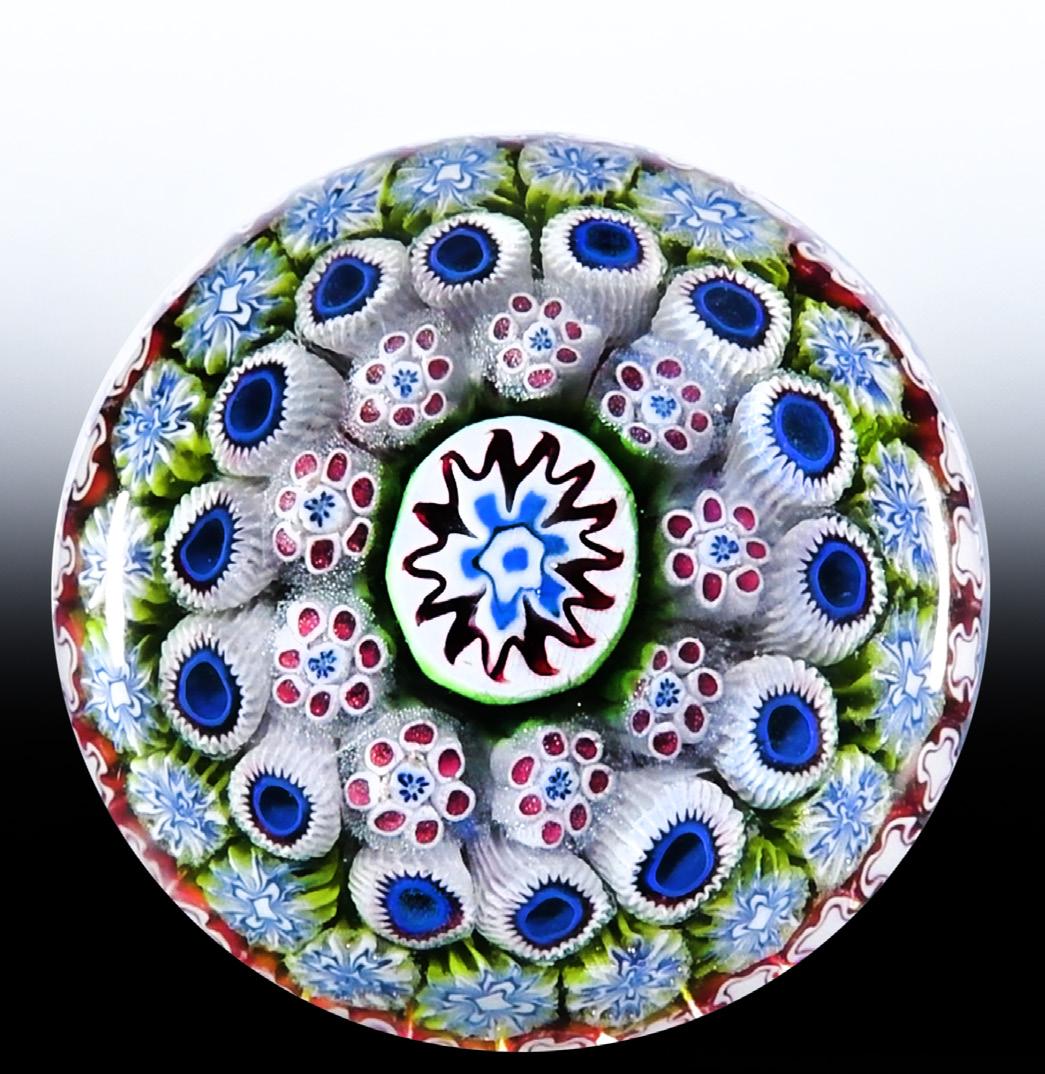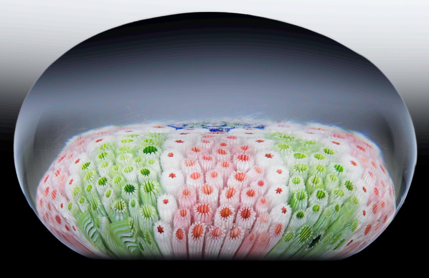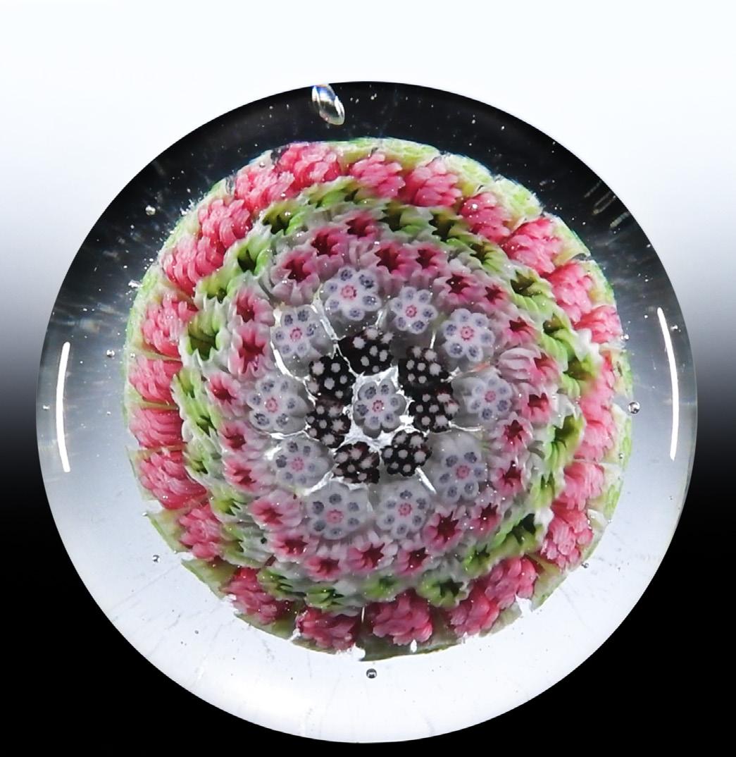 7 Extremely rare antique Saint Louis Maltese Cross eight-paneled millefiori carpet ground paperweight. A large blue, green and white complex cane, made of tubes, cogs and florets, centers eight white cog canes, with red six-point star centers, each of which is the start of radial rows of the same cane, dividing eight panels filled with a thick carpet of hollow cog canes, alternating between pink and green. One of only two known examples, its twin sold in Sotheby’s February 1980 auction as lot 159A for the then remarkable sum of 5,000 pounds sterling, the price of a substantial London home at the time. Previously sold in the L.H. Selman Ltd. Fall 2014 58th Auction as lot 6. Fine condition.