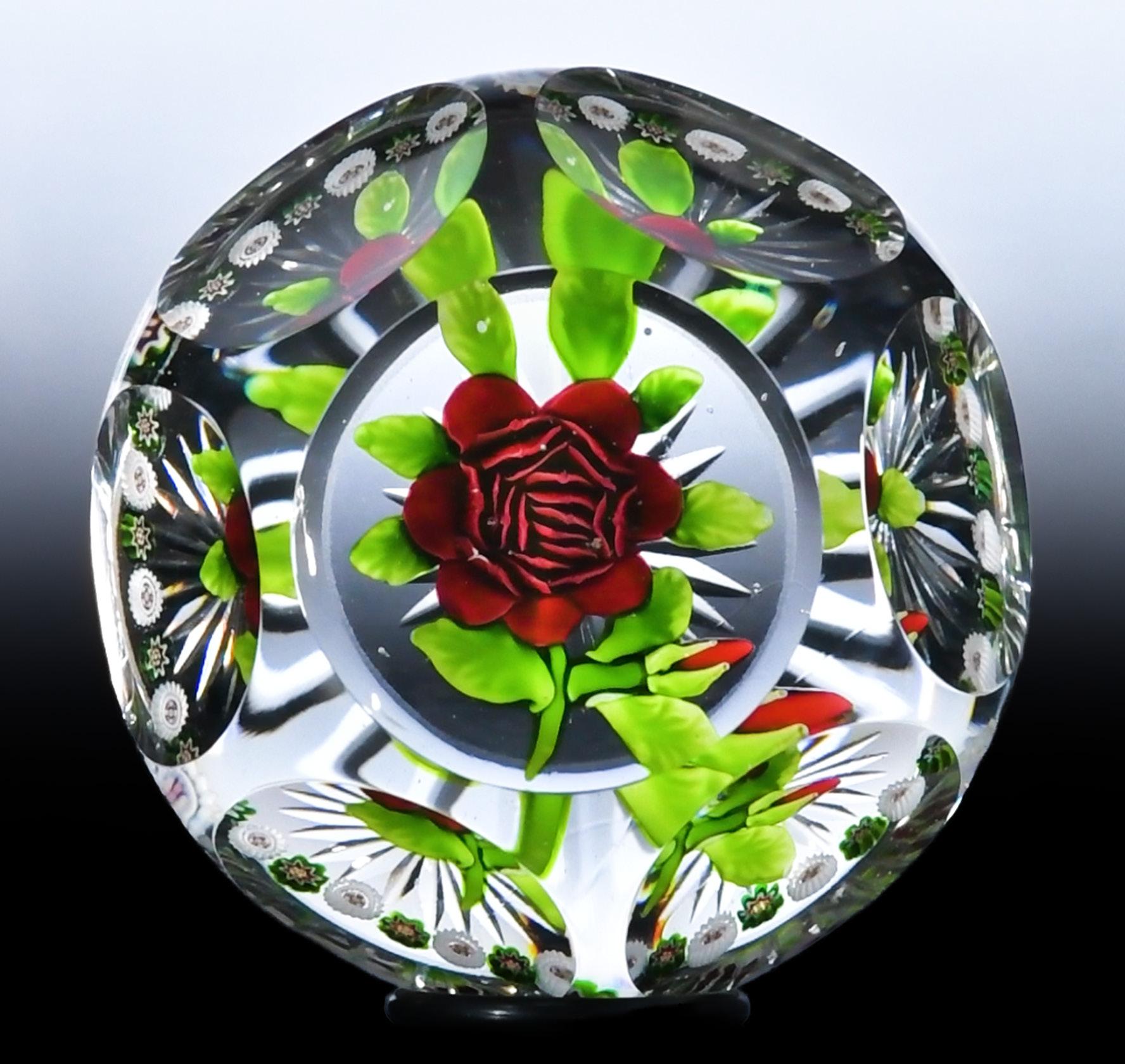 16 Very rare antique Baccarat “thousand petal” rose and millefiori garland faceted paperweight. A deep red “thousand petal” rose sits atop a short pert stem flanked by a single leaf on one side and a two-leafed sprig with a bud on the other. Six spaced leaves crown the bloom. A millefiori garland of alternating green and white canes borders the design. The rose is very rarely seen with such a garland. Star-cut clear ground. Six and one facets. Excellent condition.
